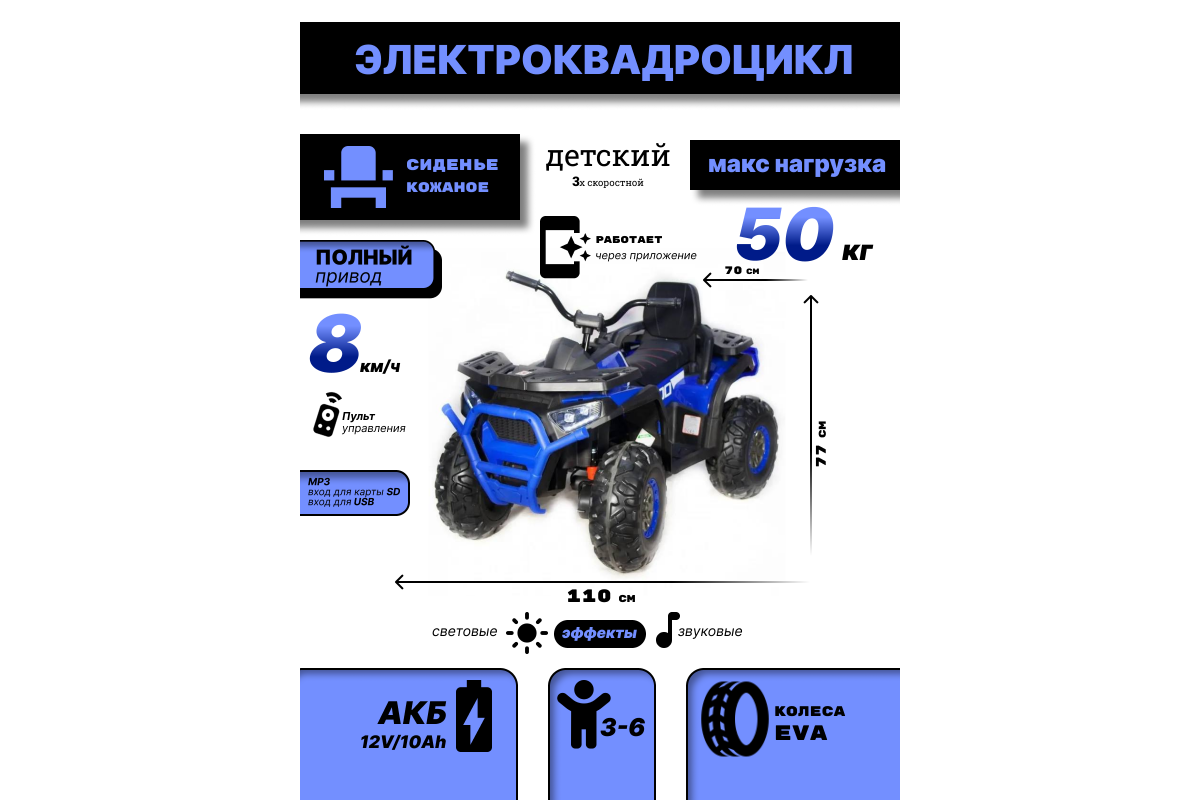 Квадроцикл Qwatro 4х4 ХМХ607 - это детский электромобиль, который предназначен для детей от 3 до 6 лет. Он оснащен большими колесами EVA, что обеспечивает плавный и мягкий ход. Максимальная нагрузка составляет 50 кг, что позволяет использовать его для детей разного возраста.