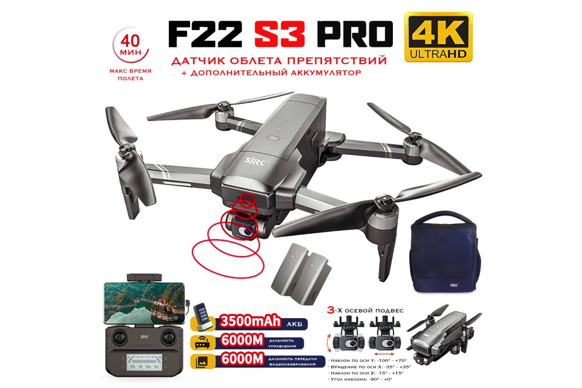 Квадрокоптер SJRC F22 S3 PRO+ 2 АКБ OAS 3-AXIS 4K EIS 5G GPS - F22 S3 PRO+ COMBO - это обновленная версия, которая получила новейшую Ultra HD (4k) камеру с передачей видео до 6000 м, которая установлена на 3-х осевом подвесе. За счет этого видео будет плавным, без рывков и отклонений. Дальностью полета теперь увеличена до 6000 м. Удобный складной форм-фактор позволит удобно перевозить и хранить коптер. Время полета до 80 минут за счет 2 аккумуляторов, которые идут в комплекте.
