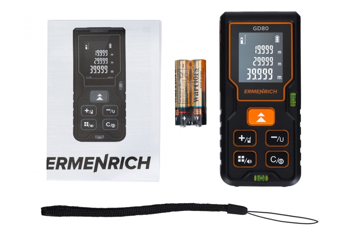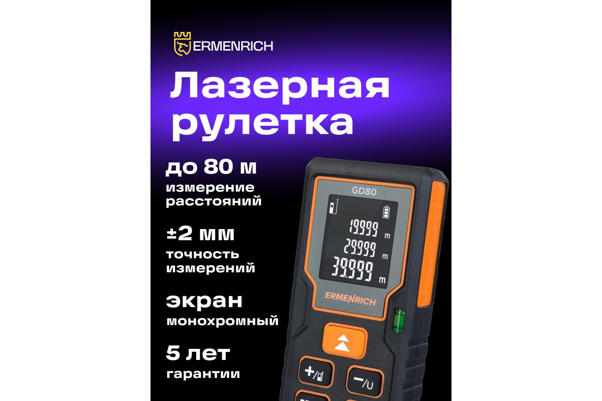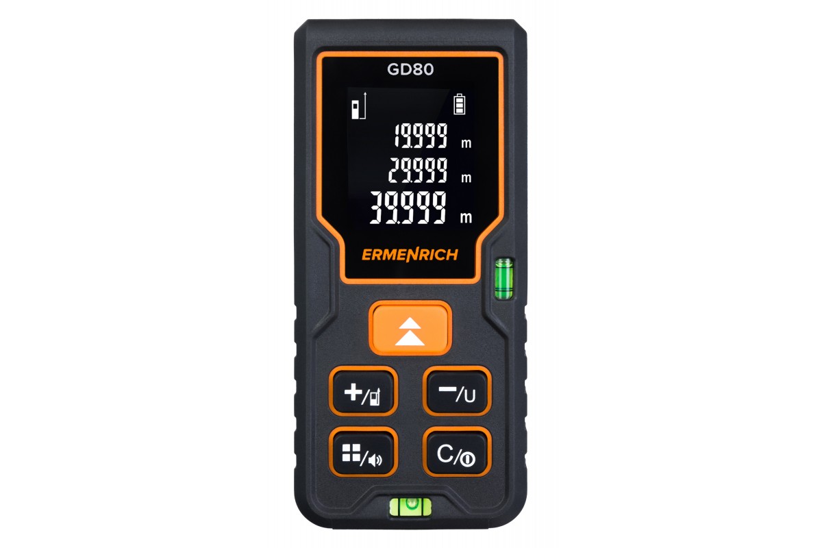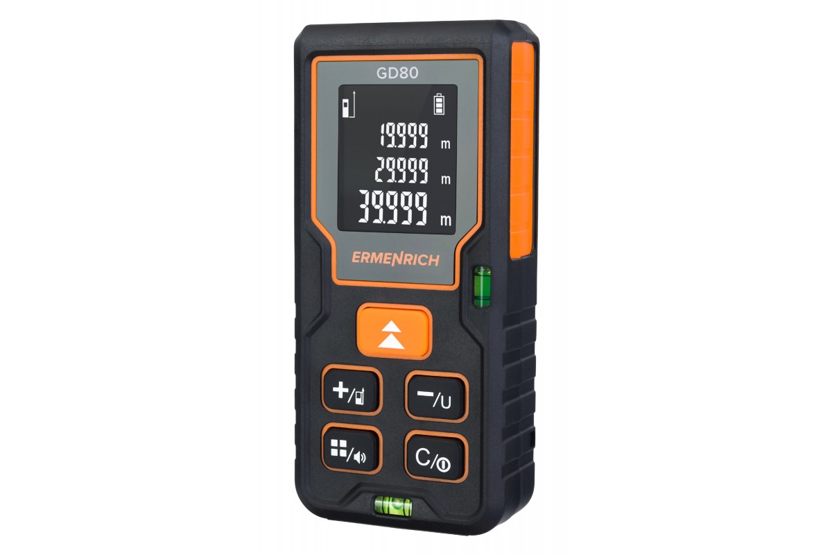 Лазерная рулетка Ermenrich Reel PLUS GD80 предназначена для применения в промышленности, строительстве и ремонте, но станет хорошим подспорьем и для домашнего мастера. С помощью этого удобного прибора можно измерять длины любых объектов, а также площади и объемы помещений. Расстояние между двумя точками, в одну из которых невозможно поместить устройство, также может быть автоматически определено путем промежуточных замеров (функция «Пифагор»). Присутствует возможность работы без звуковых оповещений.