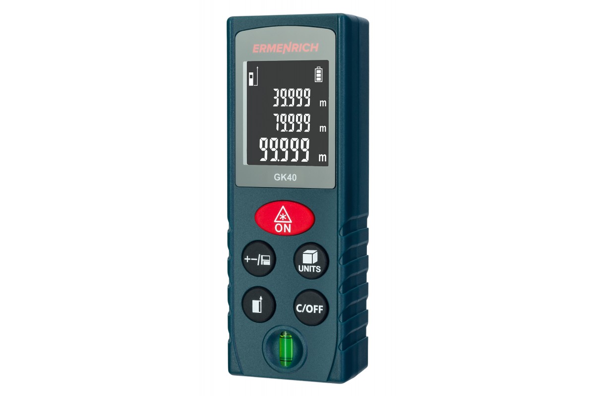 Лазерная рулетка Ermenrich Reel PLUS GK40 позволяет делать точные замеры расстояний, площади и объема в ручном или автоматическом режиме. Функция «Пифагор» позволяет определять расстояние до нужной точки даже в сложных условиях, используя данные промежуточных измерений. Диапазон работы – от 0,05 до 40 метров, что достаточно для решения большинства строительных и бытовых задач.