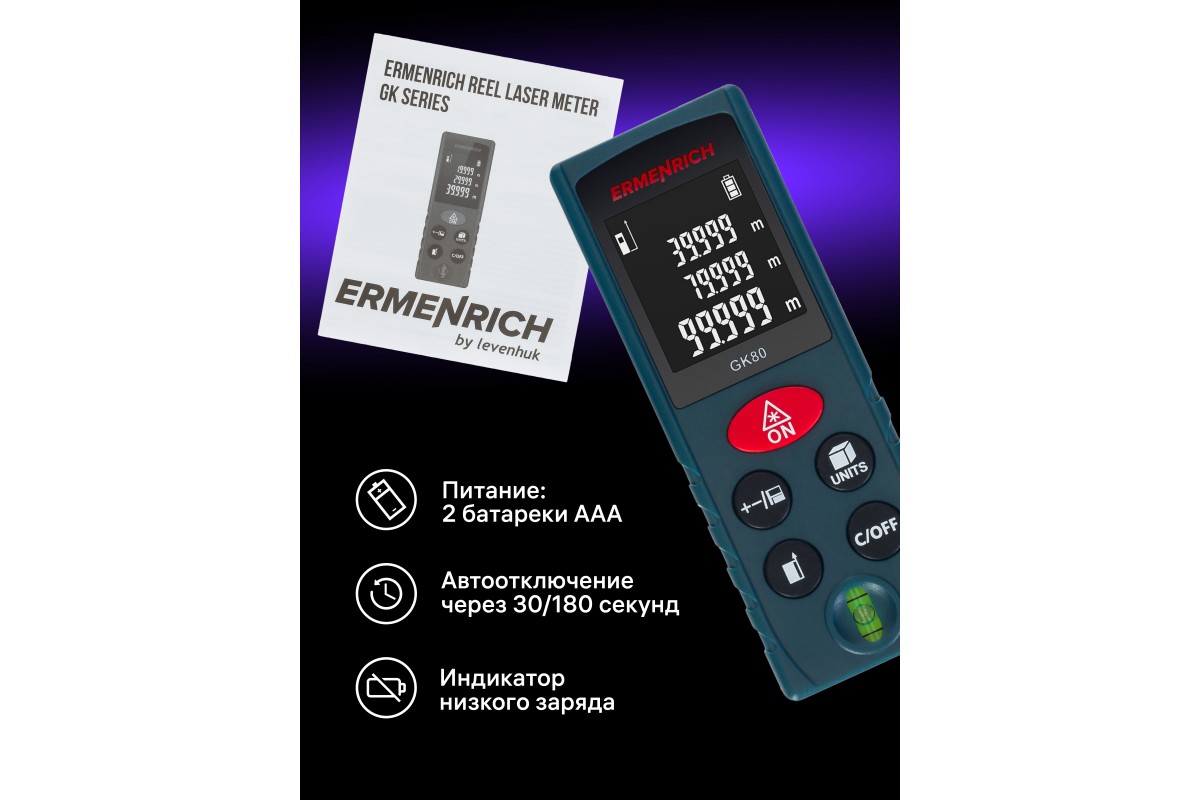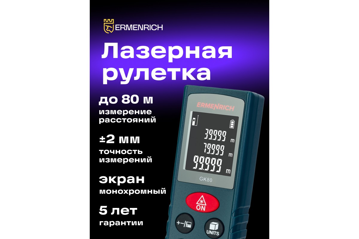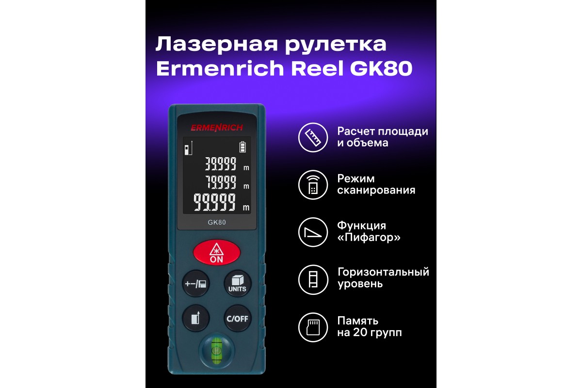 Лазерная рулетка Ermenrich Reel PLUS GK80 – современный инструмент, позволяющий делать точные замеры расстояний, вычислять площадь и объем, а также находить расстояние до труднодоступных точек с помощью функции «Пифагор». Эта функция вычисляет длину нужного отрезка с помощью косвенных измерений.