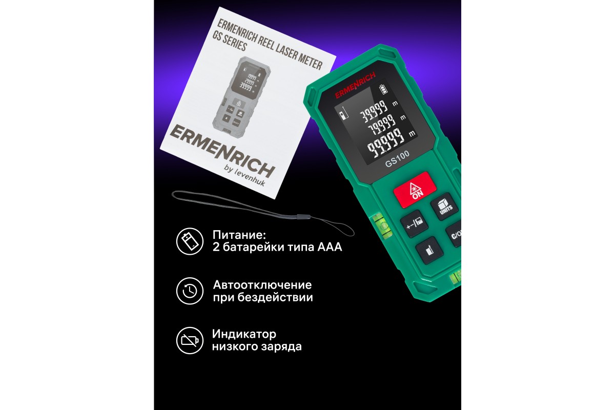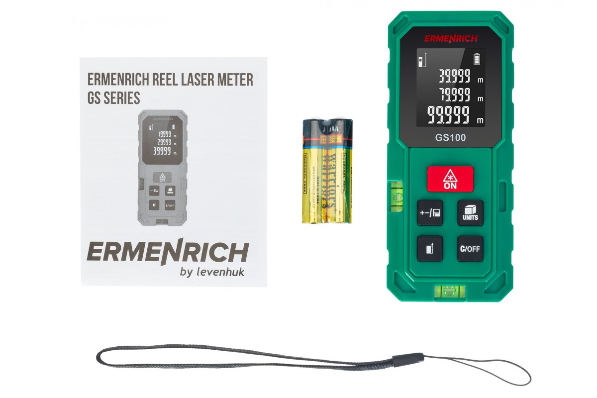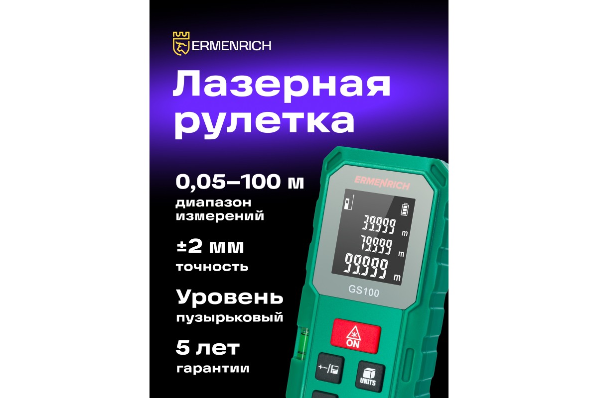 Лазерная рулетка Ermenrich Reel GS100 позволяет проводить точные замеры расстояний в диапазоне от 0,05 до 100 метров, а также определять объем и площадь объектов. Все это помогает в решении самых разных задач во время строительства и ремонта. Функция «Пифагор» также помогает в работе, рассчитывая расстояние, когда нет возможности попасть лазером в нужную точку.