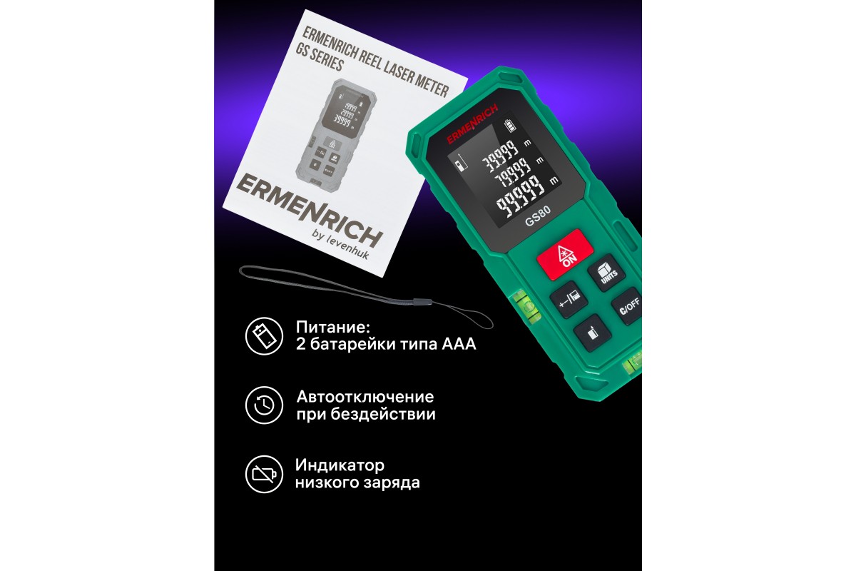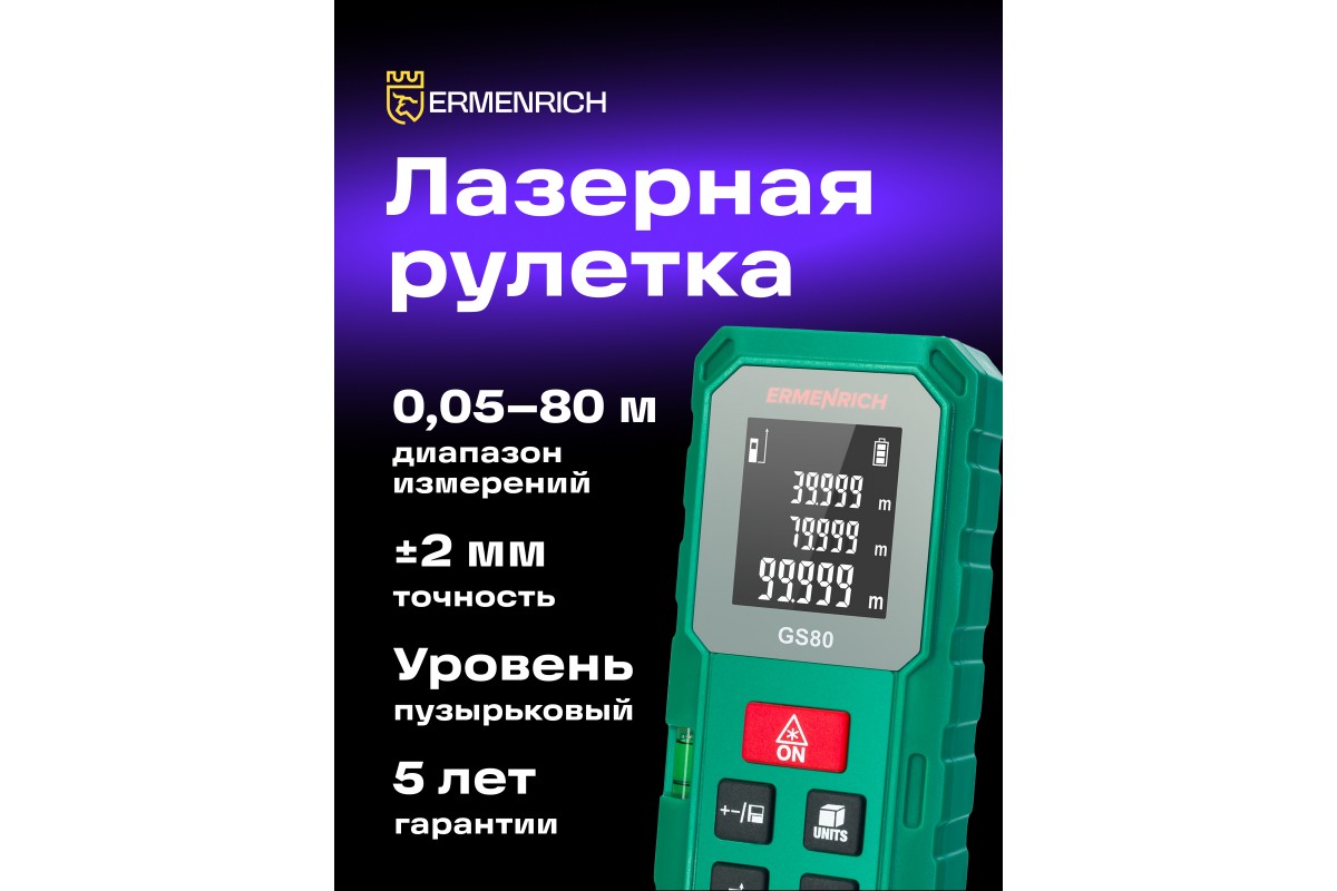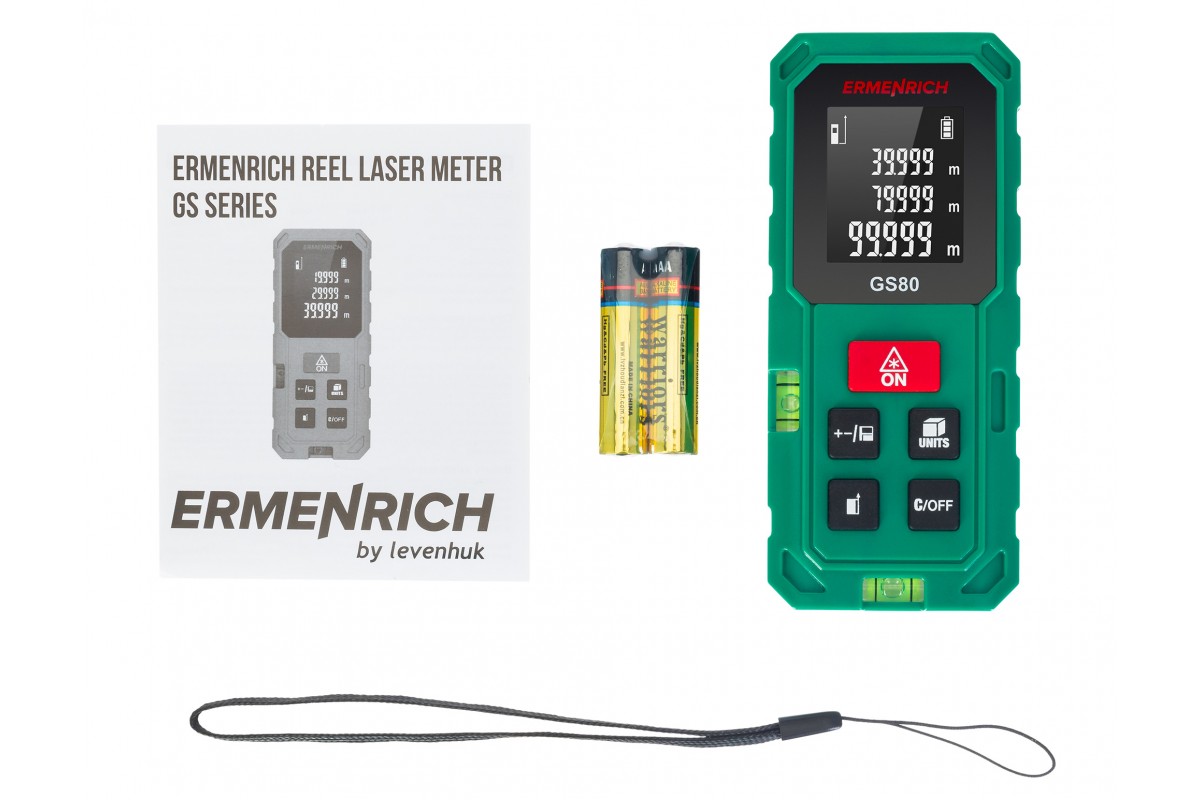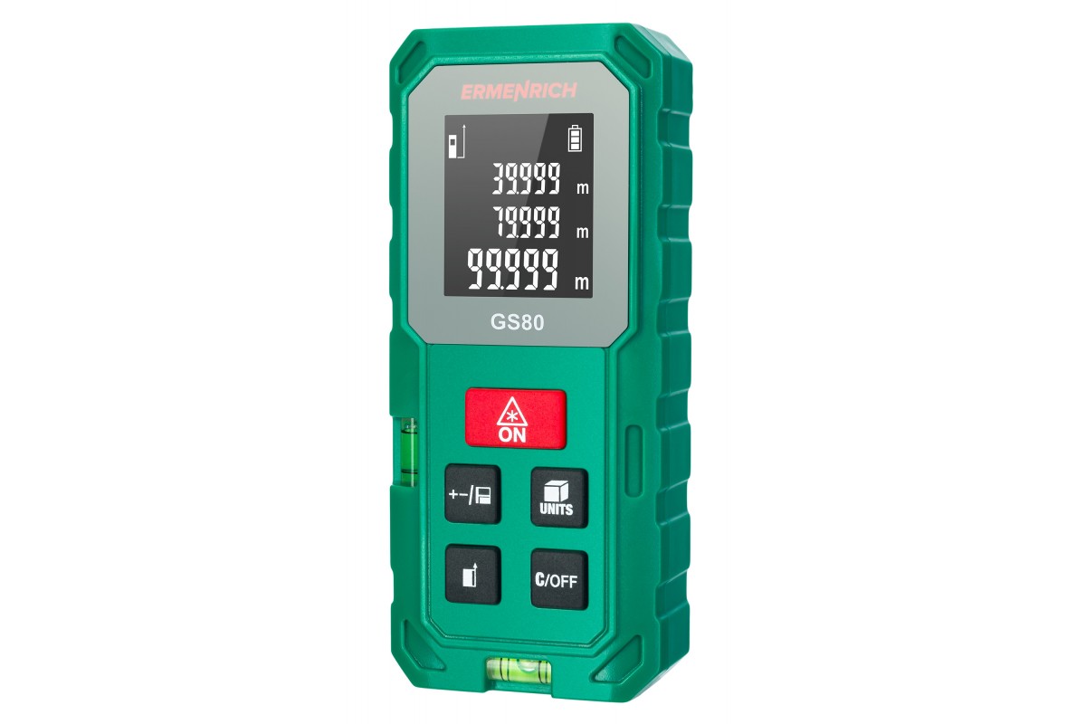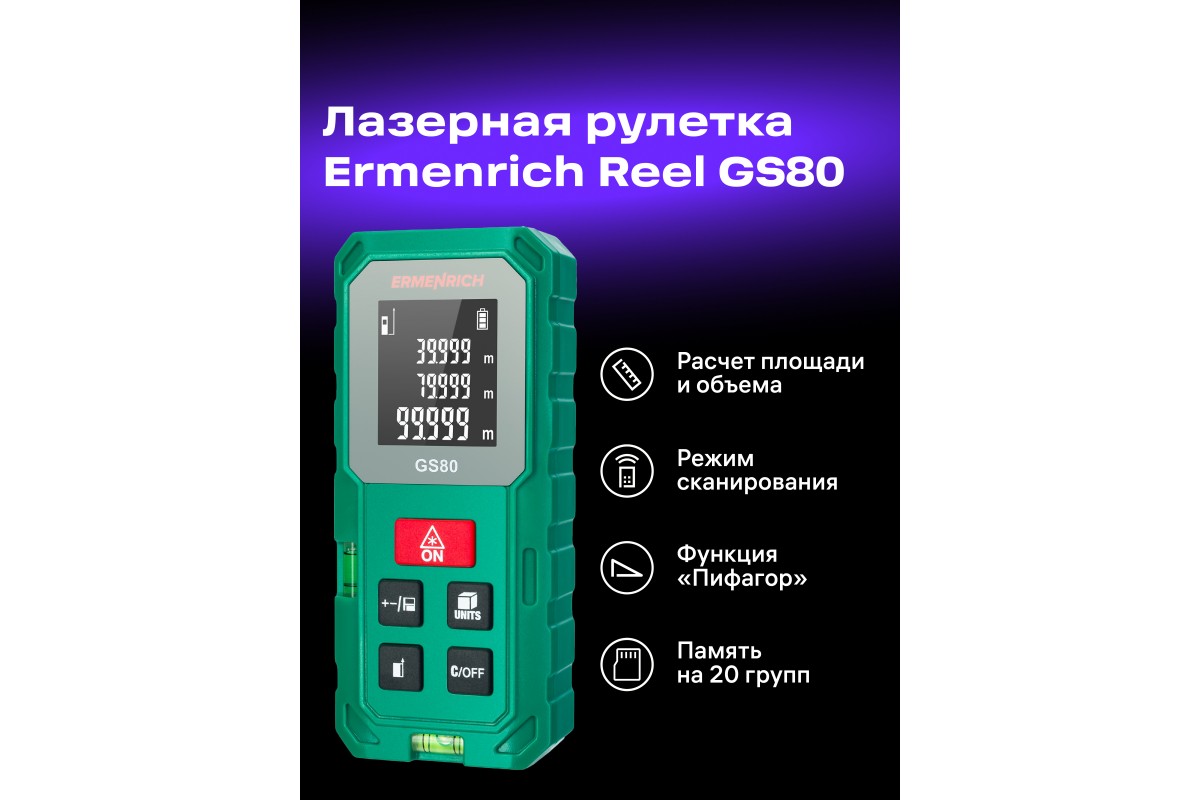 Ermenrich Reel PLUS GS80 – лазерная рулетка для измерения расстояний, определения объема и площади. Инструмент отлично послужит во время ремонта или строительства, пригодится также для межевого и маркшейдерского дела или в решении бытовых задач. Диапазон измерений – от 0,05 до 80 метров. В случае, когда необходимо измерить расстояния в сложных условиях, например, при наличии препятствий или выступов на пути лазера, поможет функция «Пифагор» – достаточно сделать несколько промежуточных замеров, и рулетка вычислит нужное расстояние.