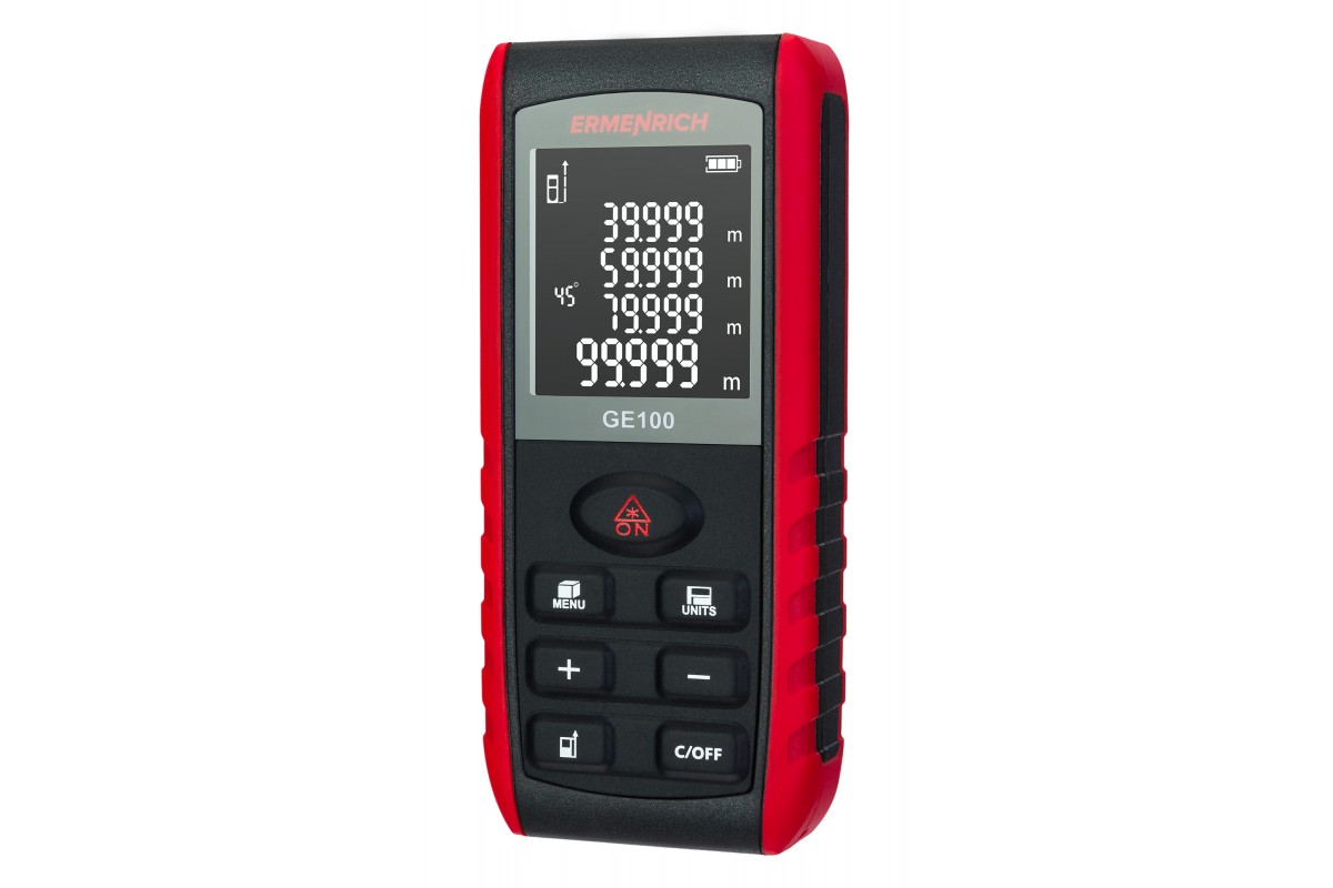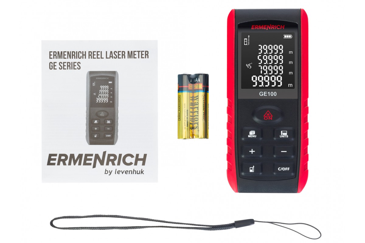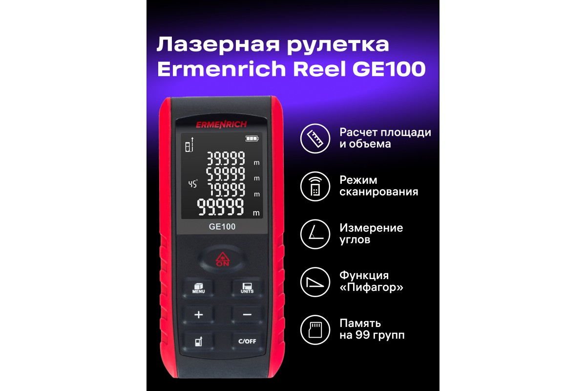 Лазерная рулетка Ermenrich Reel PRO GE100 позволяет не только измерять расстояние в пределах 100 метров, но также точно определять объем, площадь, измерять углы. Эргономичный корпус и удобное кнопочное управление в сочетании с функциональностью делают рулетку хорошим вариантом для инженеров, строителей и специалистов других профессий.