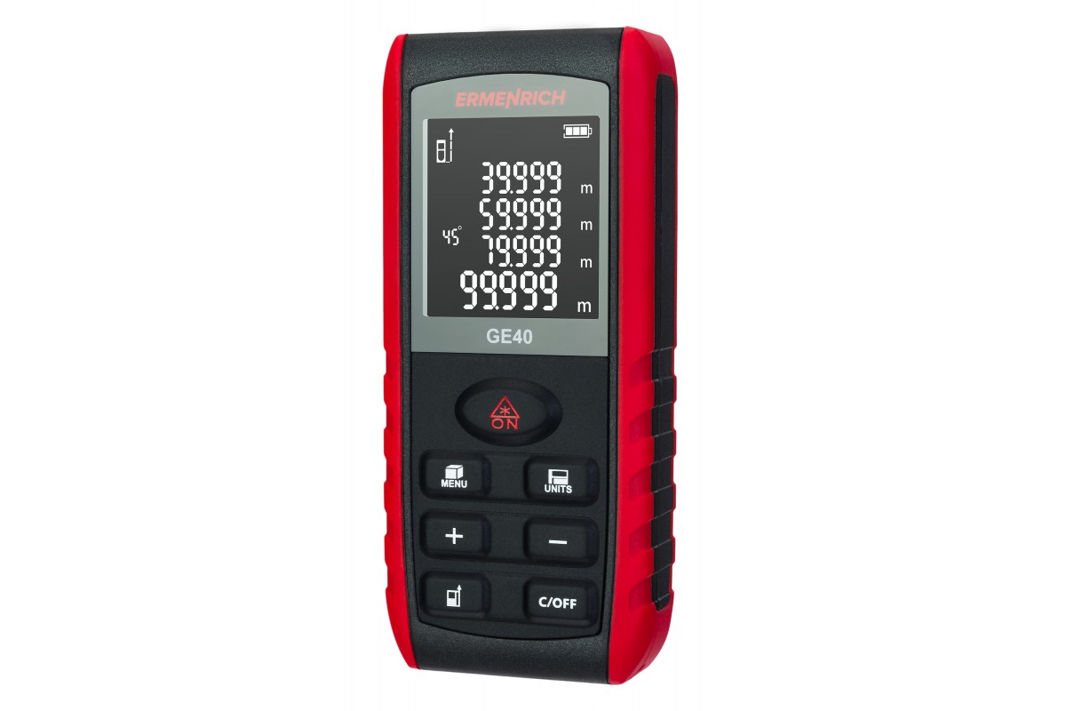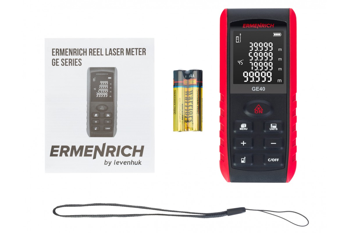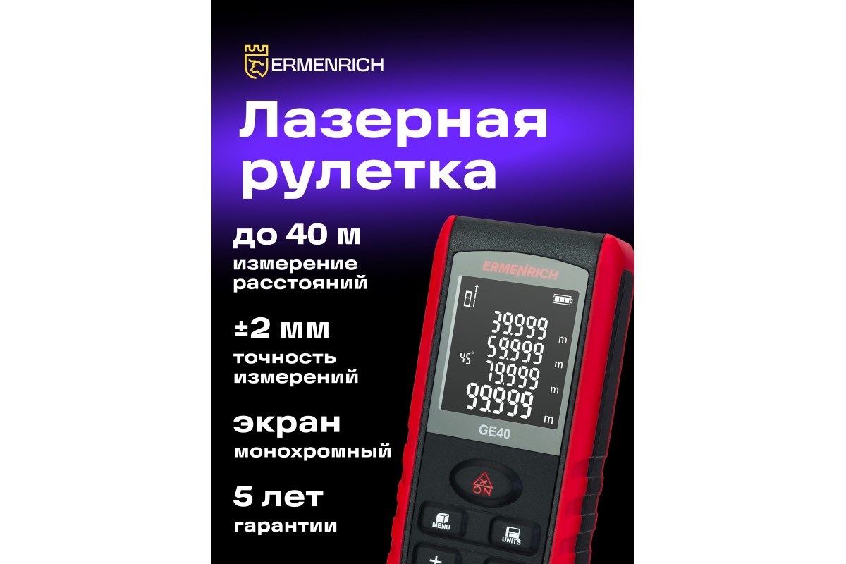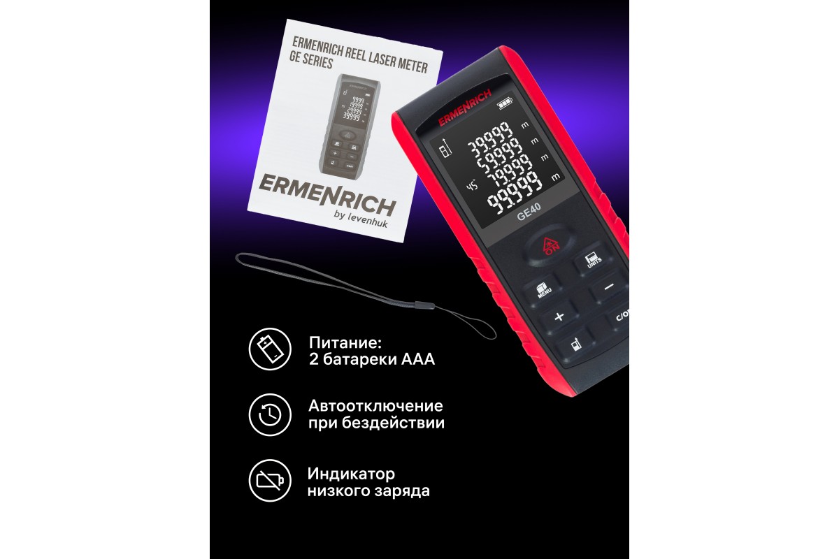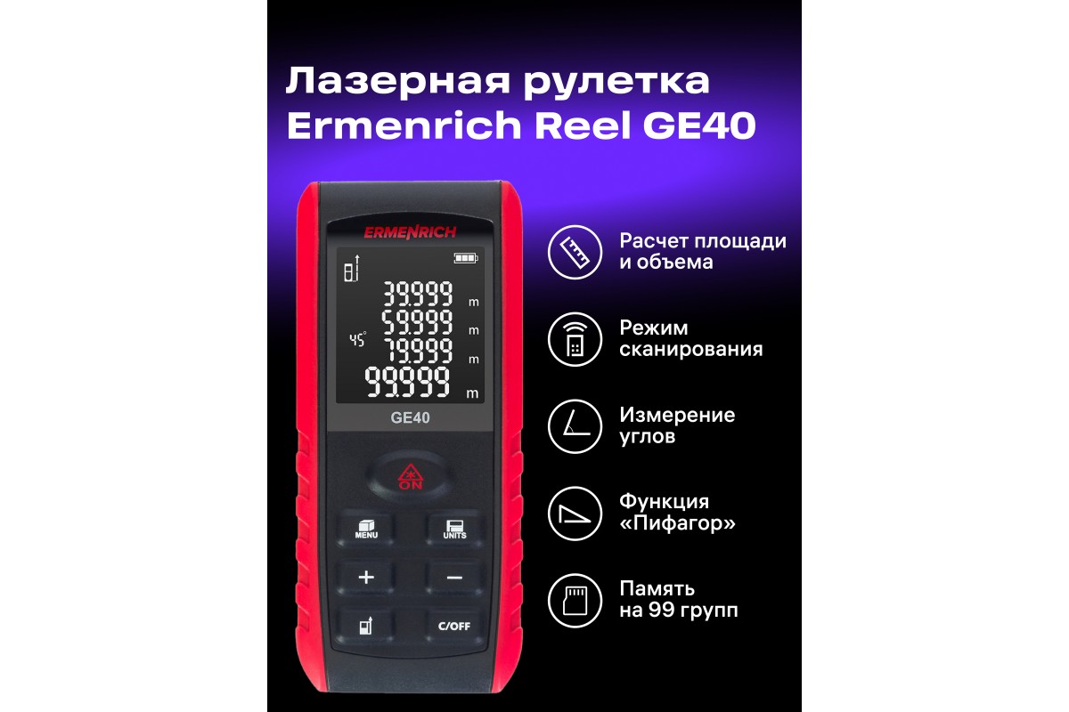 Лазерная рулетка Ermenrich Reel PRO GE40 служит для выполнения самых разных строительных и ремонтных работ, помогая точно измерить длину, углы, площадь и объем. В сложных условиях, когда нет возможности разместить прибор в нужной точке, будет незаменима функция «Пифагор», которая делает расчеты на основе промежуточных измерений.