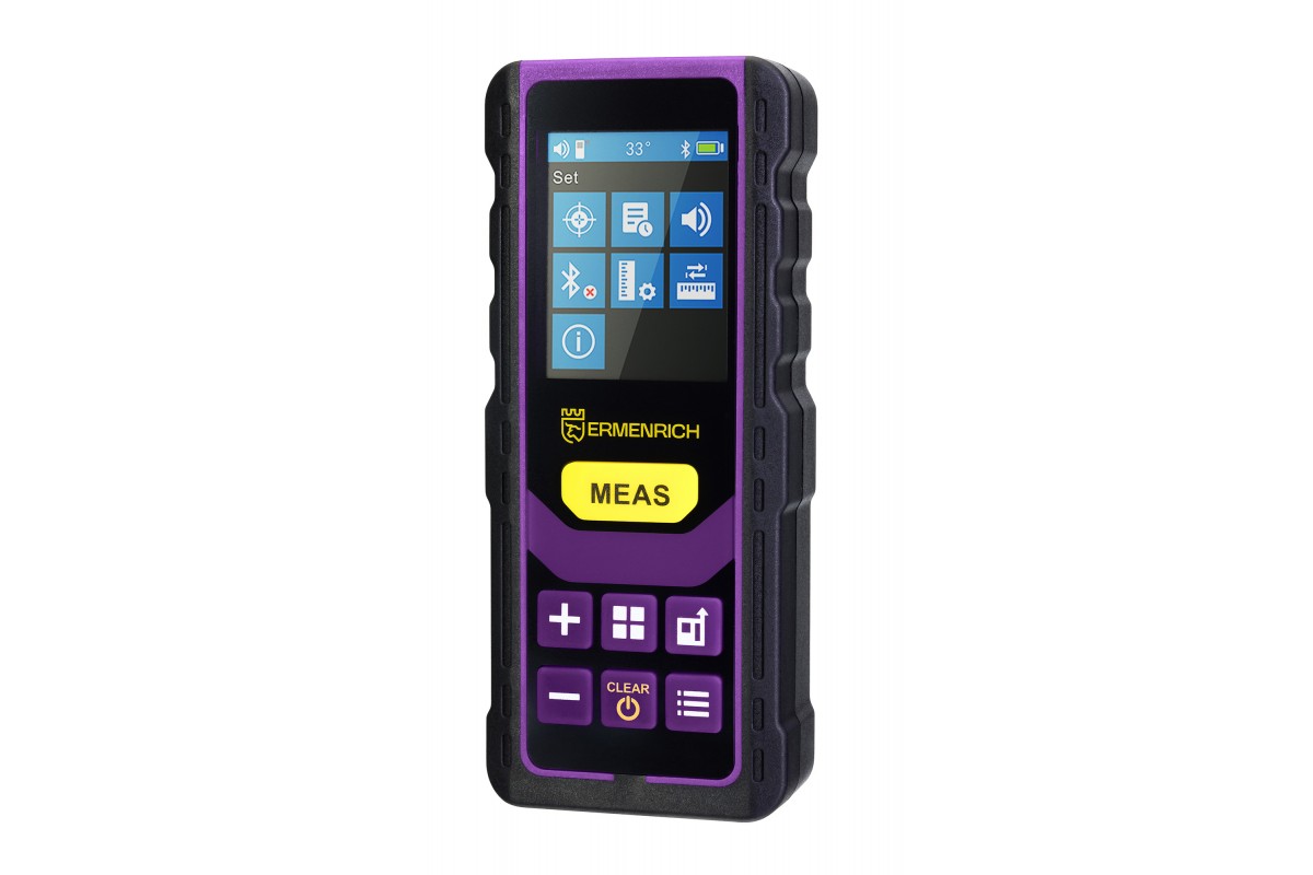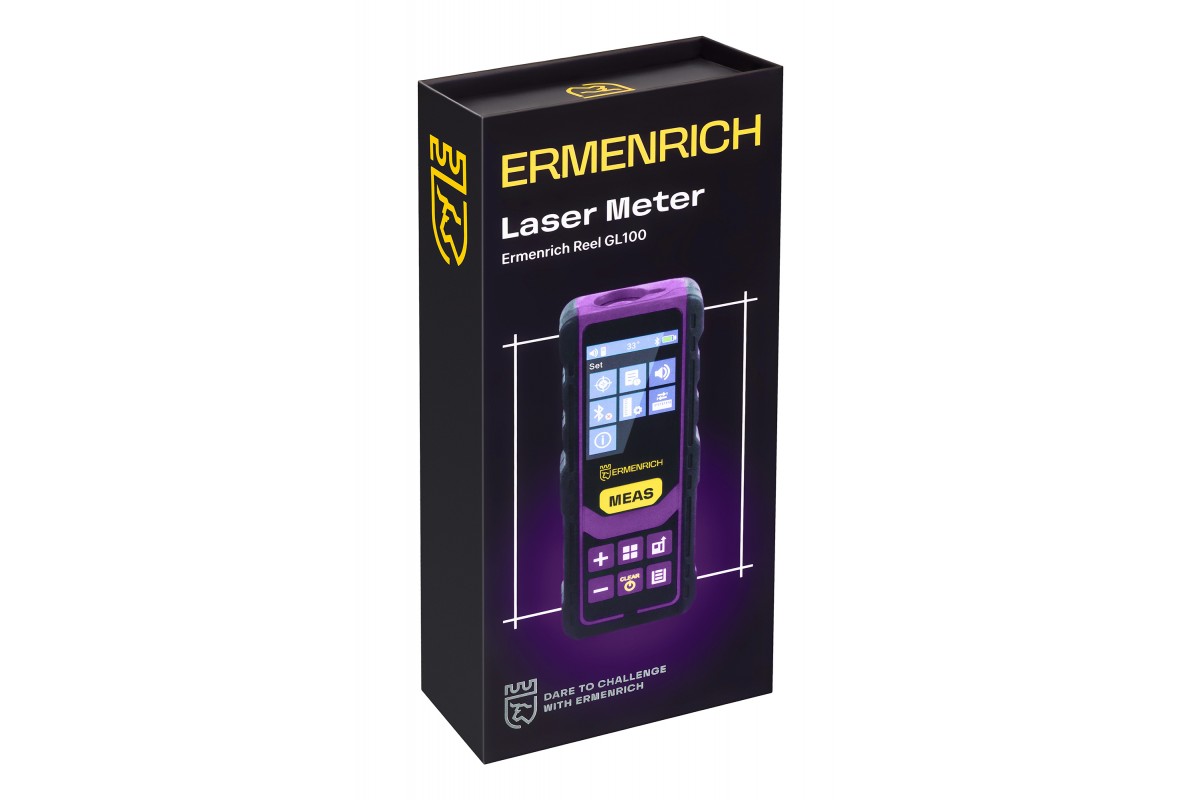 Лазерная рулетка Ermenrich Reel PRO GL100 – это компактный измерительный инструмент для строительных, ремонтных, инженерных и планировочных работ. Он позволяет измерять расстояние, длину, углы, площадь, объем треугольников и квадратов. Дополнительная функция «Пифагор» основана на известной теореме и помогает определить расстояние между двумя точками косвенно – по двум промежуточным замерам. Работает рулетка за счет высокоточного лазера с длиной волны 500–535 нм. Зеленый цвет лазера при дневном освещении лучше воспринимается глазом, чем классический красный. Погрешность измерений рулетки не превышает 1,5 мм.