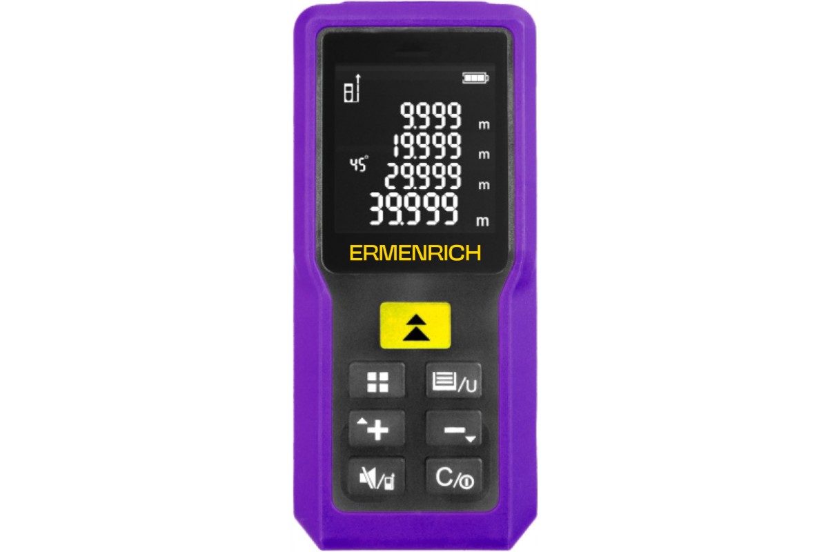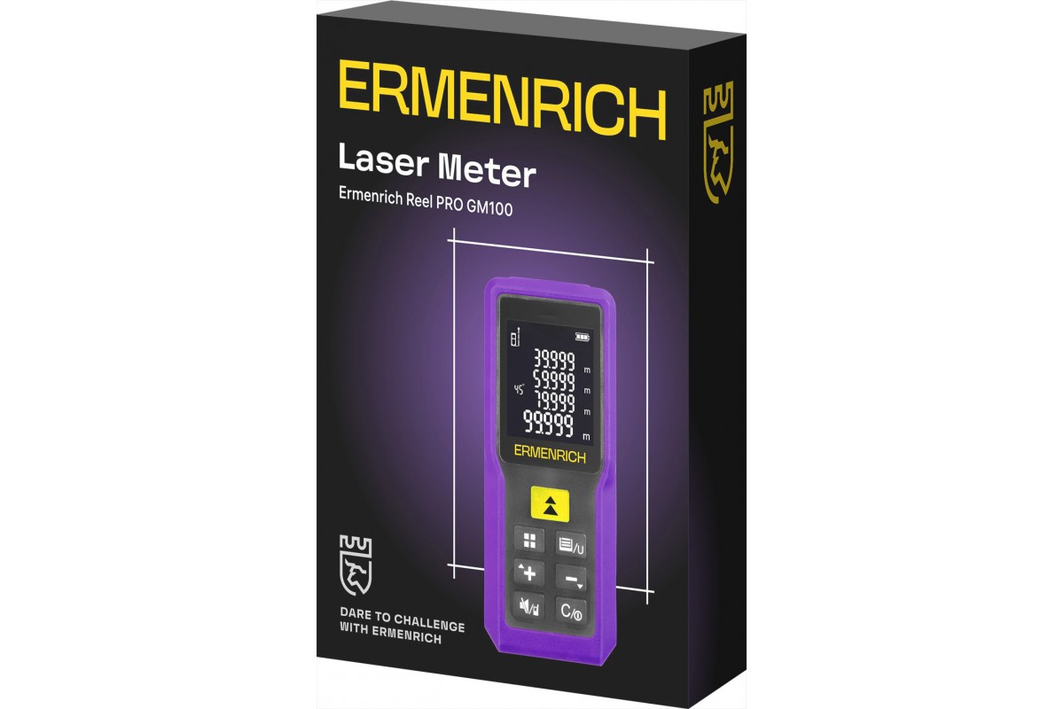 Одно из достоинств прибора – функция косвенных математических расчетов «Пифагор», при помощи которой можно определить расстояние между точками, в которых разместить рулетку обычным путем невозможно. Максимальное расстояние, измеряемое с помощью Ermenrich Reel PRO GM100, составляет 100 метров. Устройство выполнено в компактном и легком корпусе, который удобно удерживать одной рукой. На экран выводится 4 строки измеряемых параметров, питание осуществляется от 2 батареек ААА. Одного комплекта батареек достаточно, чтобы провести более 5000 измерений. Экономичность устройства обеспечивает также функция автоотключения.