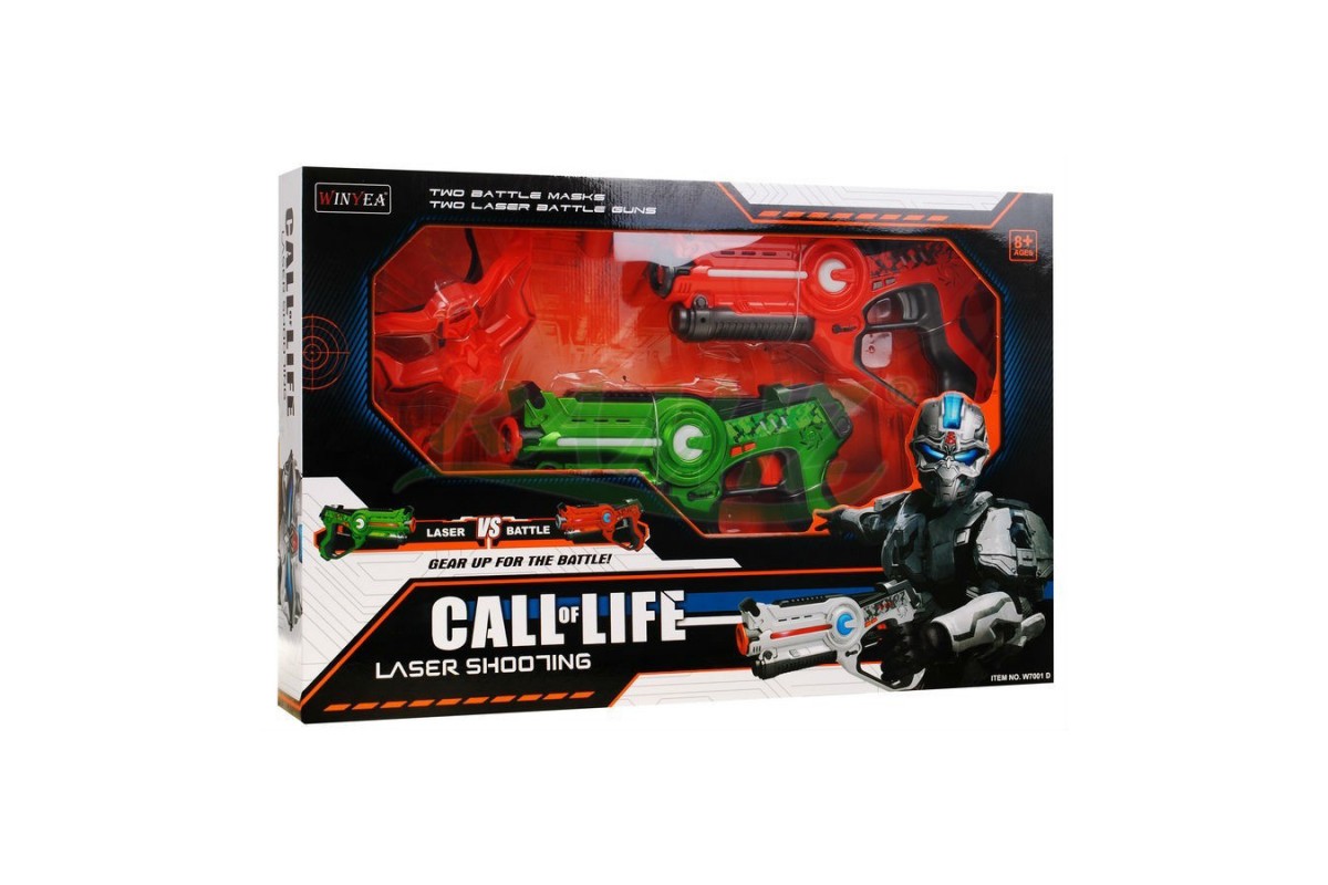 Набор оружия Winyea Call of Life W7001D со звуковыми и световыми эффектами надолго увлечет мальчишек. Пистолеты стреляют инфракрасным лучем, при попадании в маску она подает сигнал и показывает что снята 1 жизнь.