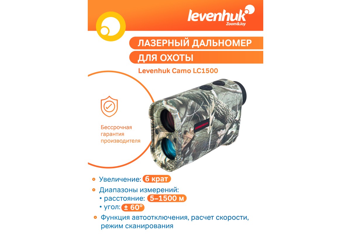 Levenhuk Camo LC1500 – лазерный дальномер для охоты, походов, спорта, поисково-спасательных операций и любой другой активной деятельности на открытых пространствах, которая подразумевает измерения расстояний, углов и скоростей. Прибор выполнен в камуфляжной расцветке, что оценят те пользователи, которым необходимо оставаться скрытыми во время его использования. Дальность действия прибора – до 1500 метров.