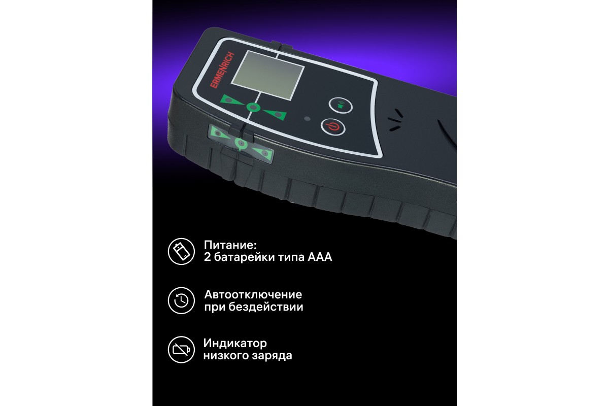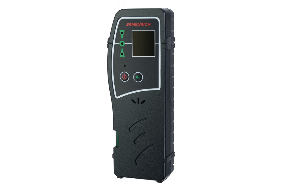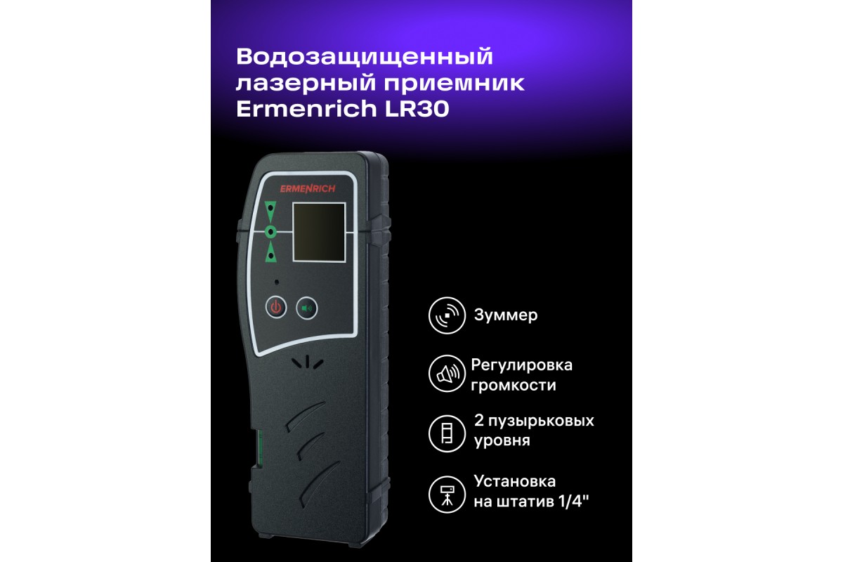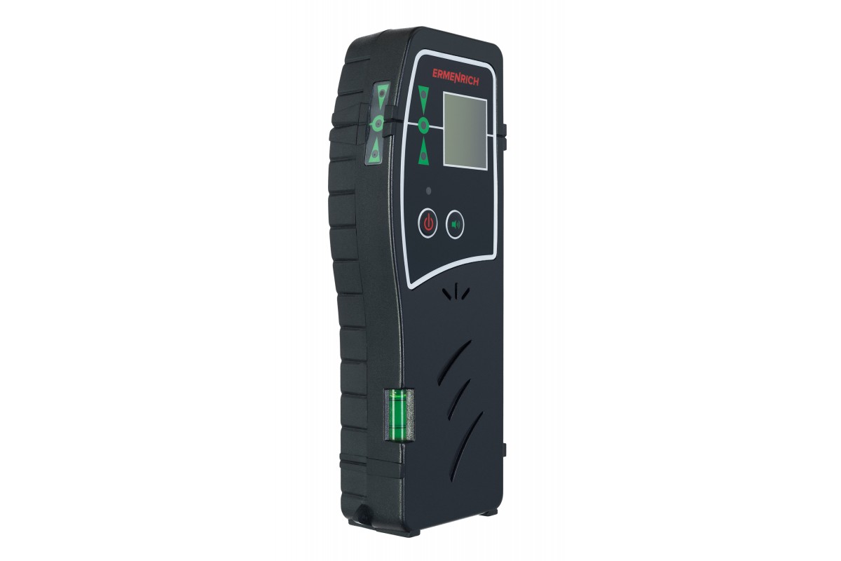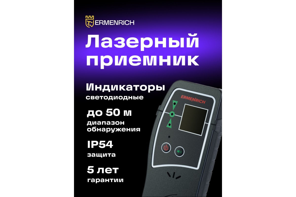 Лазерный приемник Ermenrich LR30 позволяет определять положение лазерного луча в пределах 50 метров, что делает работу с лазерными уровнями и рулетками более эффективной и удобной. Приемник распознает лучи красного и зеленого цвета. Настроить положение прибора относительно луча помогут светодиодные индикаторы. Сам приемник устанавливается на поверхности с помощью пузырьковых уровней, встроенных в корпус, а также может быть закреплен на штативе.