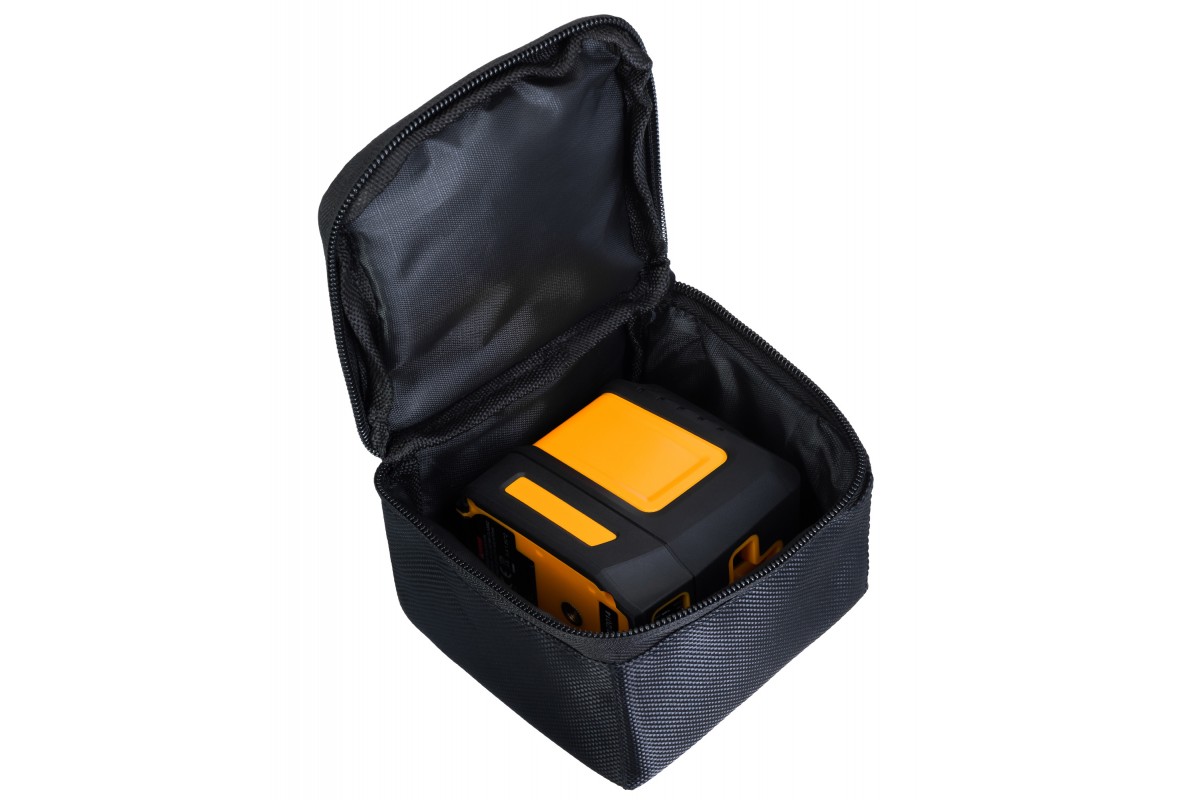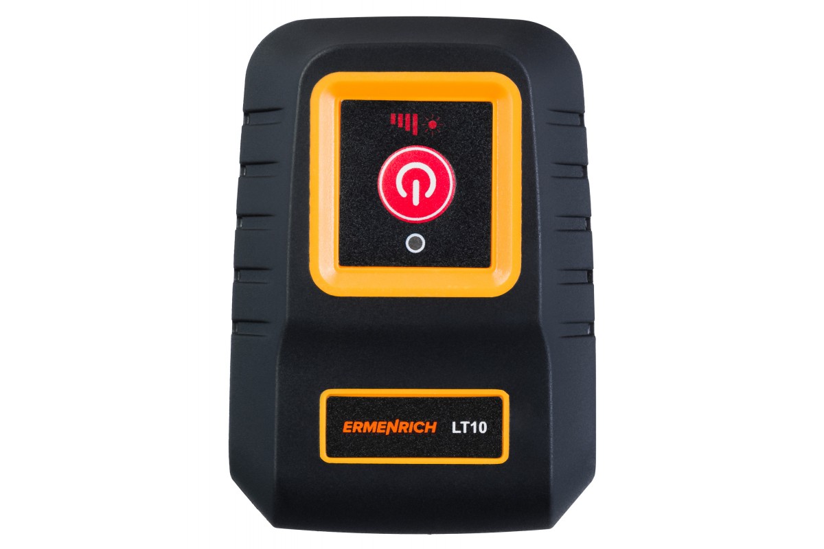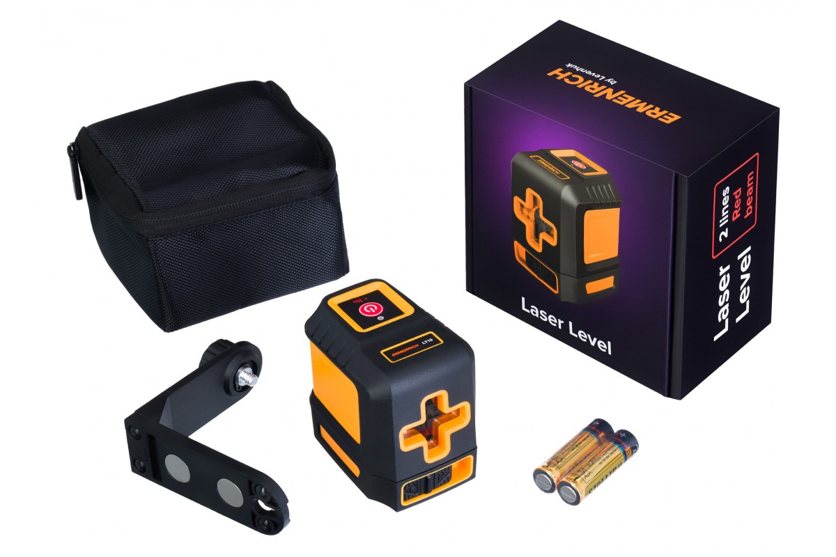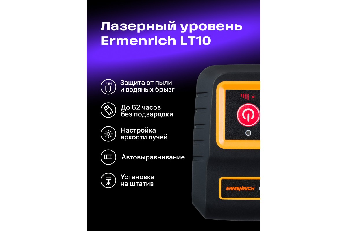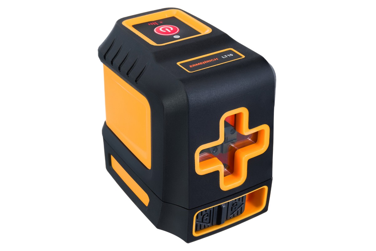 Модель Ermenrich BASE LT10 работает от пары батареек, срок автономной работы на одном заряде достигает 62 часов (при выборе низкой яркости лазерных светодиодов). Всего доступно 4 степени интенсивности лучей. Прочный корпус уровня защищен от пыли и брызг воды. Есть здесь и защита от падений, благодаря чему прибор устойчиво располагается на любой поверхности. При необходимости его можно также установить на штатив со стандартным диаметром 1/4 дюйма. Используя штатив с поворотной головкой, можно перемещать уровень, получая необходимую конфигурацию плоскостей.