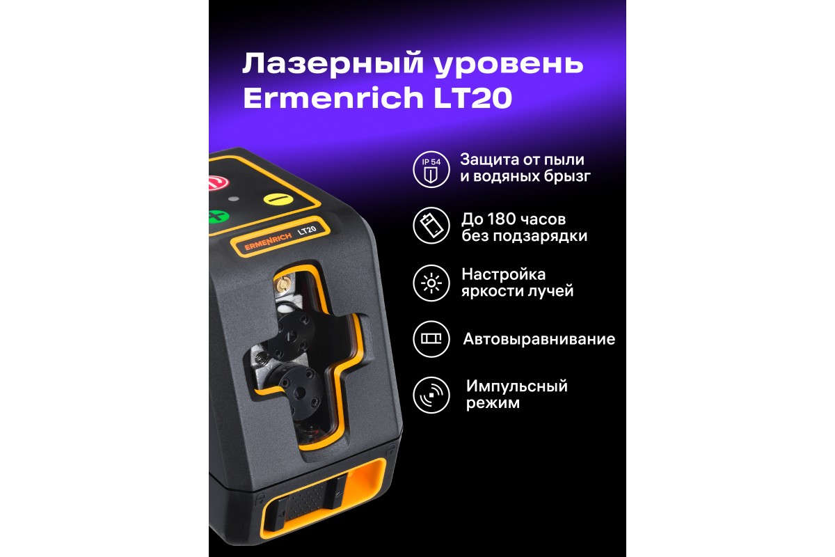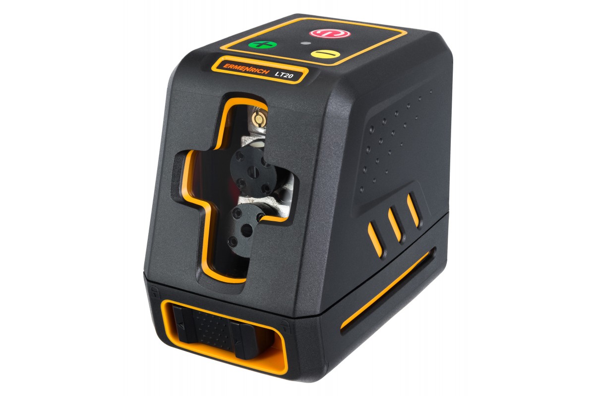 Корпус уровня Ermenrich BASE LT20 снабжен креплением для установки на штатив стандартного диаметра. При выборе штатива с наклонной платформой можно расширить диапазон работы лазера, отклоняя источник света на нужный угол и получая новую конфигурацию линий. Прибор защищен от пыли и распыления воды, что позволяет не бояться сложных условий ремонта. Питается уровень от обычных батареек, доступны 10 ступеней яркости. Даже при выборе максимальной интенсивности лазера срок работы на одной паре батареек достигает 40 часов.