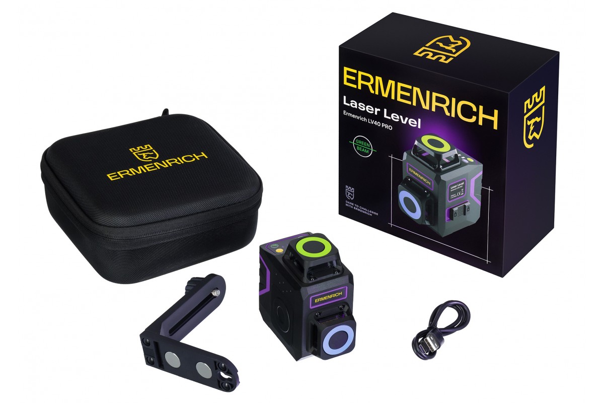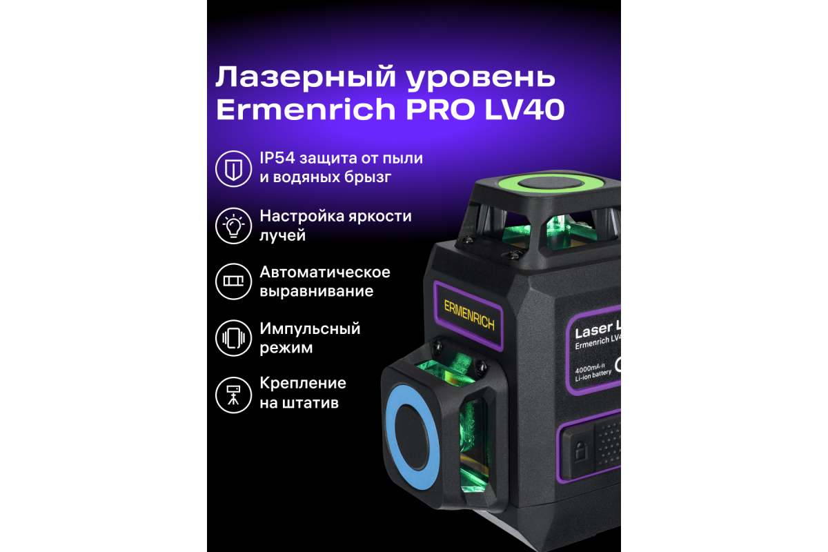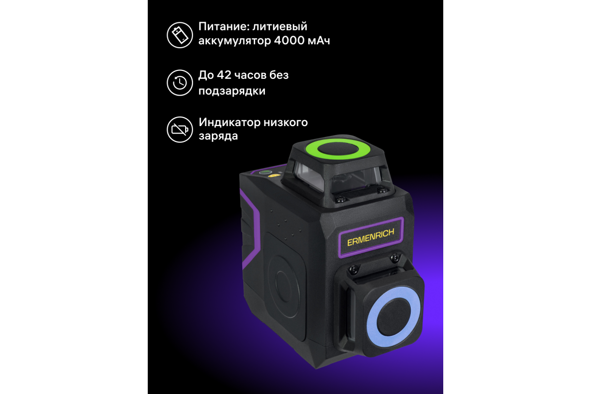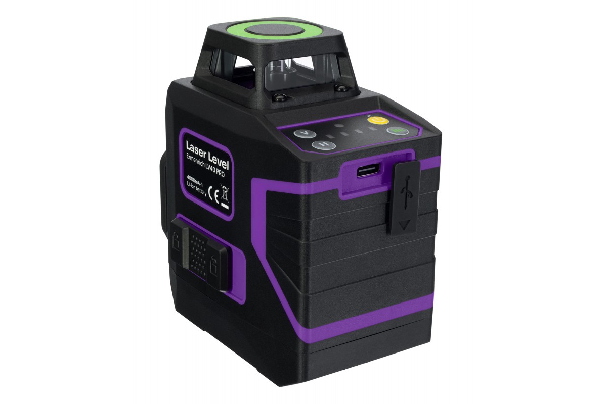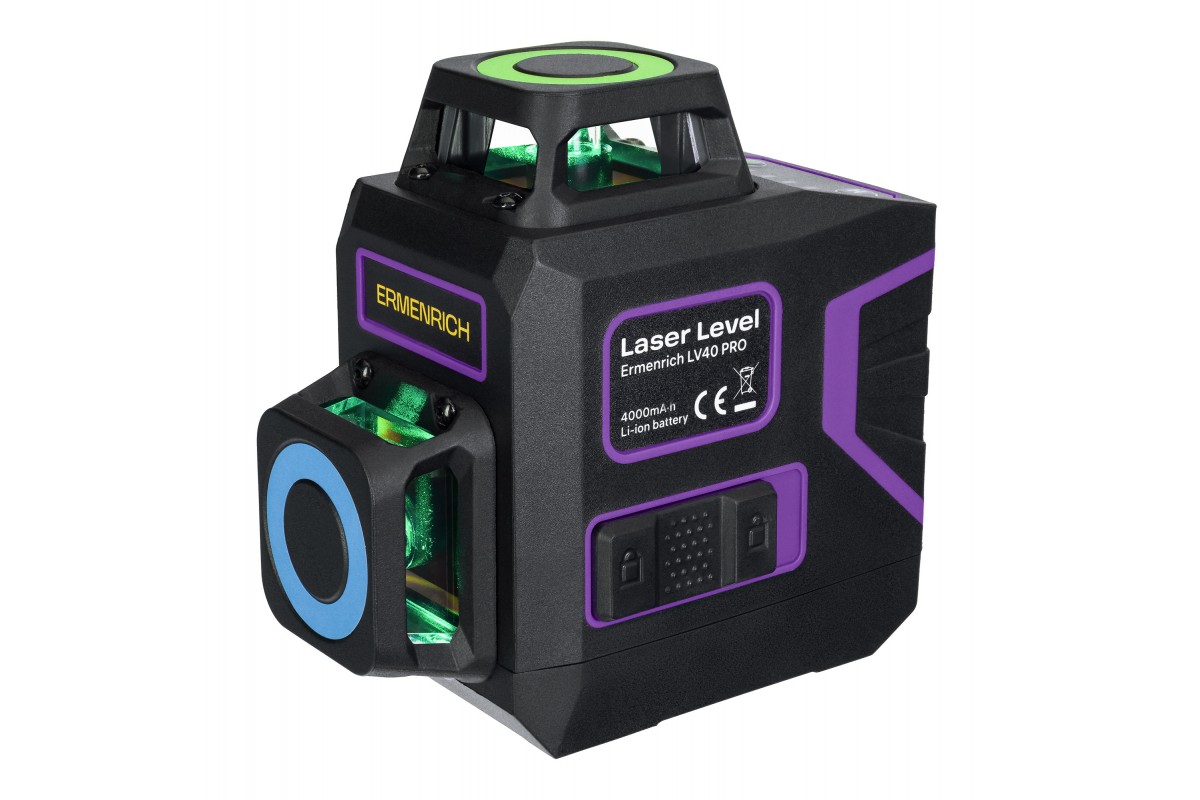 Лазерный уровень Ermenrich PRO LV40 снабжен механизмом компенсации, который за счет сглаживания вибраций осуществляет автоматическое выравнивание лазерных линий. Их яркость можно регулировать, доступно 4 степени интенсивности – это позволяет подобрать оптимальный вариант в соответствии с освещением на объекте. Встроенный аккумулятор способен работать автономно до 42 часов (при выборе минимальной яркости). Прибор рассчитан на работу в широком температурном диапазоне, прочный корпус защищен от пыли и водяных брызг.
