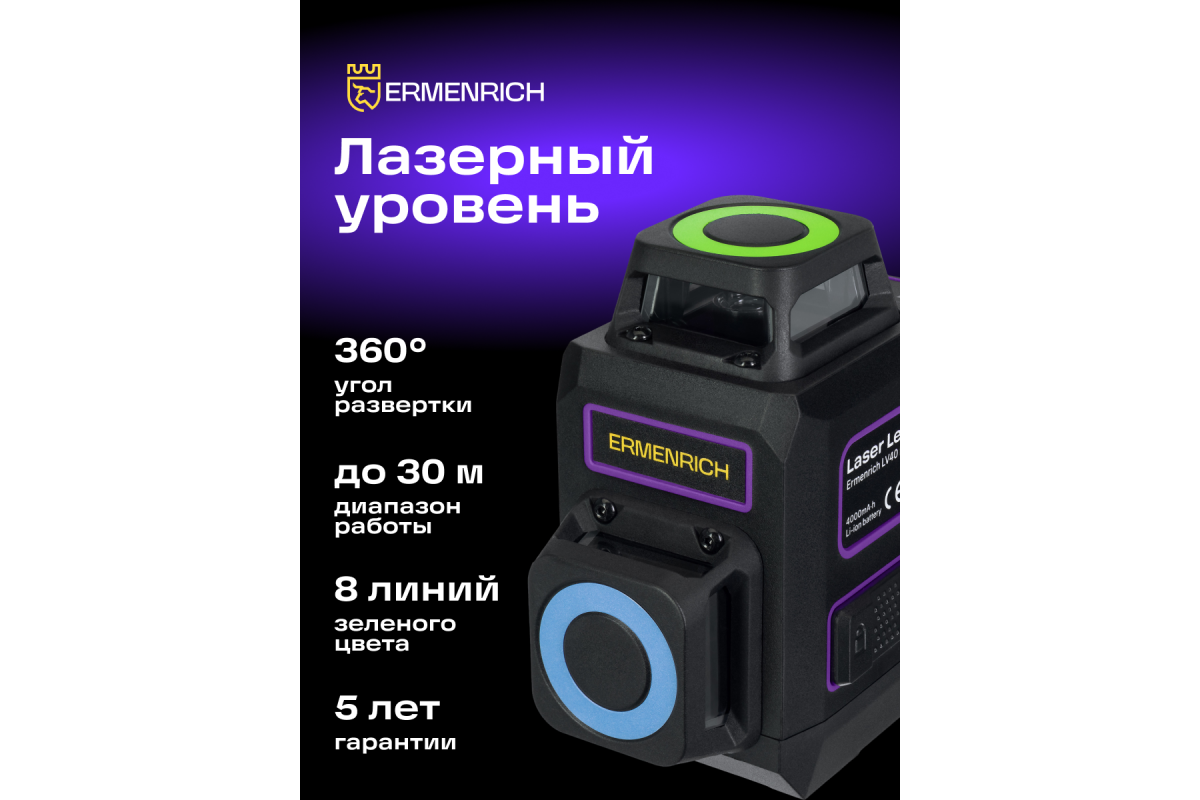 Представляем Ermenrich PRO LV40 – лазерный уровень, который выстраивает 8 линий в двух плоскостях. Он прекрасно подойдет для строительных и монтажных работ, ремонта и отделки помещений. Дальность работы прибора достигает 30 метров, а угол горизонтальной и вертикальной развертки здесь составляет 360 градусов. Поэтому даже на большой площади можно эффективно применять уровень для выравнивания стен, полов, покрытий и решения других задач. При необходимости устройство можно устанавливать на стандартные штативы.