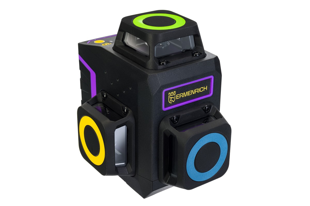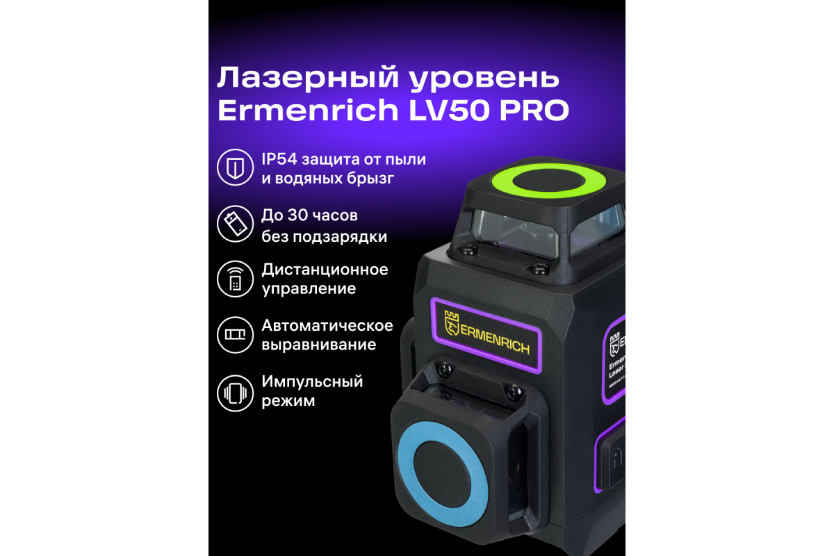 Дальность работы Ermenrich PRO LV50 достигает 30 метров, запускать лазер можно на расстоянии с помощью пульта дистанционного управления. Встроенный механизм самовыравнивания компенсирует вибрации. Литиевый аккумулятор, подзаряжаемый от сети по USB, обеспечивает долгую автономную работу. Ее срок будет зависеть от выбранного уровня яркости лазерных светодиодов – всего доступно 4 степени интенсивности. Подобрать оптимальный вариант не составит труда при любых условиях освещения. Корпус прибора защищен от пыли и брызг воды, при необходимости его можно закрепить на штативе 1/4 дюйма.
