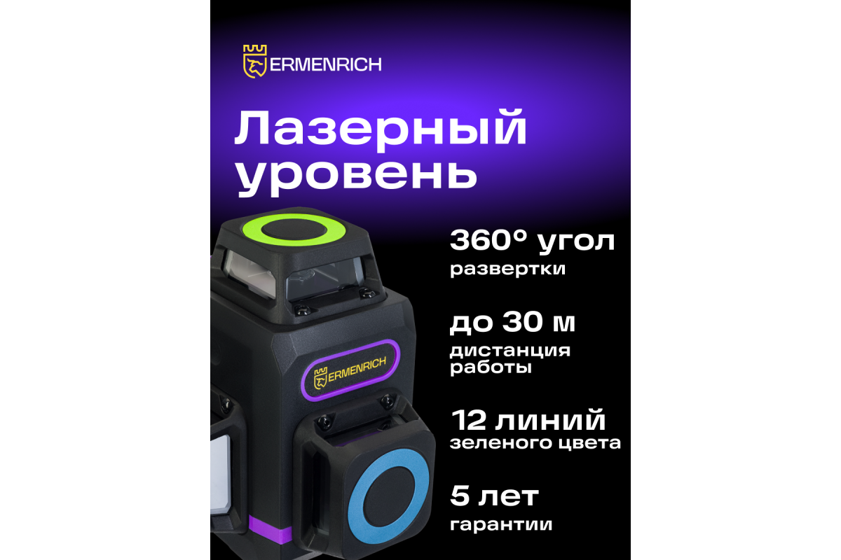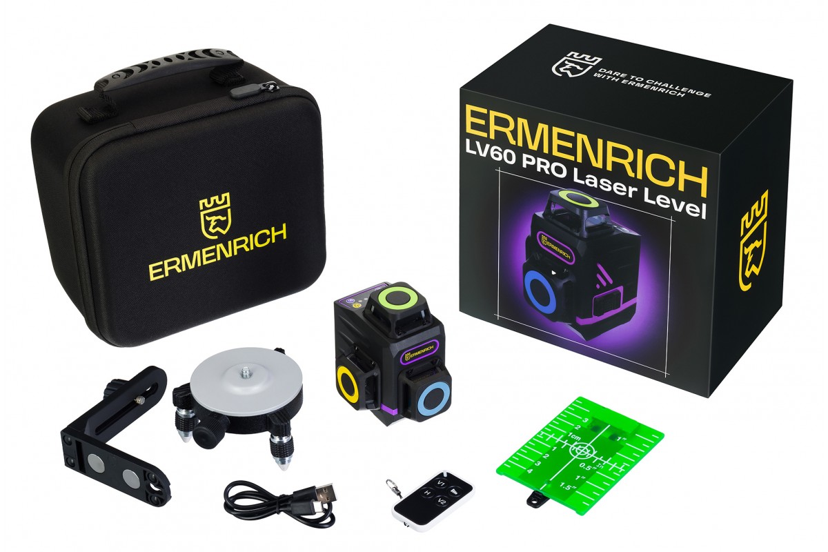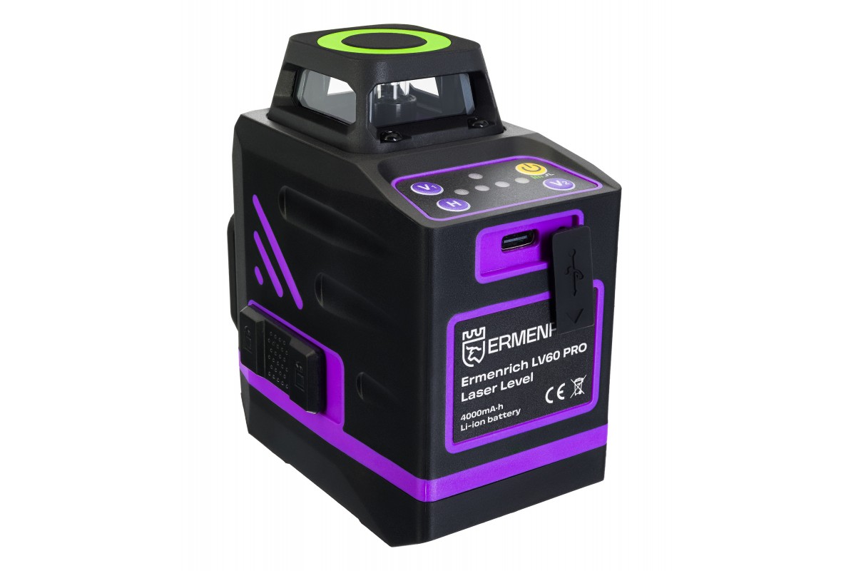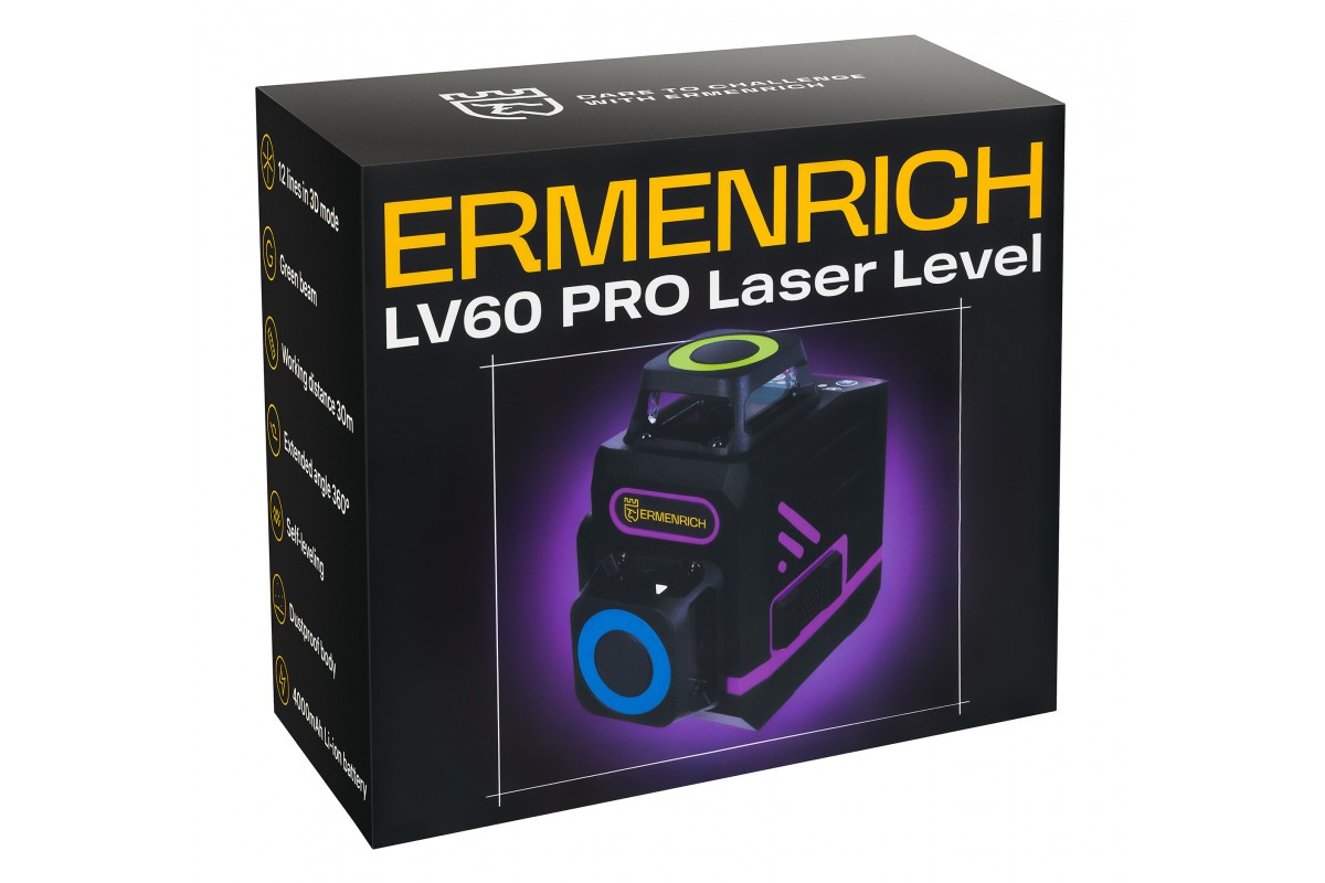 Основное преимущество портативного лазерного уровня Ermenrich PRO LV60 – невероятно компактный размер и маленький вес. Он не обременяет в дороге, легко транспортируется в рабочей сумке, может уместиться даже на ладони. Габариты прибора: 7х7х9,5 см. Вес: 340 грамм. Лазерный уровень работает в трех проекциях, формируя 12 линий зеленого цвета. Это отличный инструмент для строителя, монтажника, мастера по гипсокартонным и другим отделочным работам.