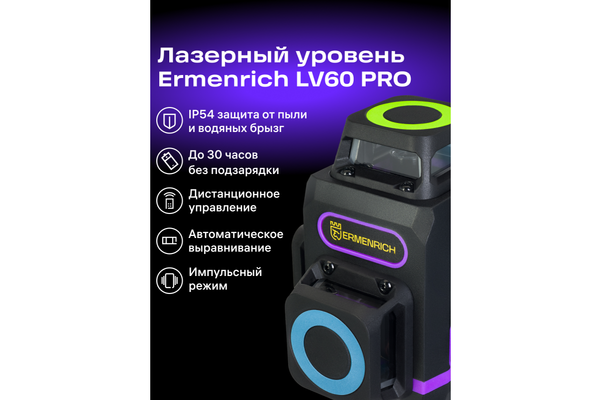 Управлять лазером Ermenrich PRO LV60 можно дистанционно с помощью пульта. Уровень работает от аккумулятора с подзарядкой по USB от сети, пульт – от обычных батареек. Достичь максимальной точности помогает встроенный механизм компенсации, за счет которого производится самовыравнивание лучей, а также применение лазерной мишени (в комплекте). Прибор рассчитан на использование в широком диапазоне температур, защищен от брызг воды и воздействия пыли. Он устойчиво располагается на любой горизонтальной поверхности, а при желании может быть установлен на штатив.