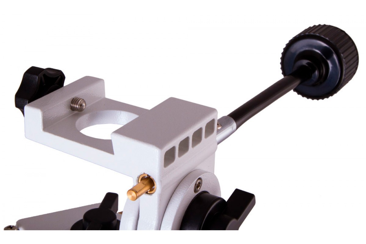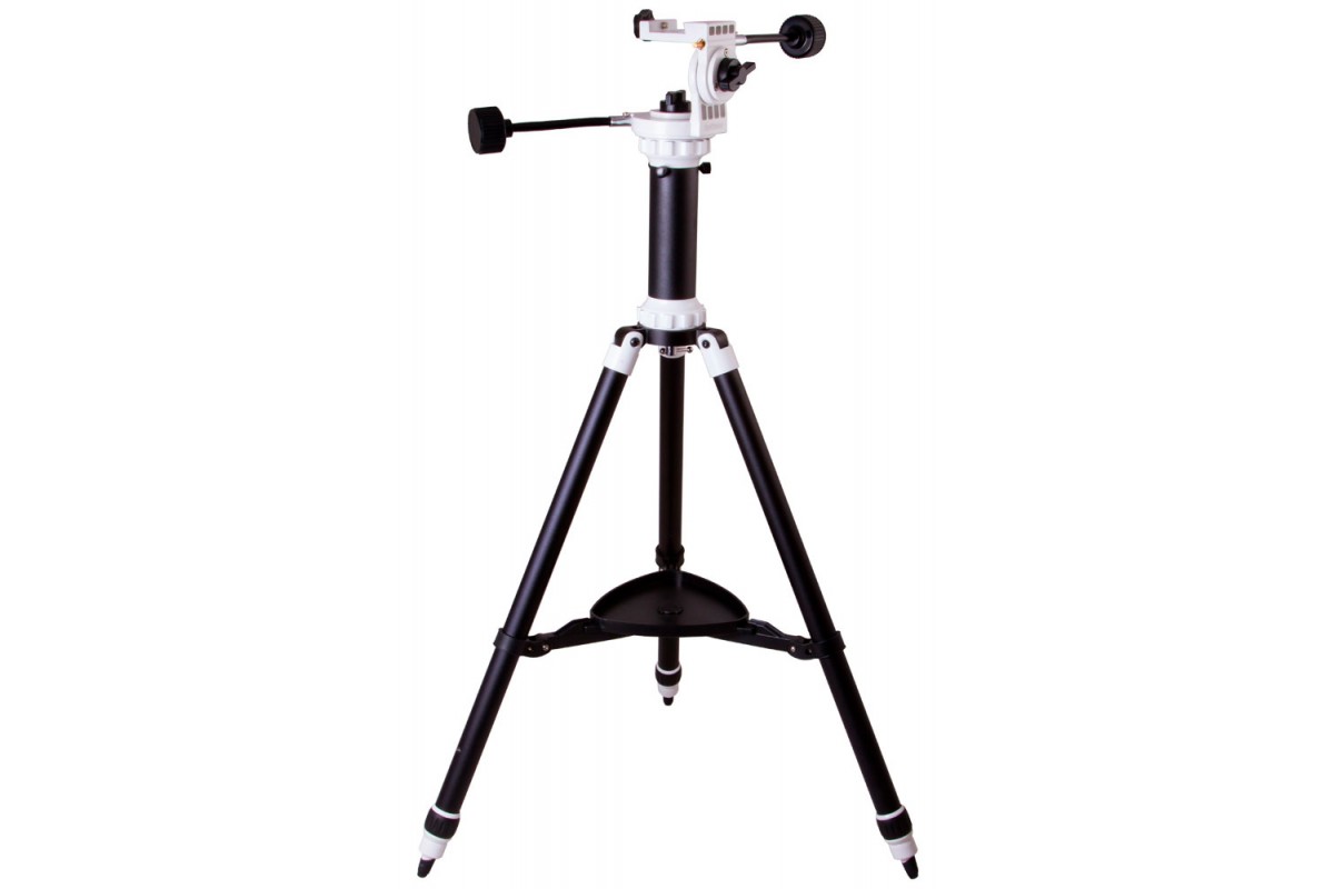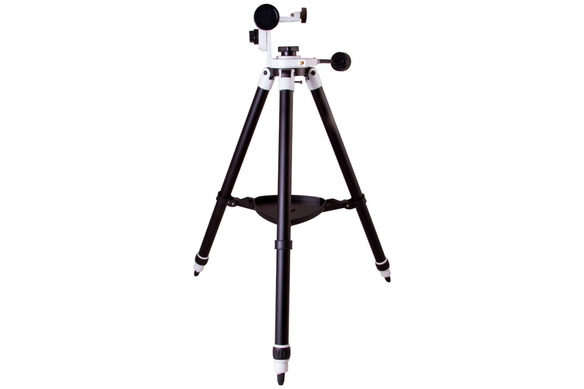 Перемещение оптической трубы по высоте и азимуту осуществляется при помощи азимутальной монтировки с ручным управлением, оснащенной двумя ручками тонких движений. Она устанавливается на надежную алюминиевую треногу, высоту которой можно отрегулировать через круговые зажимы на опорах (также между опорами можно разместить лоток для аксессуаров – входит в комплект). Оптическая труба не колеблется при работе, поскольку надежно крепится к монтировке при помощи «ласточкиного хвоста» и винта-барашка.