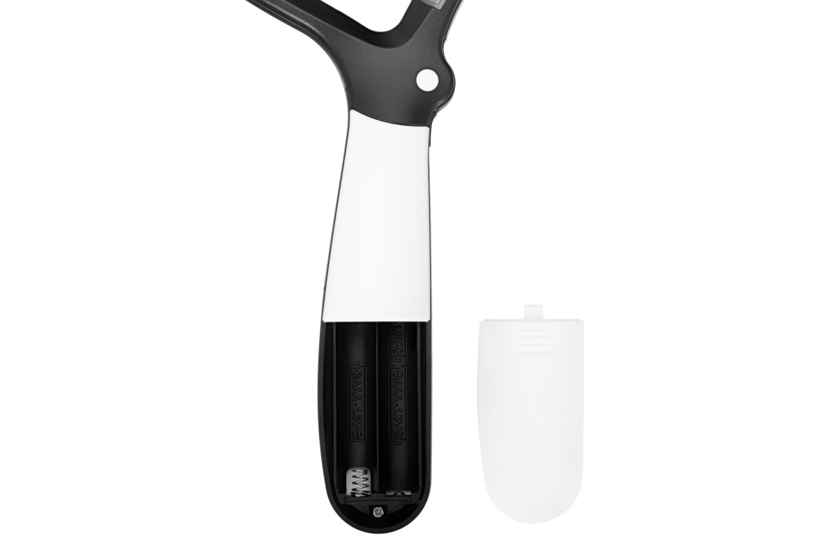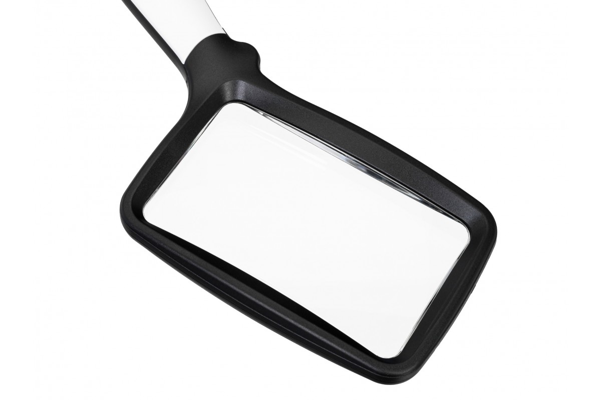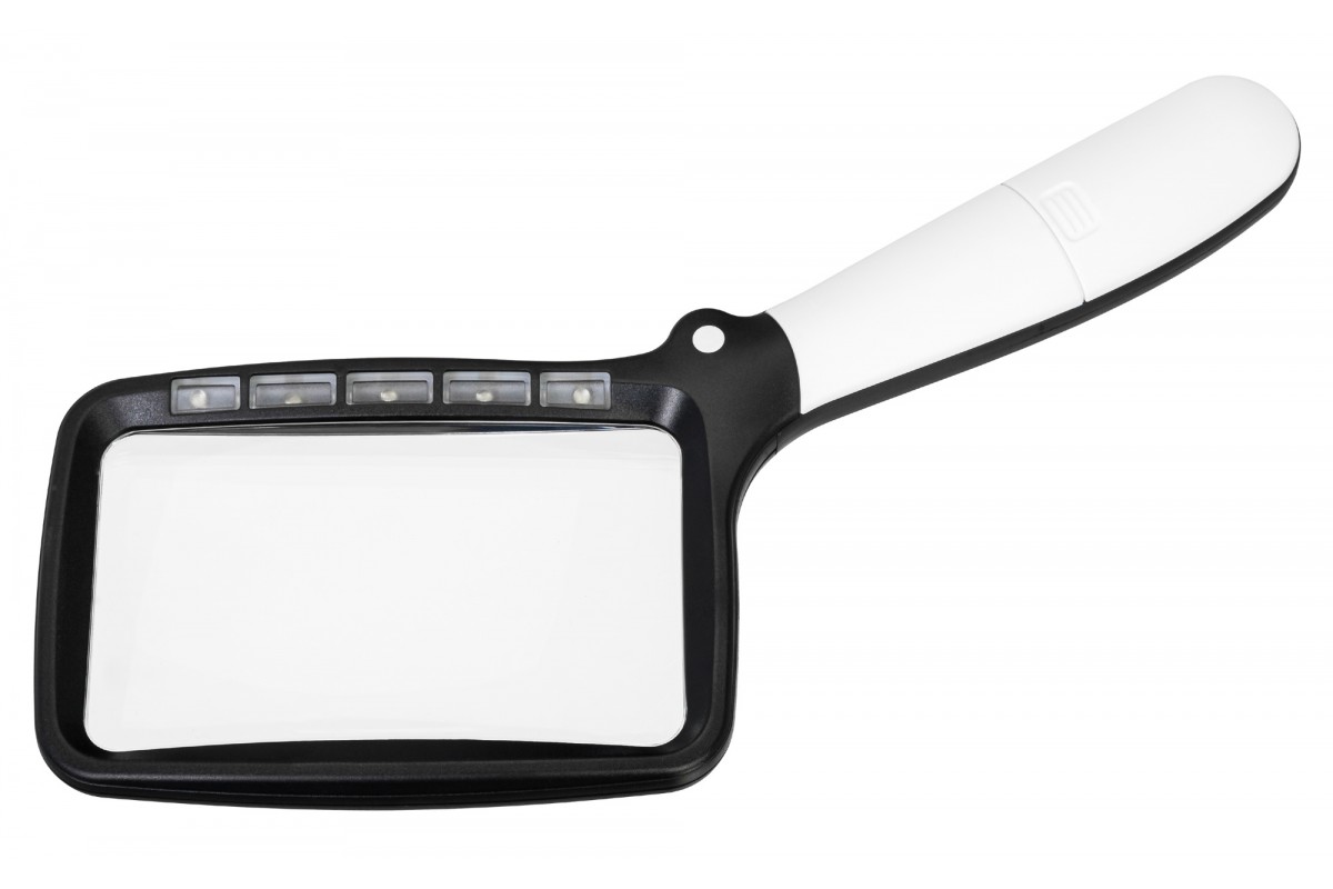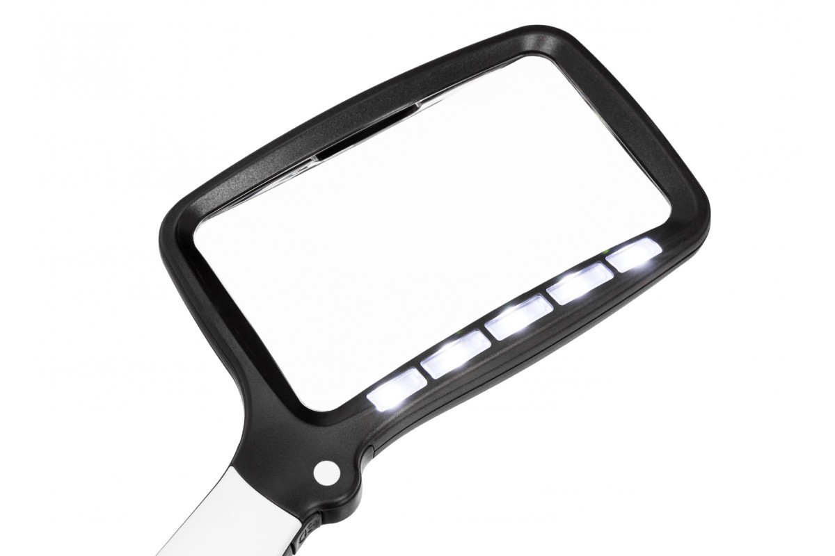 Линза лупы Levenhuk Zeno Read ZR16 имеет прямоугольную форму. Рабочая область под линзой равномерно освещается пятью светодиодами. Их яркость можно регулировать, подбирая наиболее комфортный режим освещения. Для работы подсветки требуются три батарейки типа ААА (не входят в комплект). Пользоваться лупой удобно благодаря складной конструкции пластикового корпуса: при необходимости ручку можно убрать.