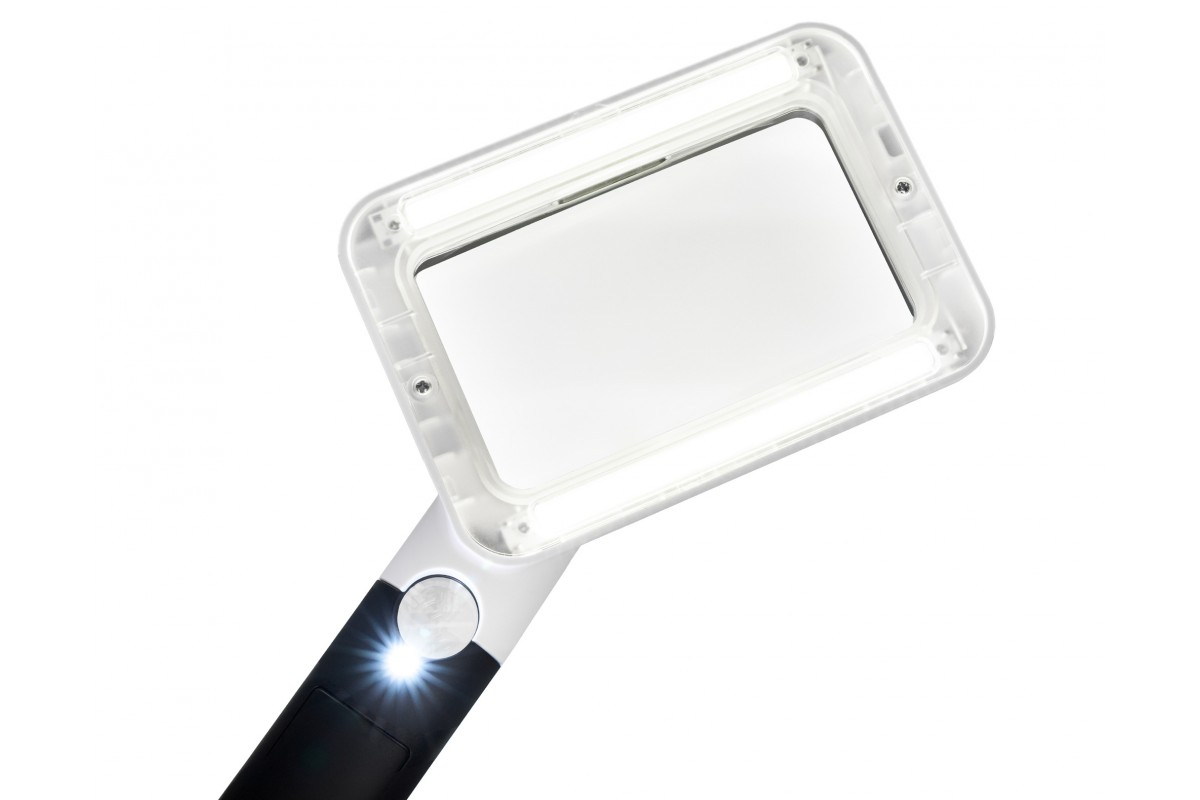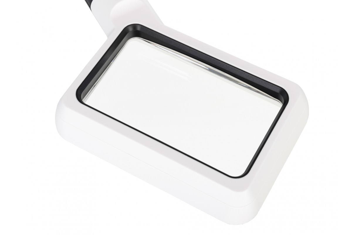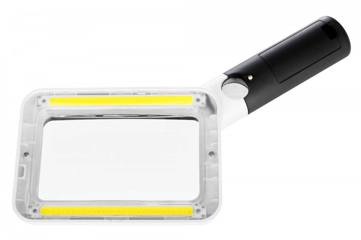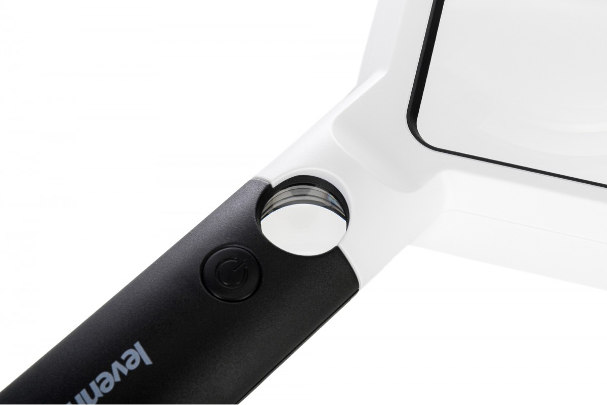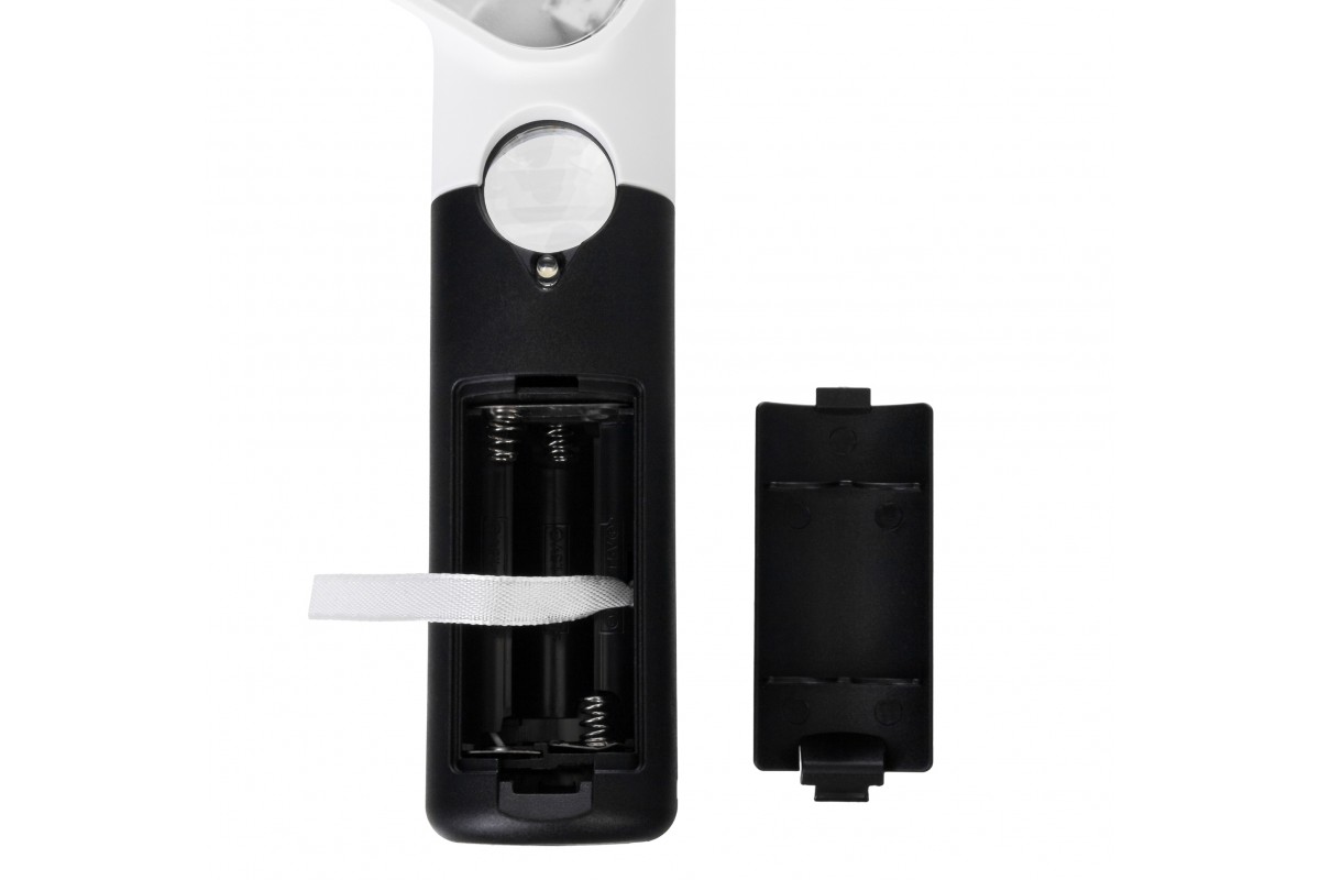 Основная двукратная линза позволяет работать с достаточно обширной областью. В ручку лупы встроена небольшая дополнительная линза круглой формы – с ее помощью можно рассмотреть мельчайшие детали на мощном 20-кратном увеличении. Для наилучшего результата можно воспользоваться подсветкой, работающей от батареек ААА (в комплект не входят). Она включает в себя два COB-светодиода. Еще один светодиод, классического типа, размещен у малой линзы. Интенсивность подсветки можно регулировать.