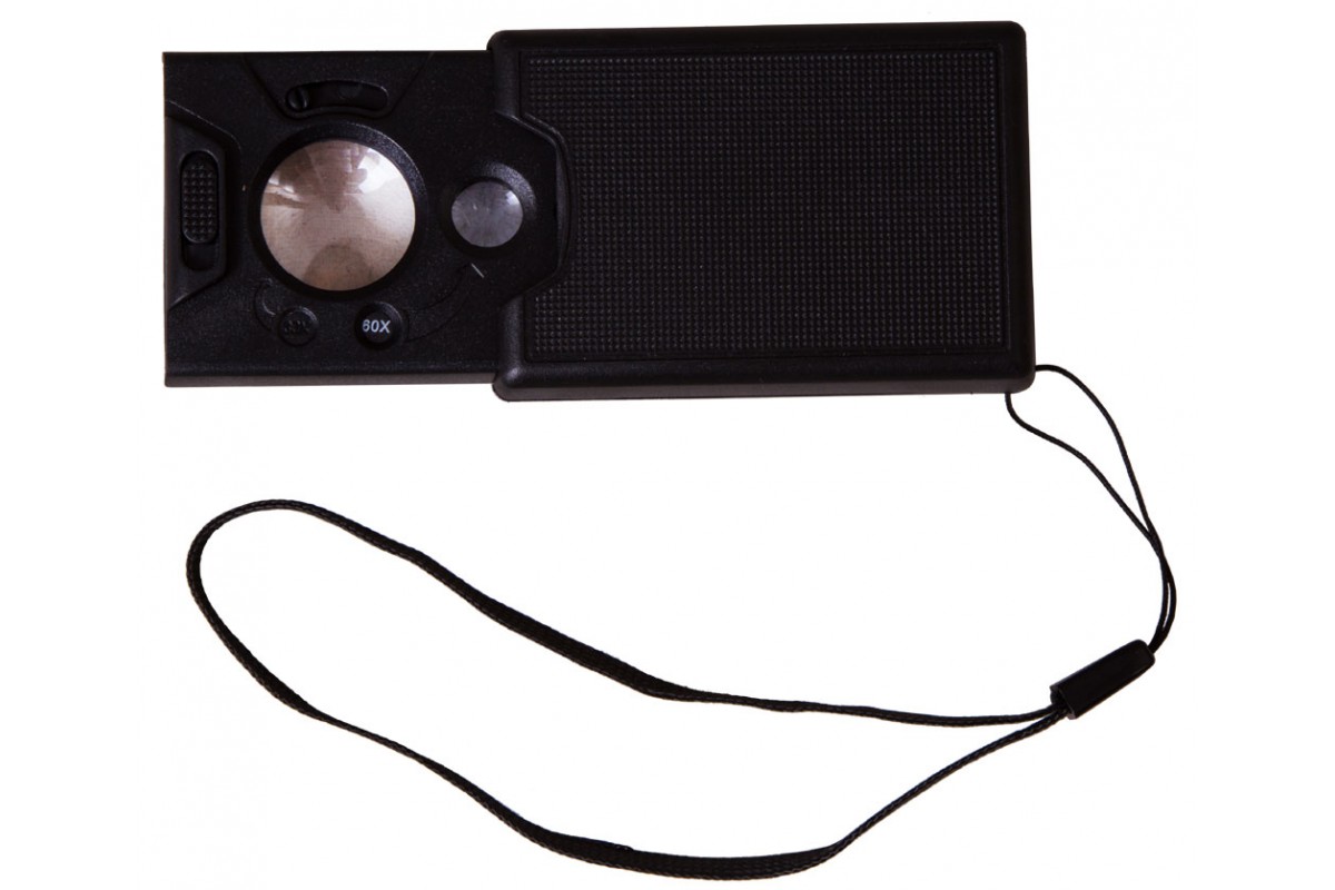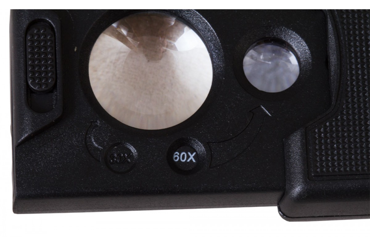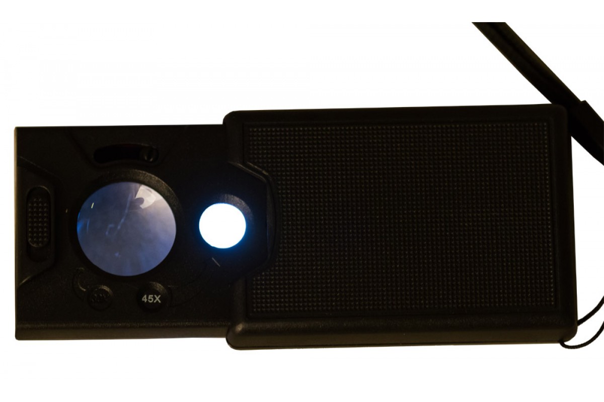У лупы две встроенные подсветки. Благодаря светодиодной подсветке вы сможете использовать лупу в помещениях с плохим освещением. Ультрафиолетовая подсветка позволит вам оценивать подлинность бумажных купюр. Смена типа подсветки происходит при помощи переключения небольшого рычажка на корпусе.