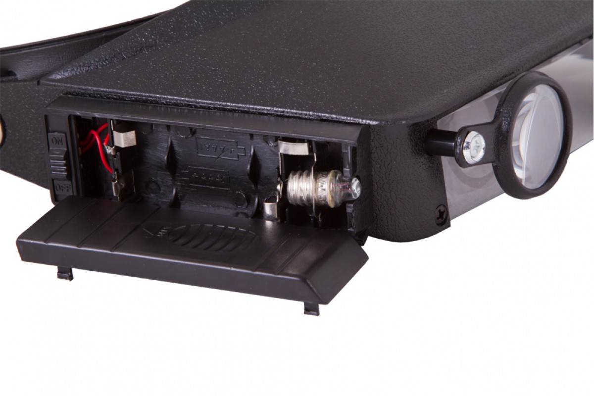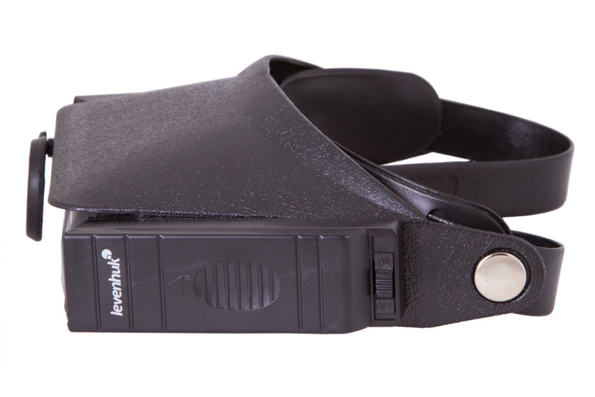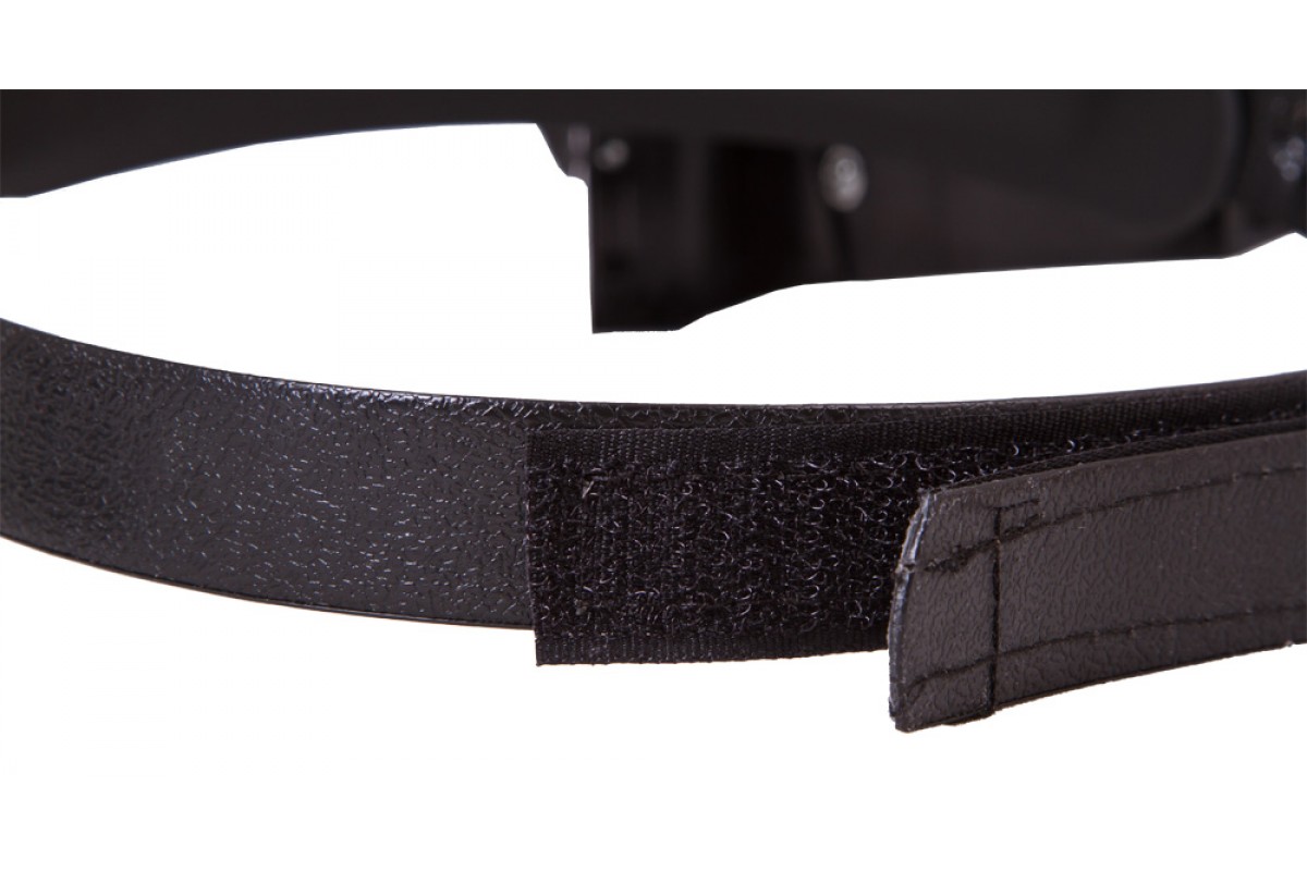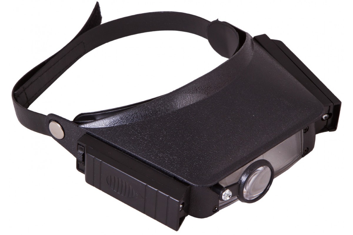 Лупа налобная – она фиксируется на голове при помощи гибкого ремня на липучке. Длина налобного ремня регулируется, поэтому надежно закрепить лупу не составит труда. Для работы в темных или плохо освещенных помещениях лупа имеет встроенную подсветку. Это два ярких светодиода, расположенные справа и слева от основной линзы. Светодиоды работают от батареек типа ААА (в комплект не входят).