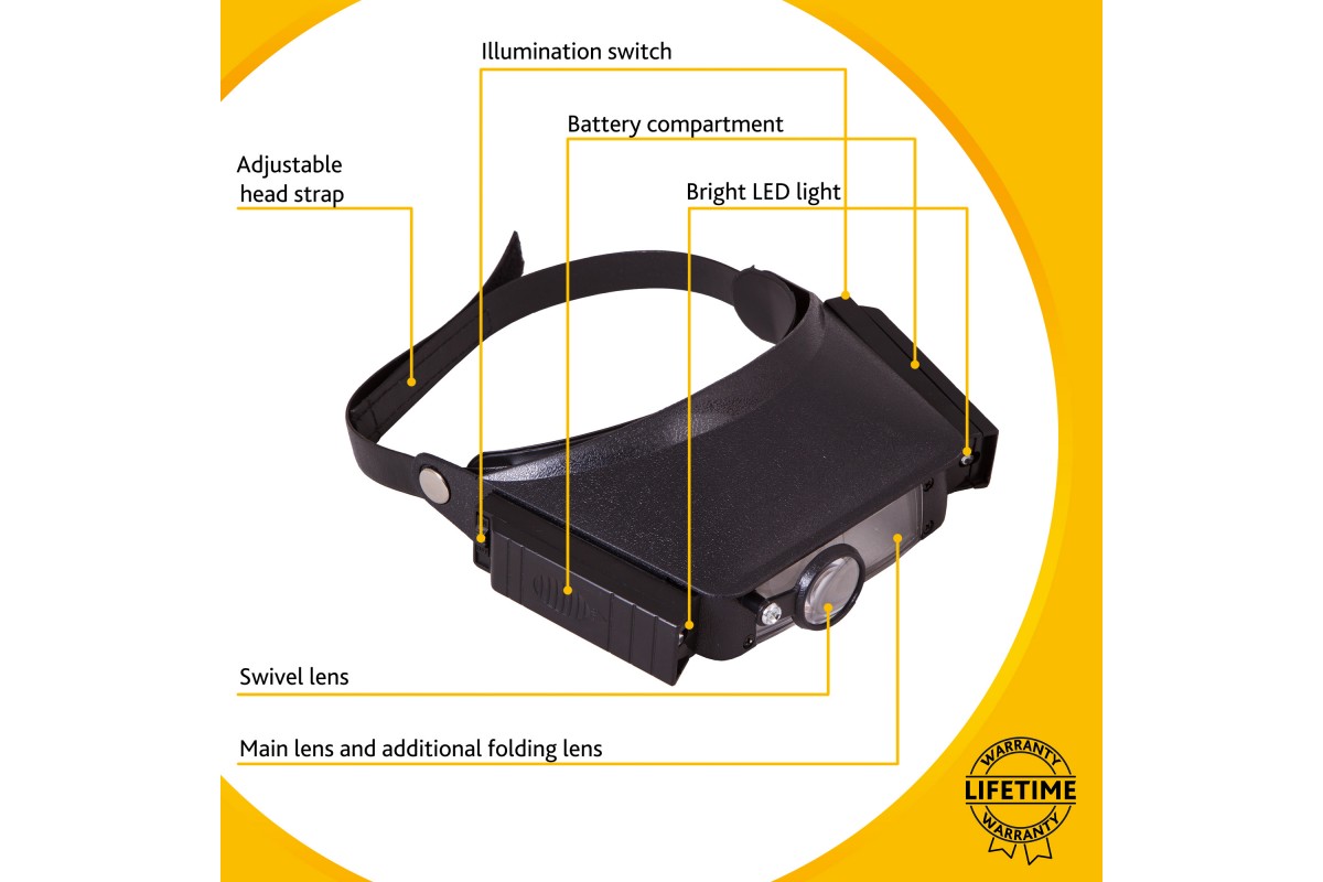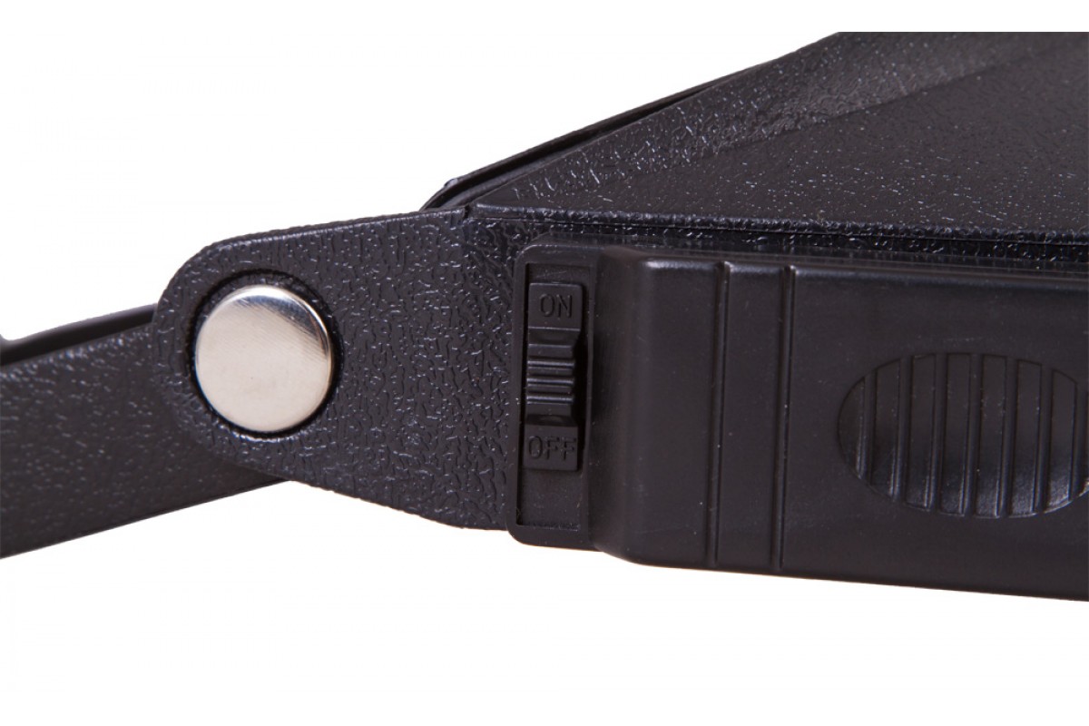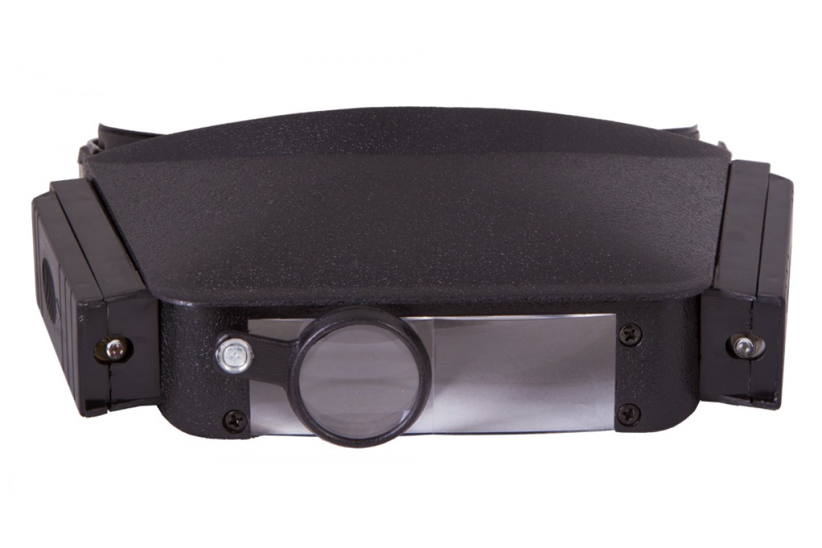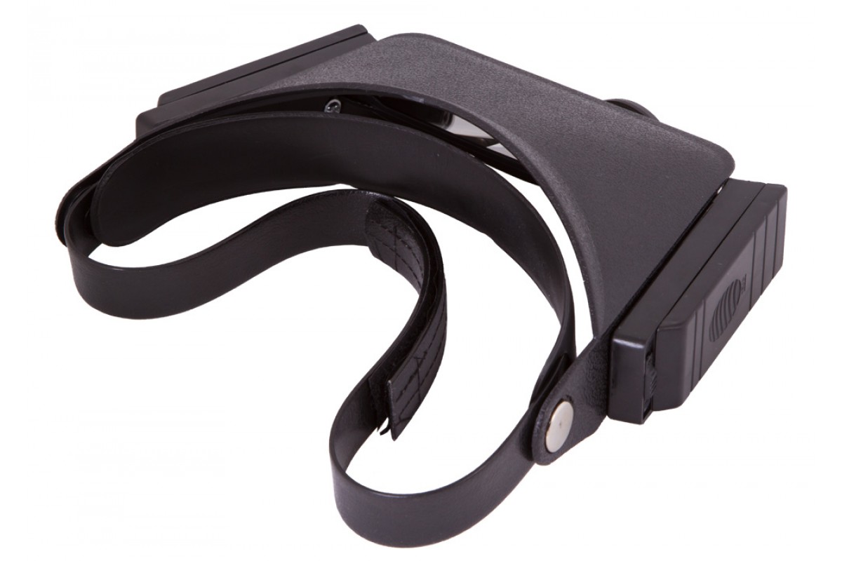 Лупа налобная – она фиксируется на голове при помощи гибкого ремня на липучке. Длина налобного ремня регулируется, поэтому надежно закрепить лупу не составит труда. Для работы в темных или плохо освещенных помещениях лупа имеет встроенную подсветку. Это два ярких светодиода, расположенные справа и слева от основной линзы. Светодиоды работают от батареек типа ААА (в комплект не входят).