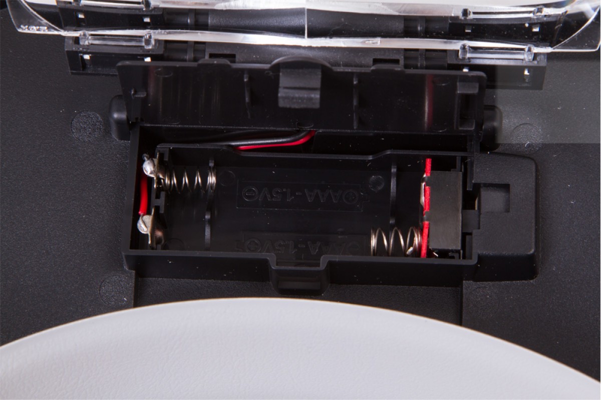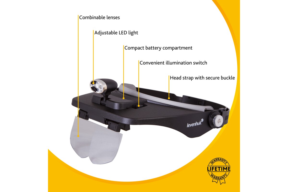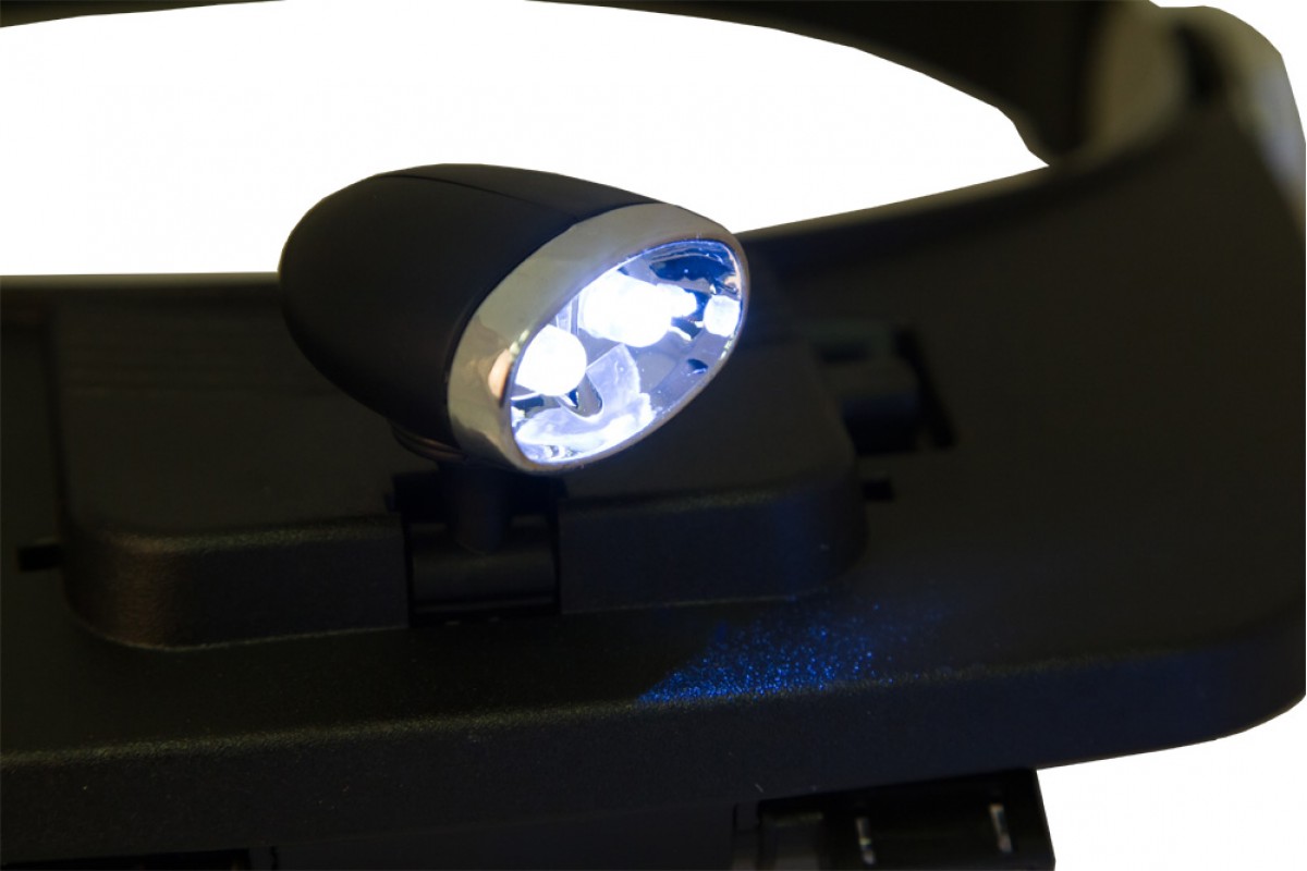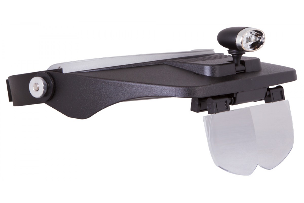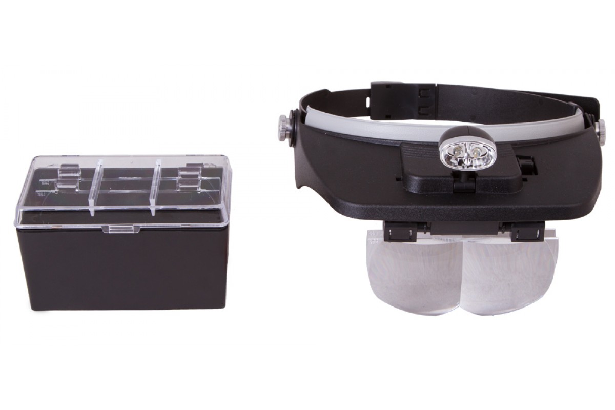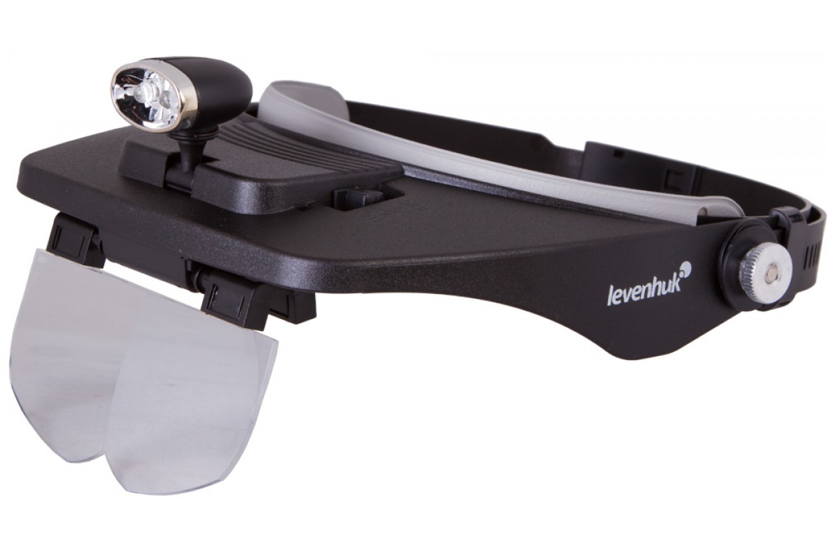 Лупа Levenhuk Zeno Vizor H3 фиксируется на голове при помощи специального гибкого обруча. Это помогает освободить руки для работы. Для освещения рабочей области используется светодиодная подсветка. Она работает от батареек.
