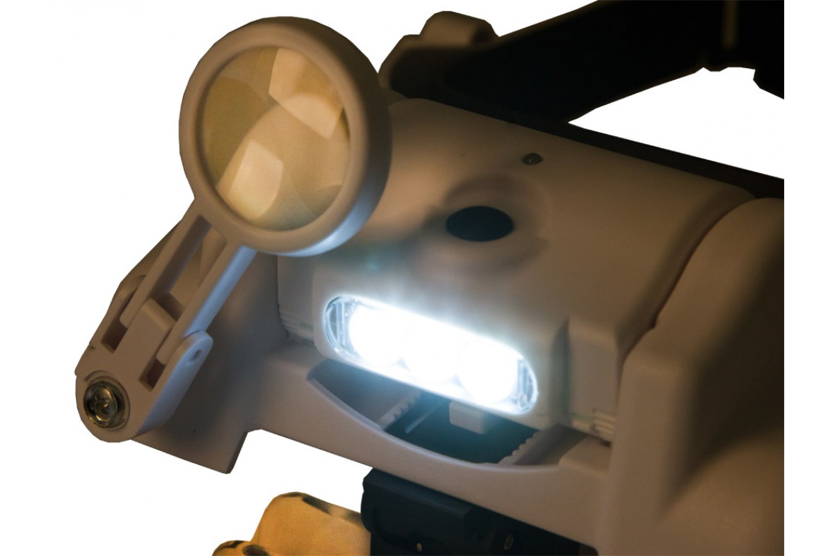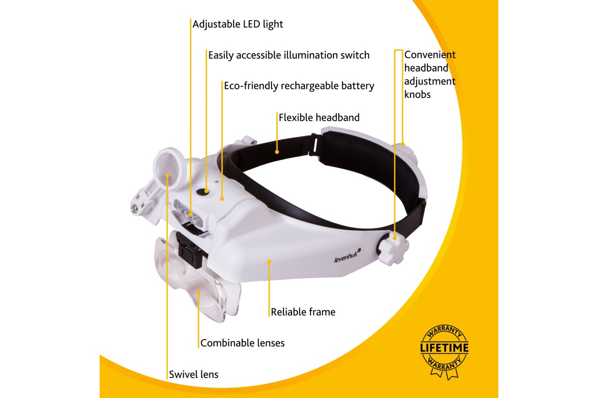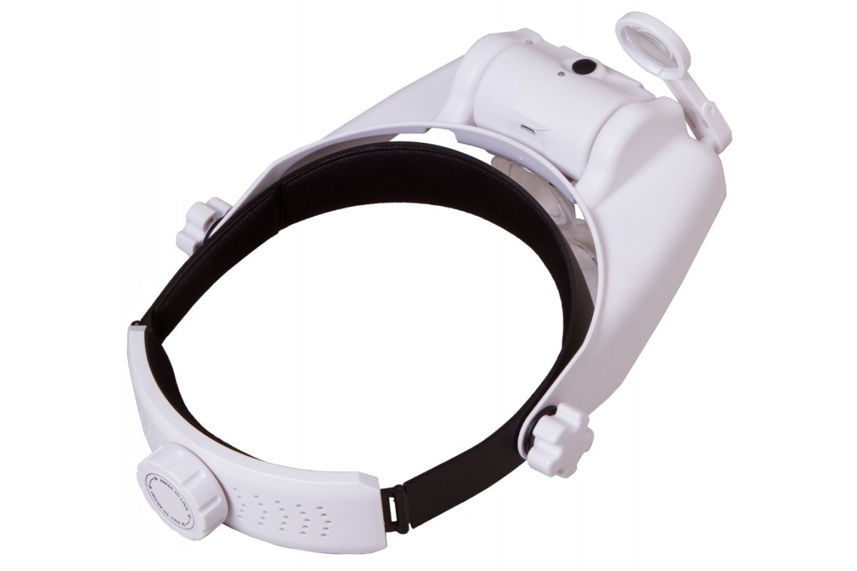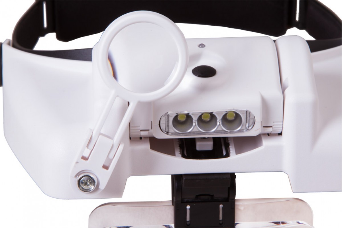 Levenhuk Zeno Vizor HR6 – налобная лупа для выполнения точных работ любого уровня сложности. На нее можно устанавливать сразу две линзы, достигая, таким образом, больших увеличений. Всего в комплект поставки включено пять линз разной кратности. Мощность оптики можно усилить и при помощи дополнительной линзы для правого глаза. Она дает еще 8 крат к увеличению. Все линзы можно отвернуть в сторону при необходимости, тогда на рабочую область получится взглянуть невооруженным глазом. А однократная линза, входящая в комплект поставки, способна превратить лупу в защитные очки для монтажных работ.