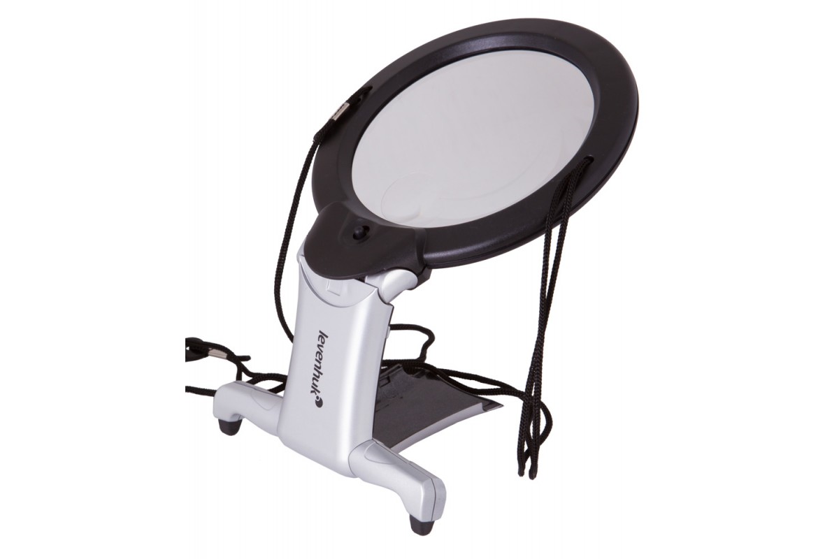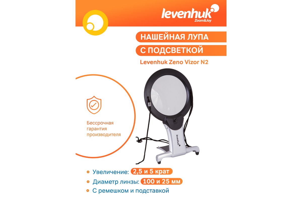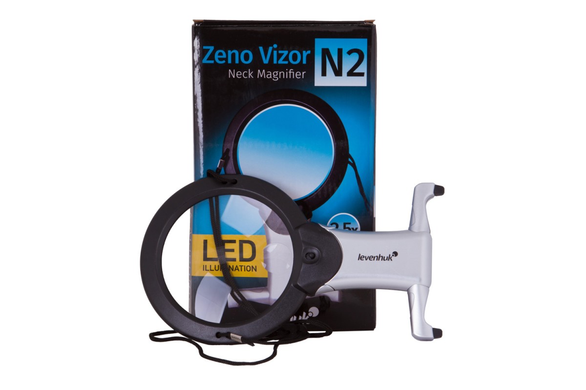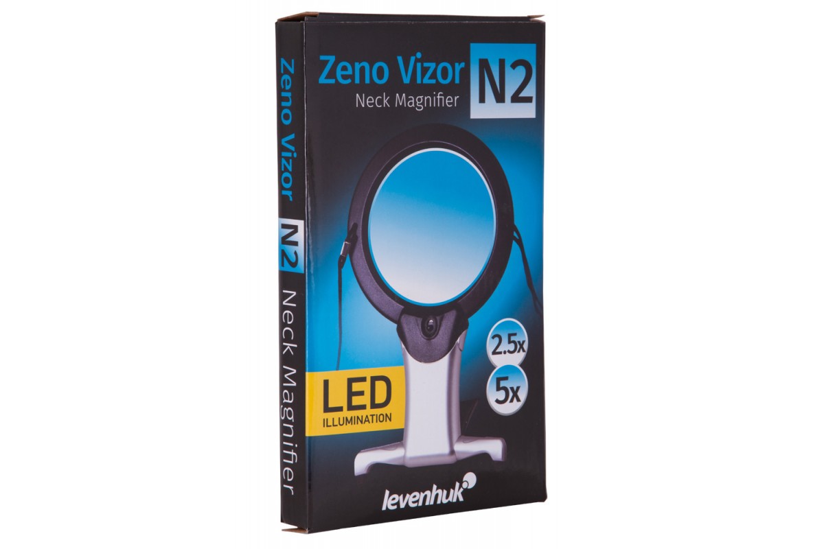 Лупа Levenhuk Zeno Vizor N2 – лупа с бифокальной линзой и встроенной светодиодной подсветкой. Ее можно носить на шее – в комплекте есть шейный ремешок – или же устанавливать на стол – лупа комплектуется специальной подставкой. Подсветка яркая: два светодиода хорошо освещают все пространство под основной линзой и позволяют работать даже без внешнего освещения.