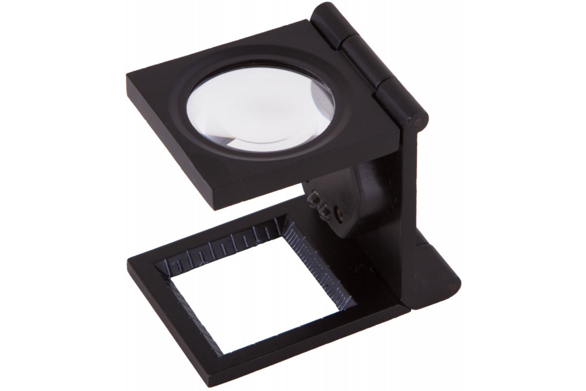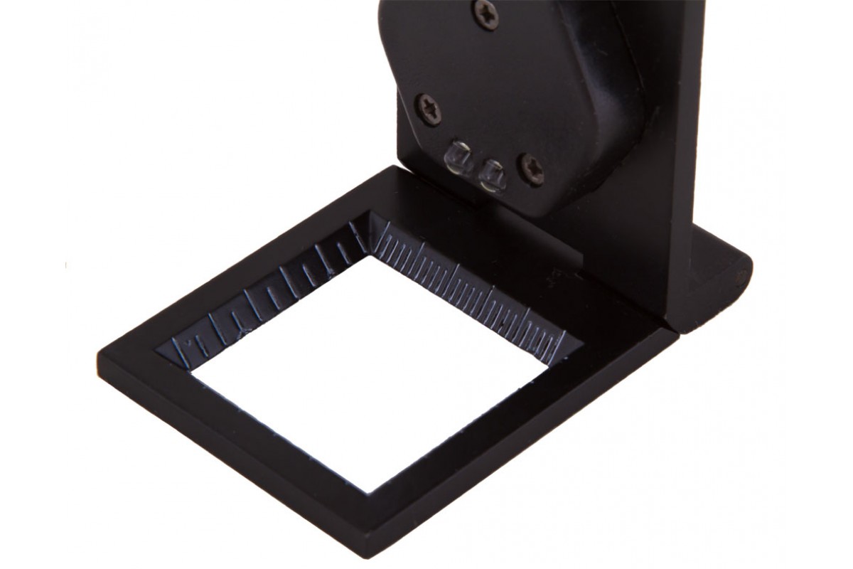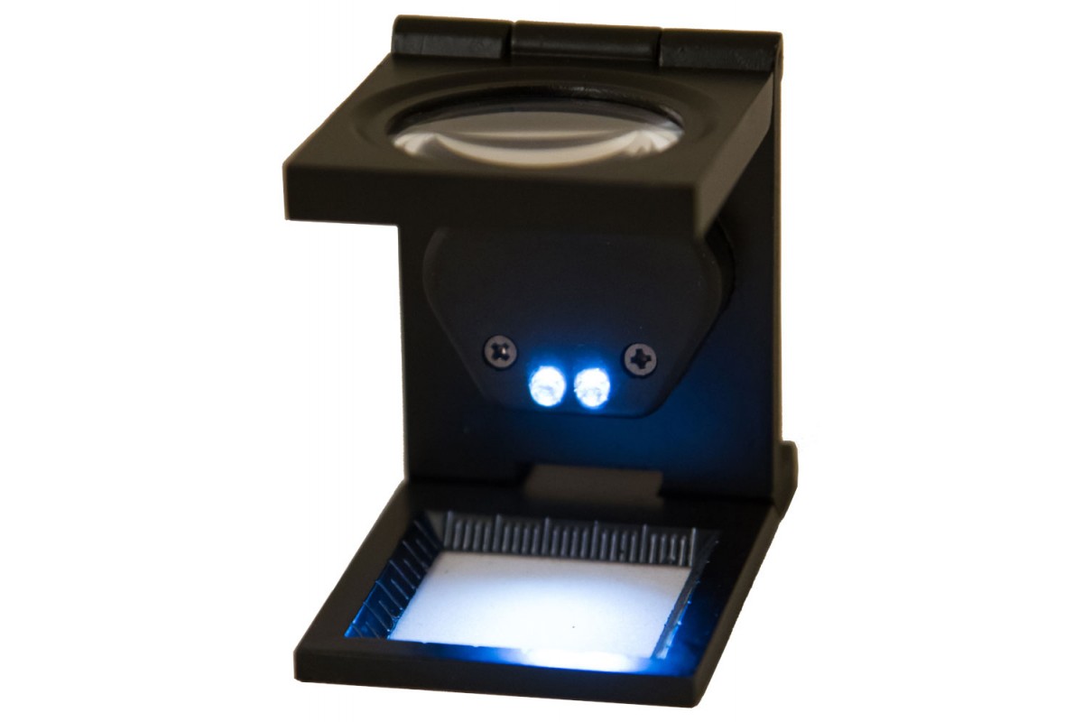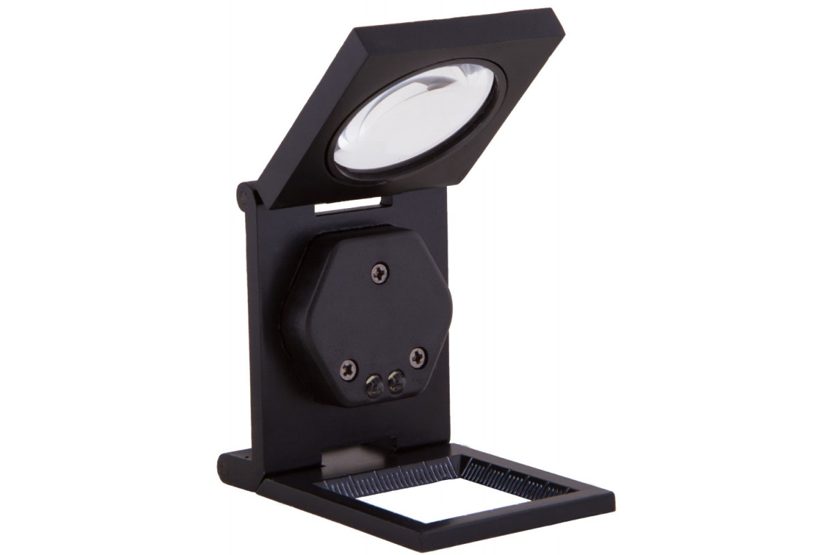 Лупа состоит из металлического штатива и закрепленной на нем стеклянной линзы. Угол наклона линзы можно регулировать. Ее увеличение составляет 6 крат. Пространство под линзой можно осветить при помощи встроенных светодиодов. Они работают от батареек. Яркость подсветки настраивается в широком диапазоне. На основание нанесены измерительные шкалы в сантиметрах и дюймах.