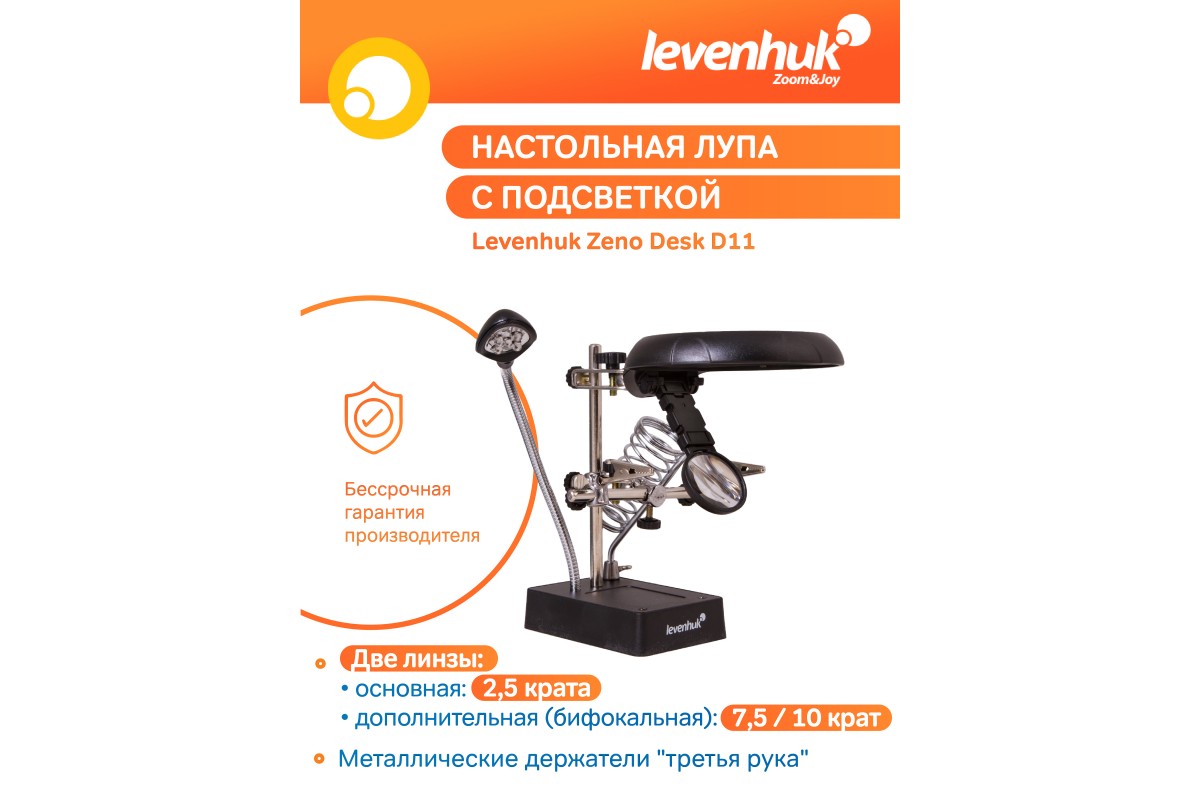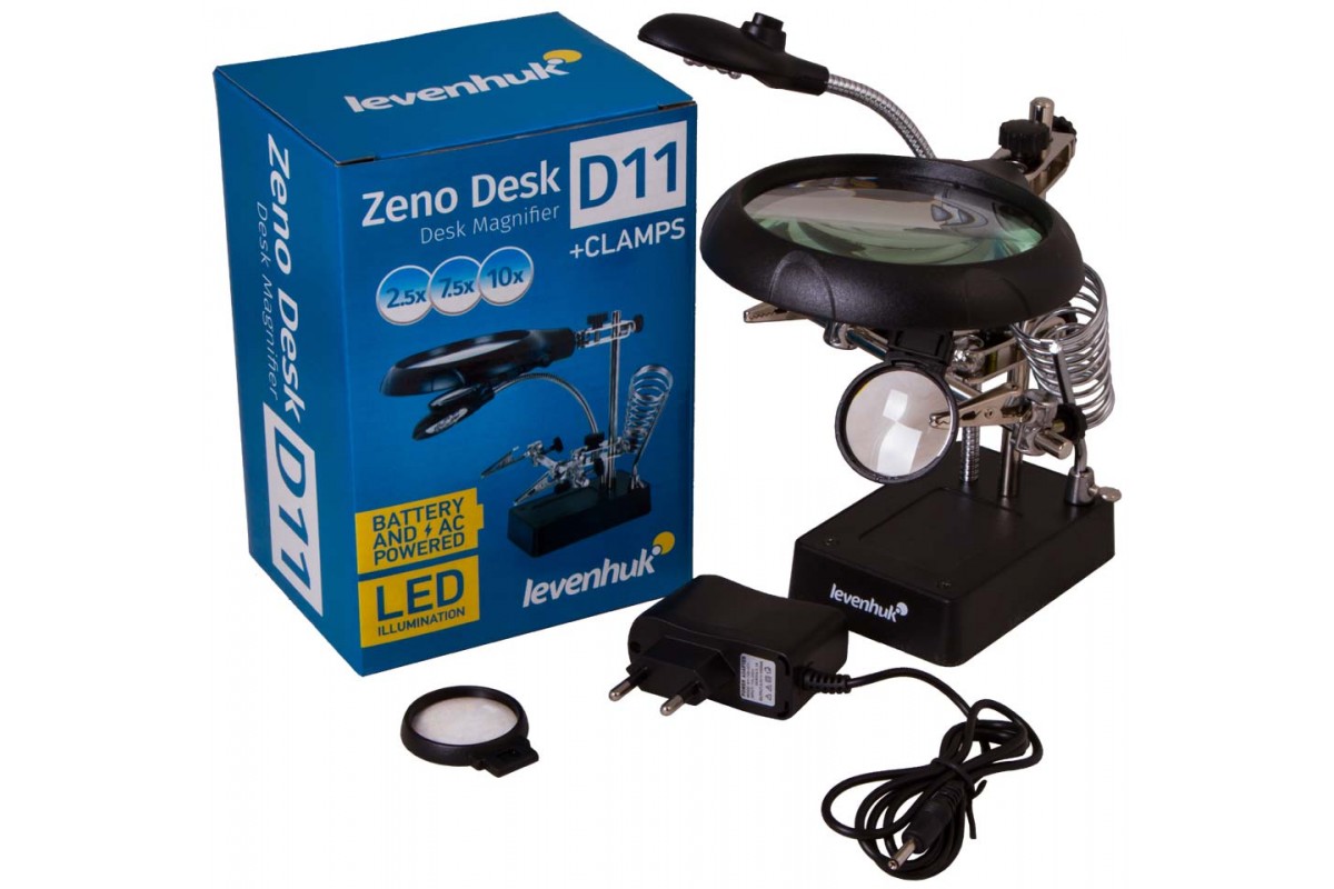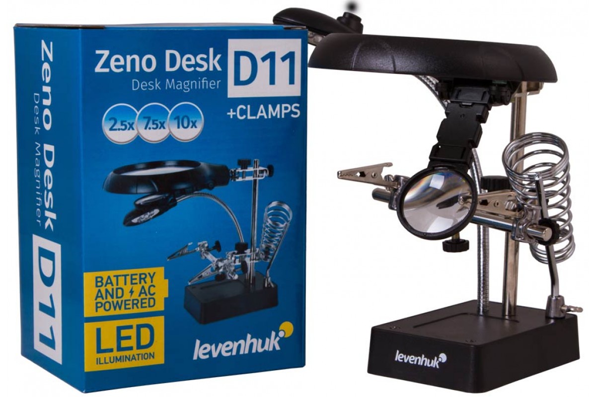 Настольная лупа Levenhuk Zeno Desk D11 – это комбинируемые линзы, светодиодная подсветка на гибком штативе, держатели «третья рука» и крепление для рабочих инструментов. Она пригодится каждому, кто любит работать руками – ювелиру, электротехнику, часовому мастеру, моделисту.