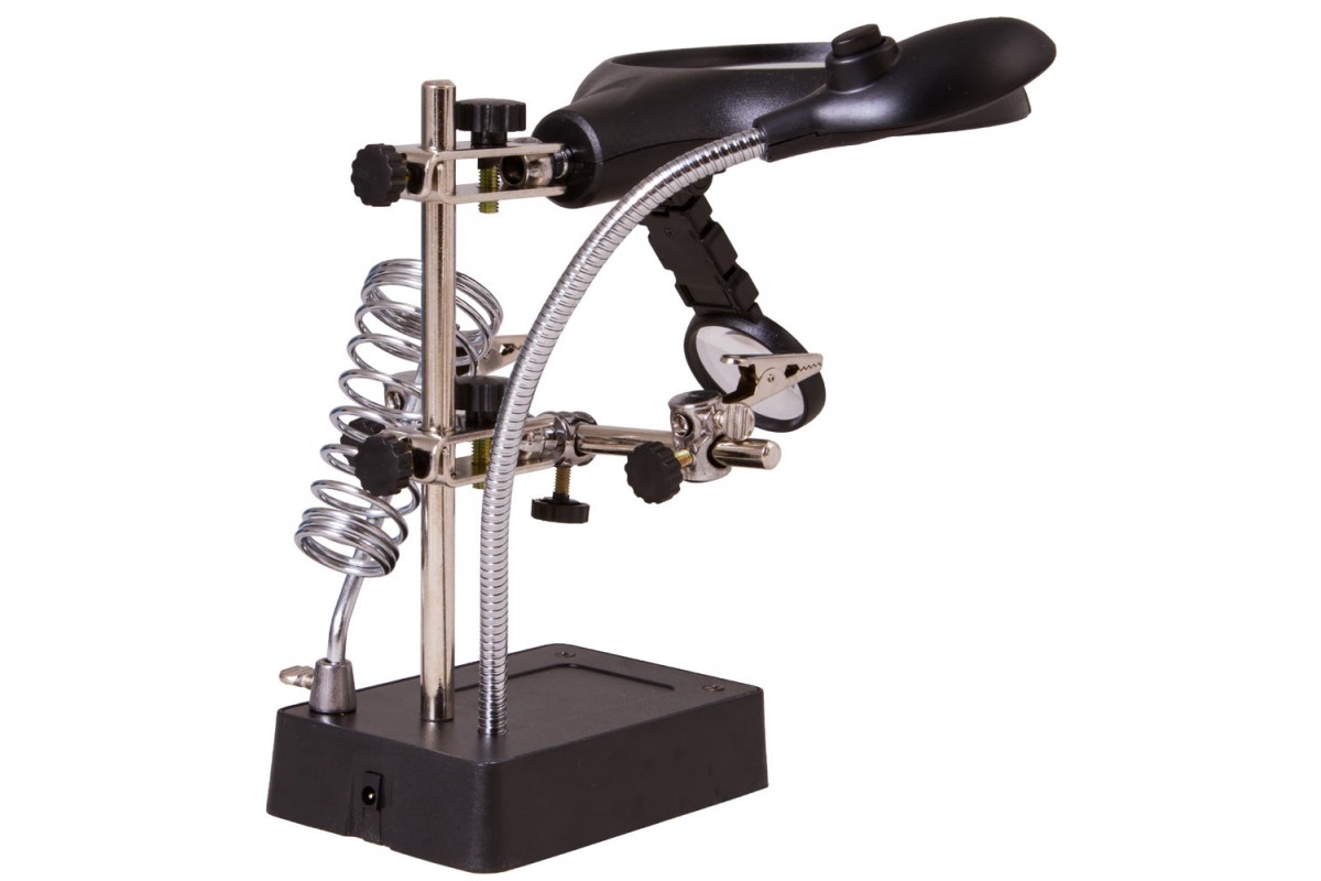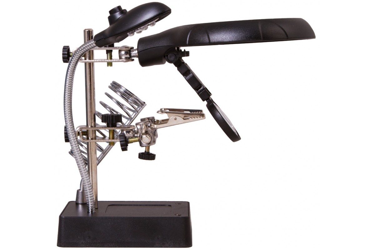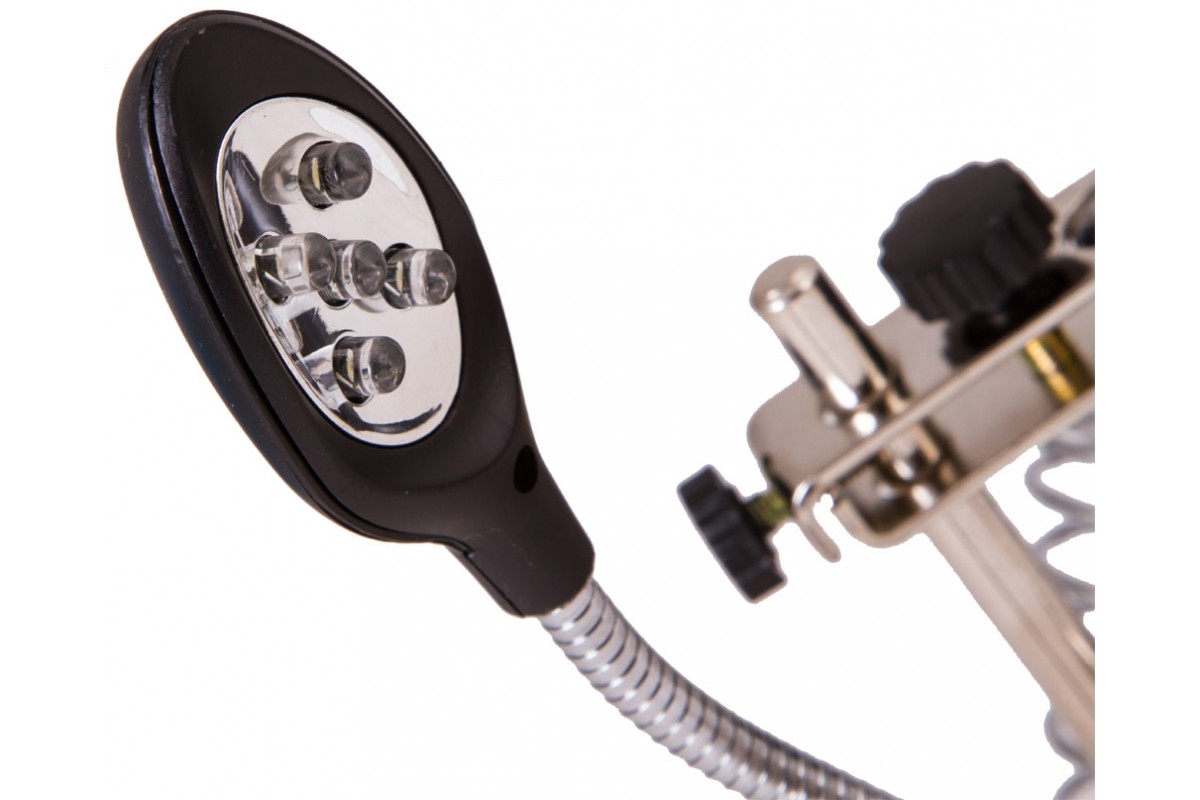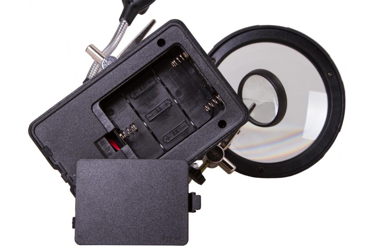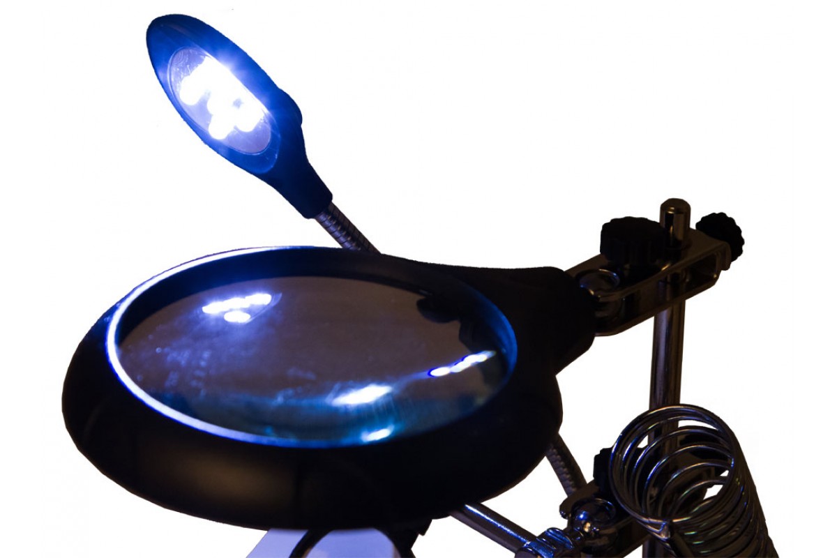Линзы диаметром 90 и 34 мм позволяют приближать предметы до 10 крат. Обе установлены на вертикальный штатив, и расстояние между ними и рабочей поверхностью можно регулировать. Светодиодная подсветка закреплена на гибком держателе – во время работы будет удобно направлять свет в нужную область. Для освещения используются 5 светодиодов белого цвета. Питается подсветка от сети или батареек.
