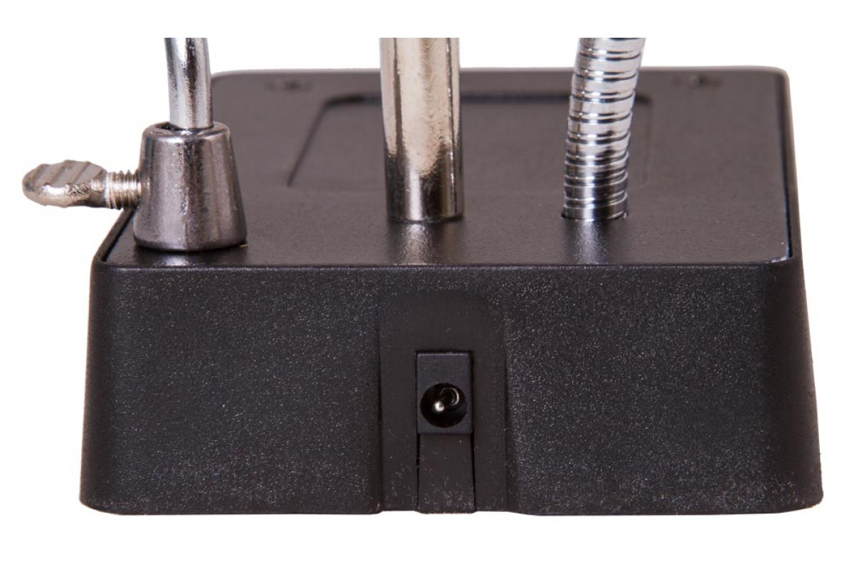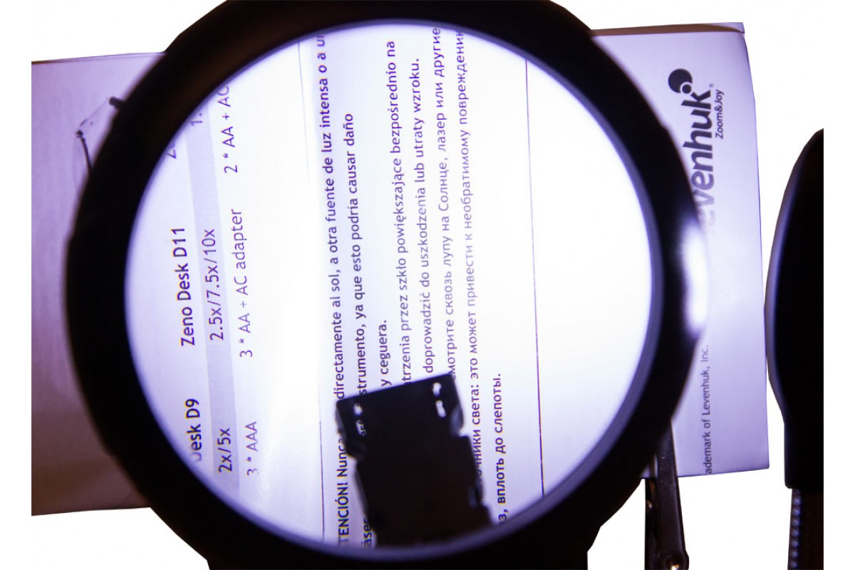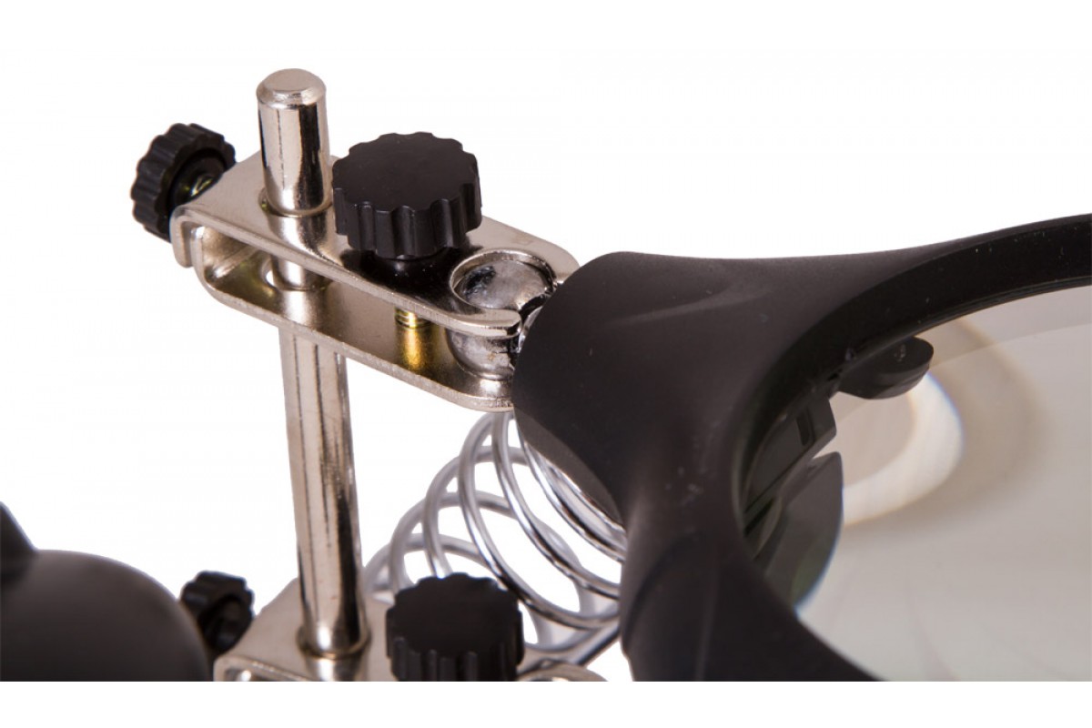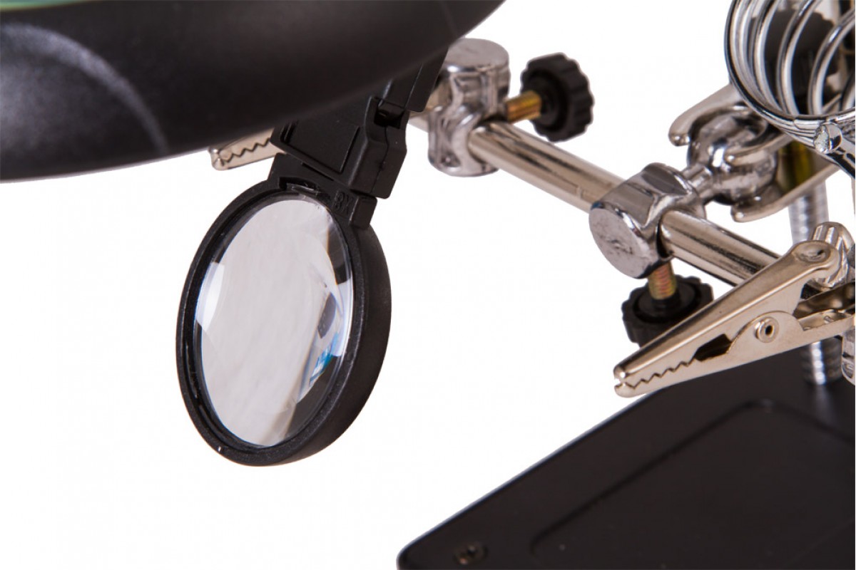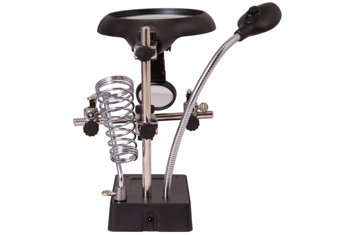 Линзы диаметром 90 и 34 мм позволяют приближать предметы до 10 крат. Обе установлены на вертикальный штатив, и расстояние между ними и рабочей поверхностью можно регулировать. Светодиодная подсветка закреплена на гибком держателе – во время работы будет удобно направлять свет в нужную область. Для освещения используются 5 светодиодов белого цвета. Питается подсветка от сети или батареек.