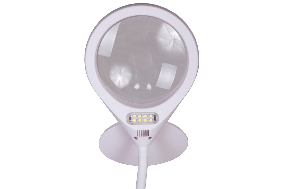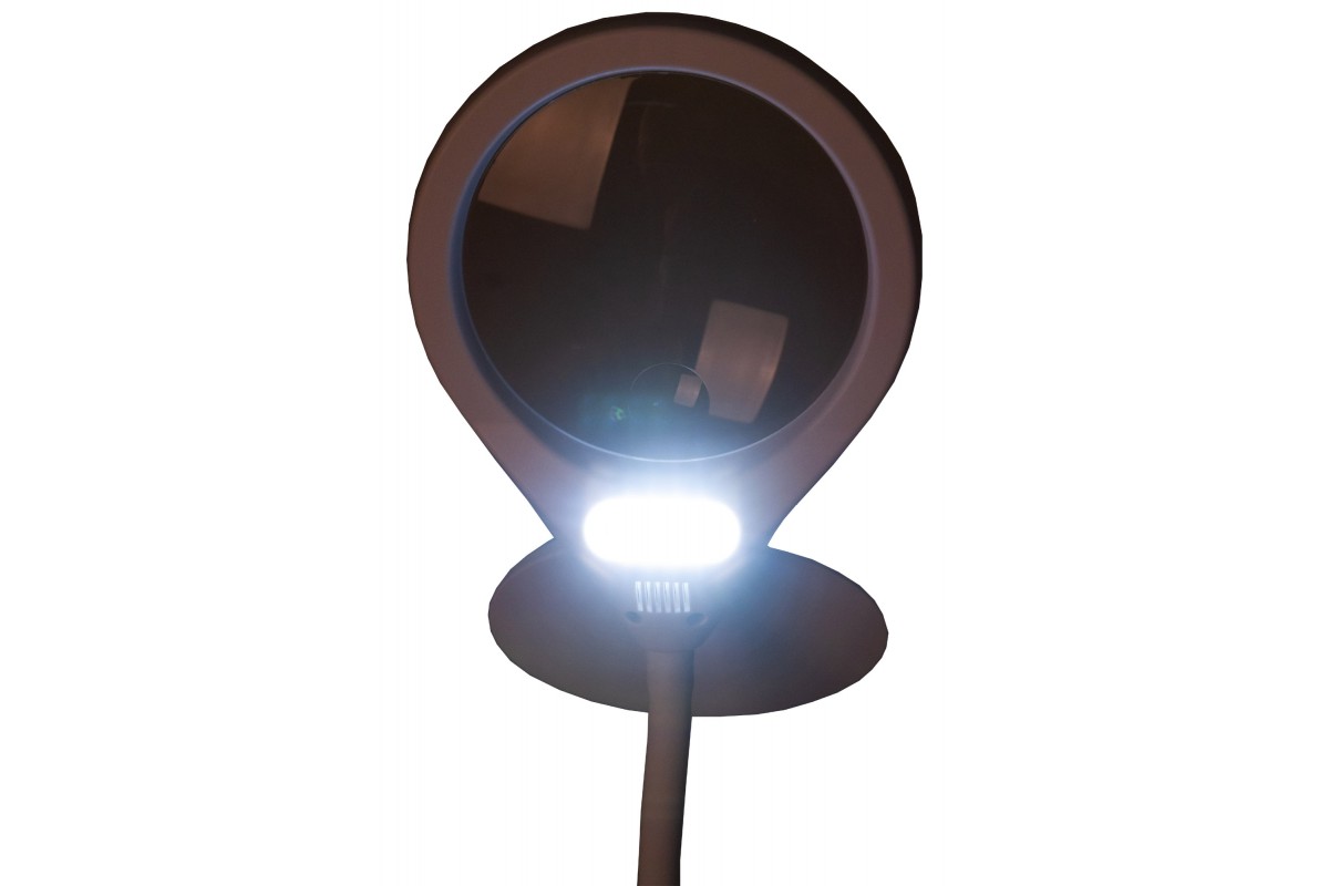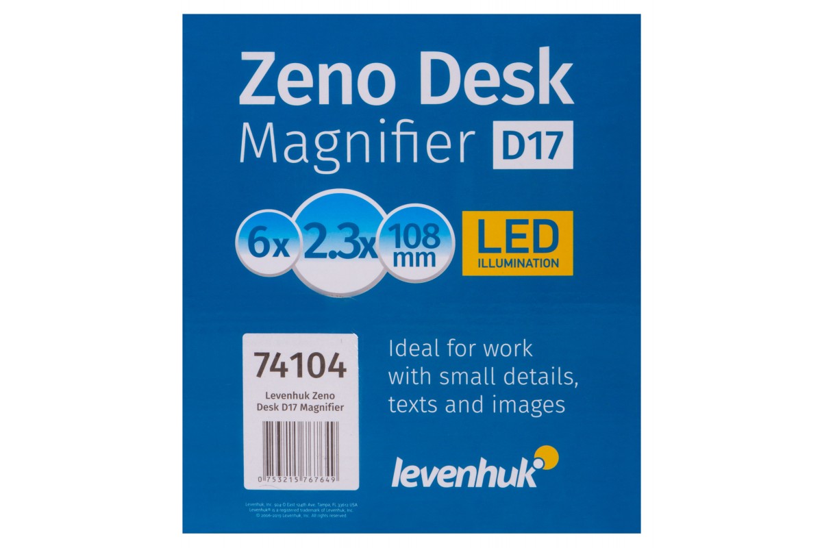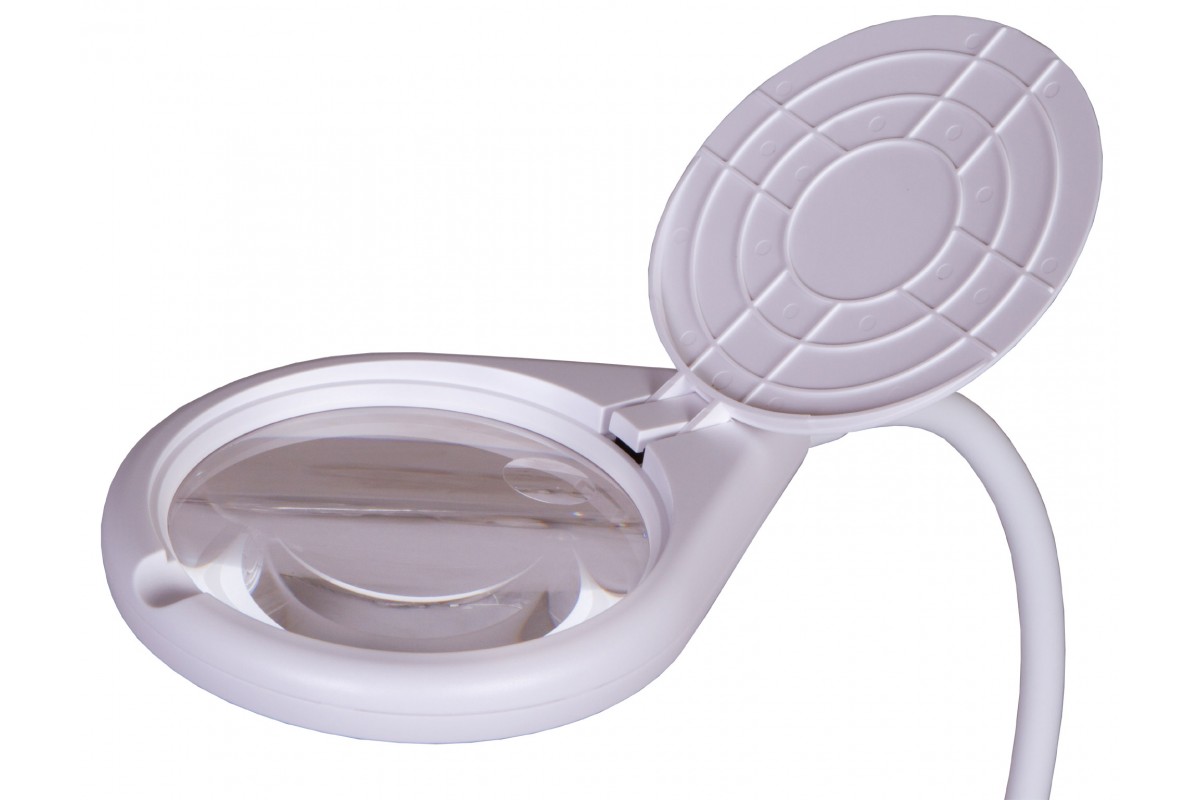 Линз лупы Levenhuk Zeno Desk D17 является бифокальной: на области диаметром 108 мм она дает увеличение в 2,3 крата, на небольшой отдельной области – 6 крат. Чтобы защитить линзу от скопления пыли и механических повреждений, ее можно закрывать откидной крышкой по окончании работ. Блок подсветки включает в себя 8 ярких светодиодов с возможностью регулировки яркости освещения. Для работы подсветки необходимо подключение к сети.