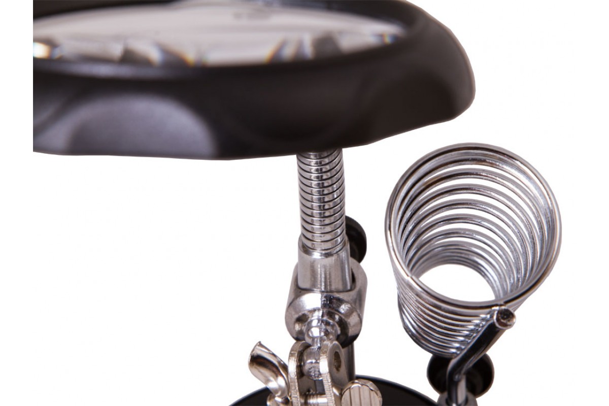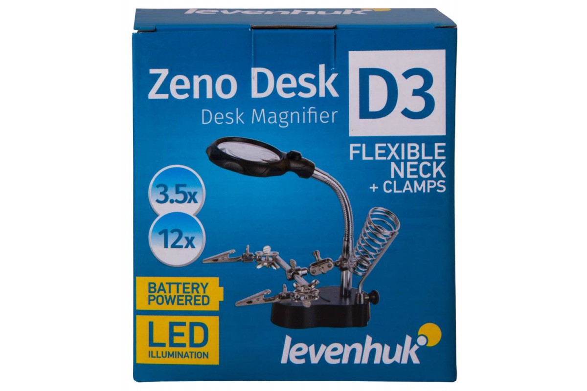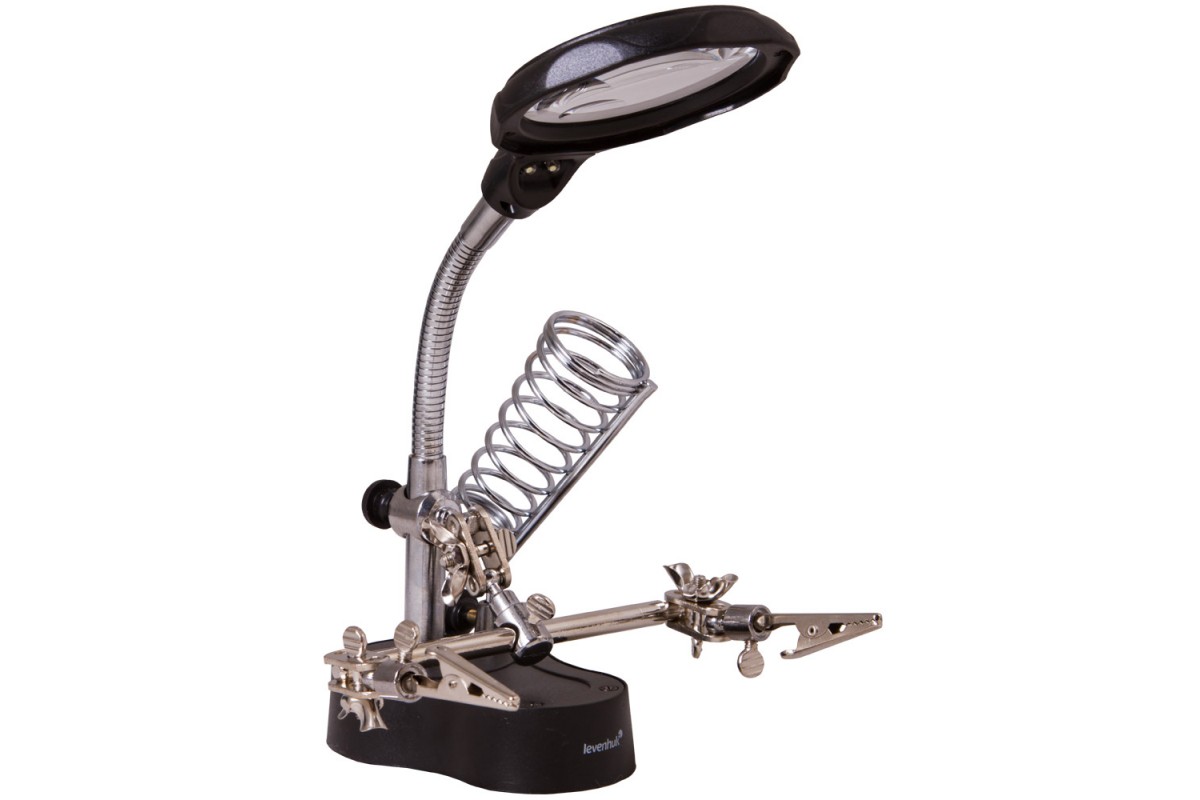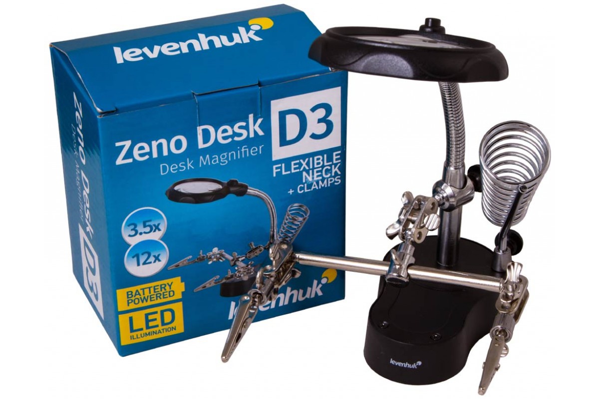 Настольная лупа Levenhuk Zeno Desk D3 состоит из бифокальной линзы, встроенной светодиодной подсветки, гибкого штатива и держателей «третья рука». Эта модель понравится тем, кто занимается ремонтом печатных плат или пайкой. Оценят лупу и любители собирать масштабные модели, мастерить небольшие механизмы или создавать ювелирные изделия.