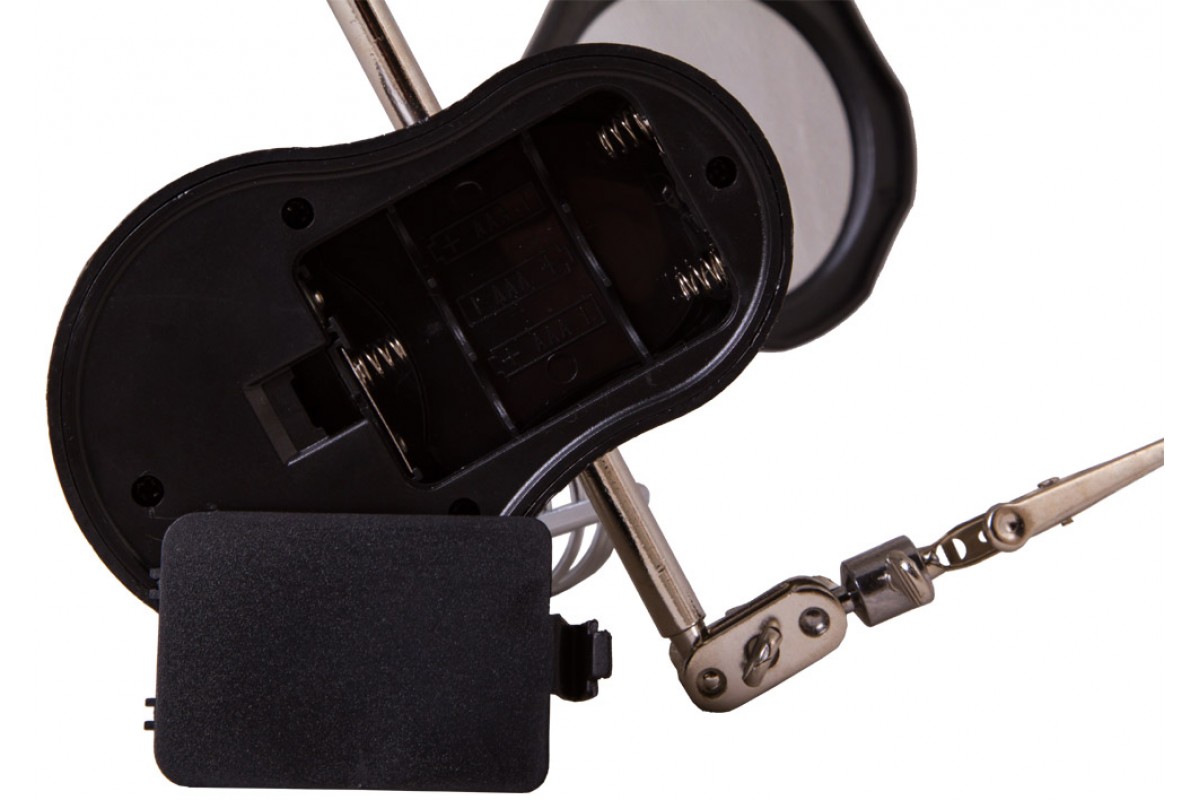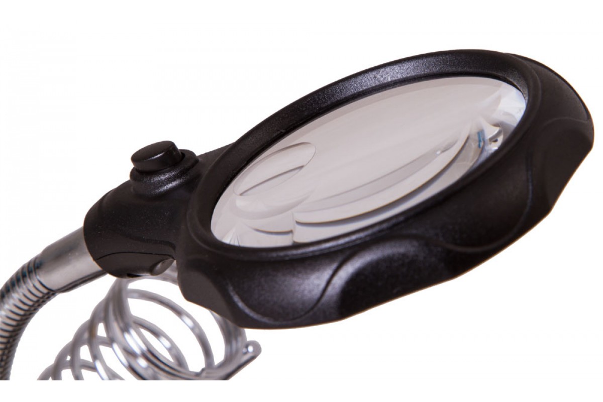 Линза из оптического пластика дает два фиксированных увеличения: 3,5 и 12 крат. Она закреплена на гибком штативе. Встроенная подсветка состоит из двух ярких светодиодов, расположенных рядом с линзой. Все держатели съемные.