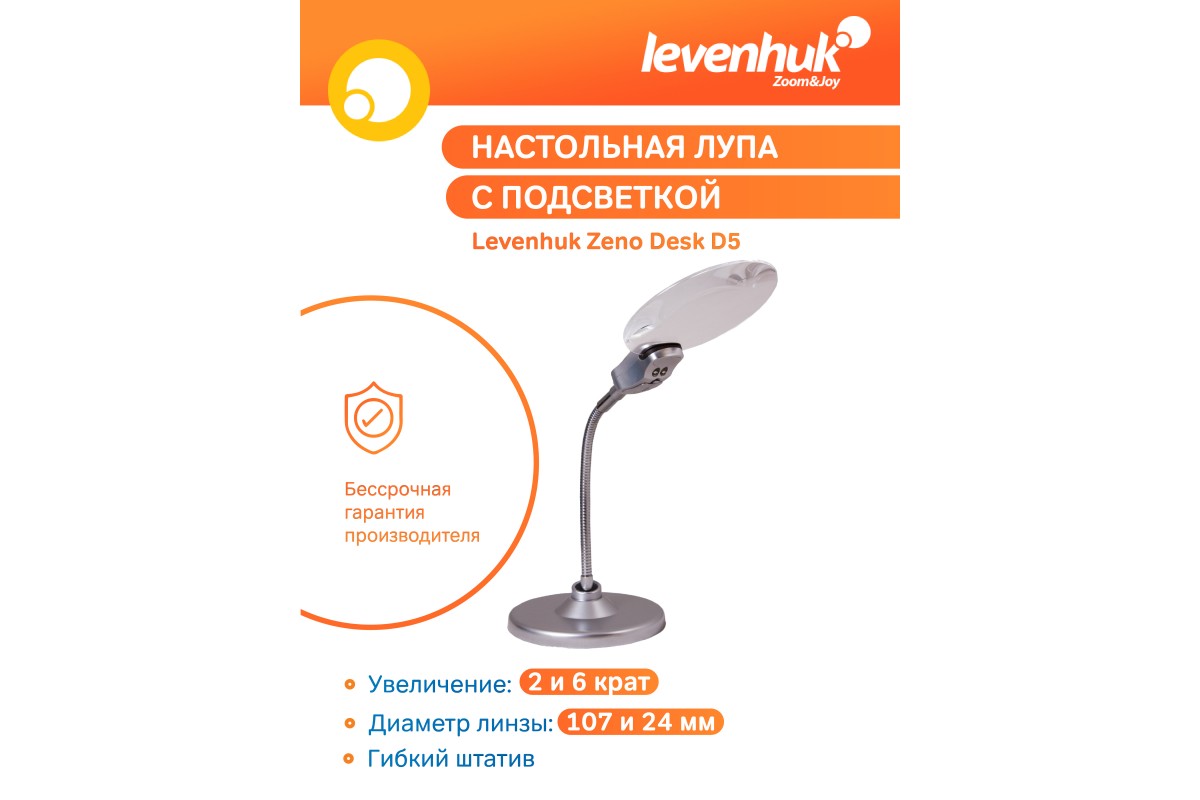 Levenhuk Zeno Desk D5 – небольшая настольная лупа для чтения, рукоделия, занятий творчеством, моделирования и выполнения несложных ремонтных и ювелирных работ. Встроенная подсветка позволяет использовать лупу даже в полной темноте.