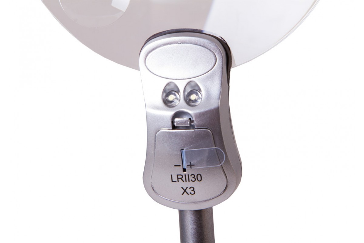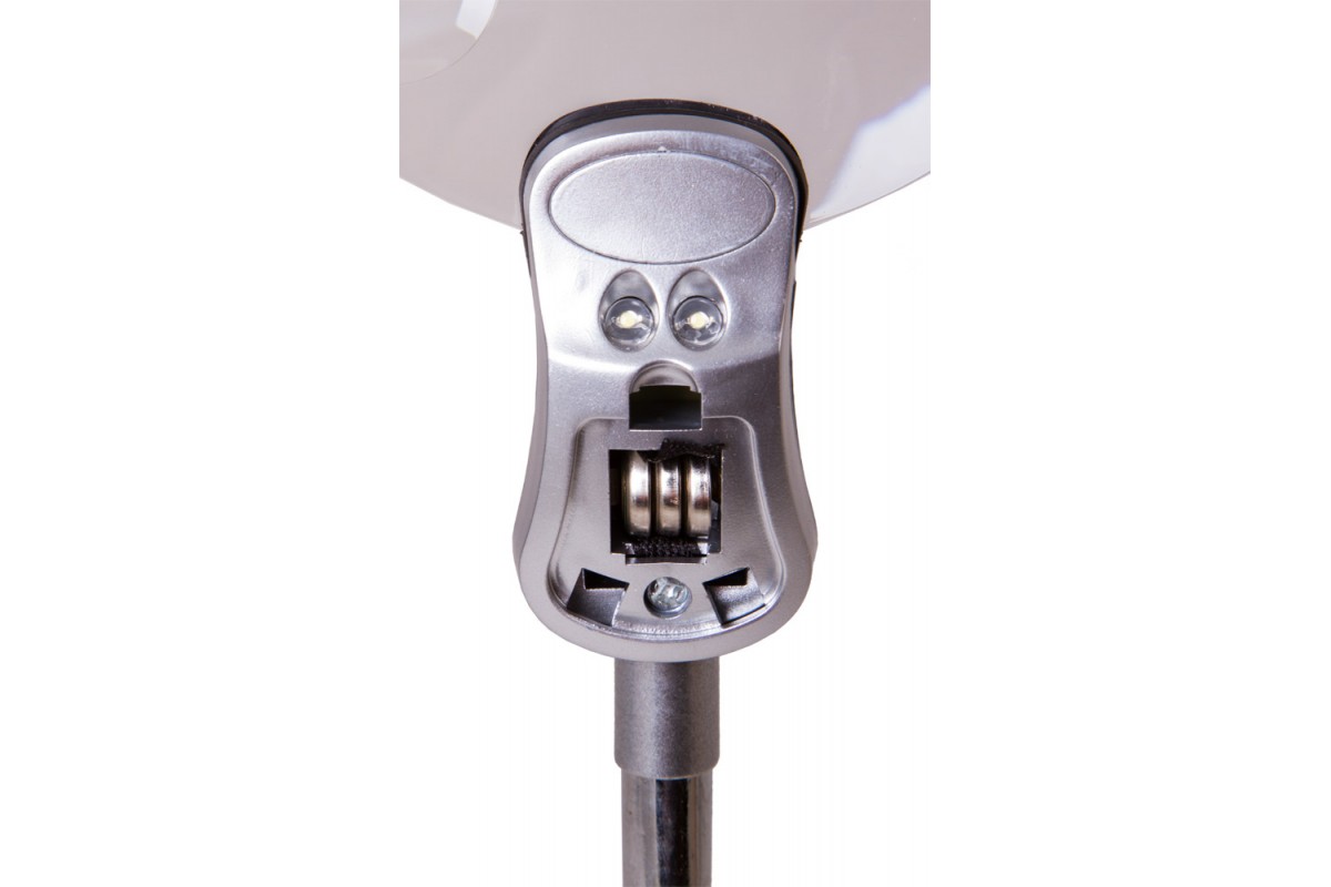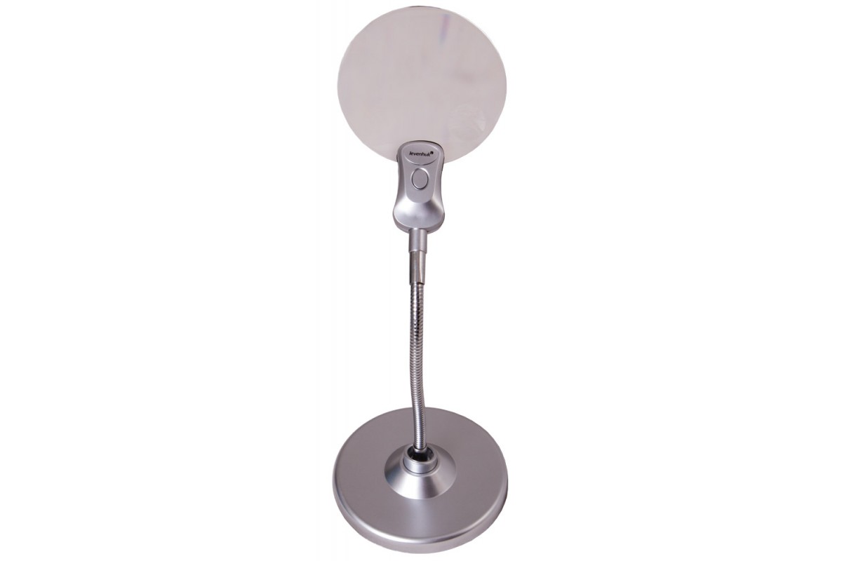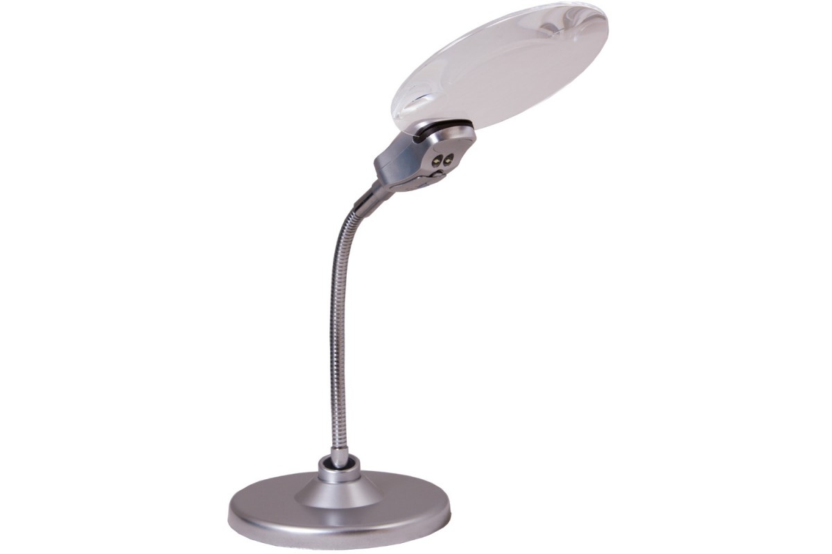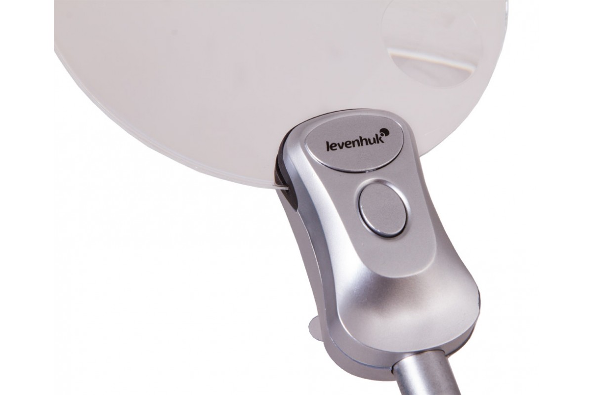 Levenhuk Zeno Desk D5 состоит из бифокальной линзы и гибкого металлического штатива. Покоится конструкция на устойчивом круглом основании. Две светодиодные лампочки ярко и равномерно освещают все пространство под линзой. Включить подсветку можно при помощи кнопки в верхней части корпуса.