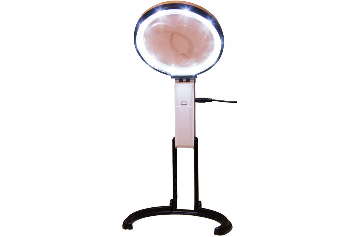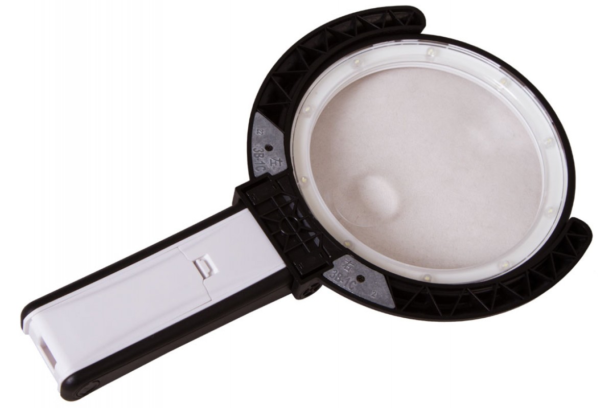 Бифокальная линза дает два увеличения – 2 и 5 крат. По ее периметру расположены 10 ярких светодиодов. Они равномерно освещают рабочее пространство, не создавая лишних теней. Работает подсветка от батареек или сети переменного тока.