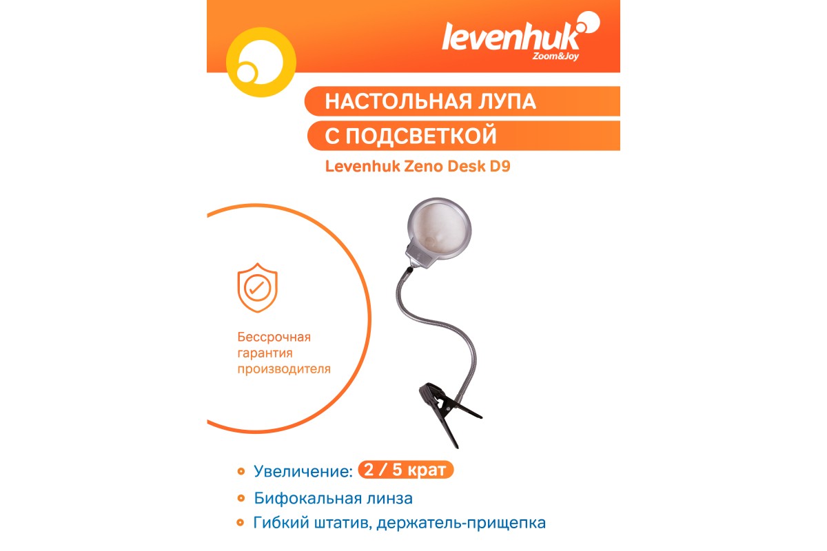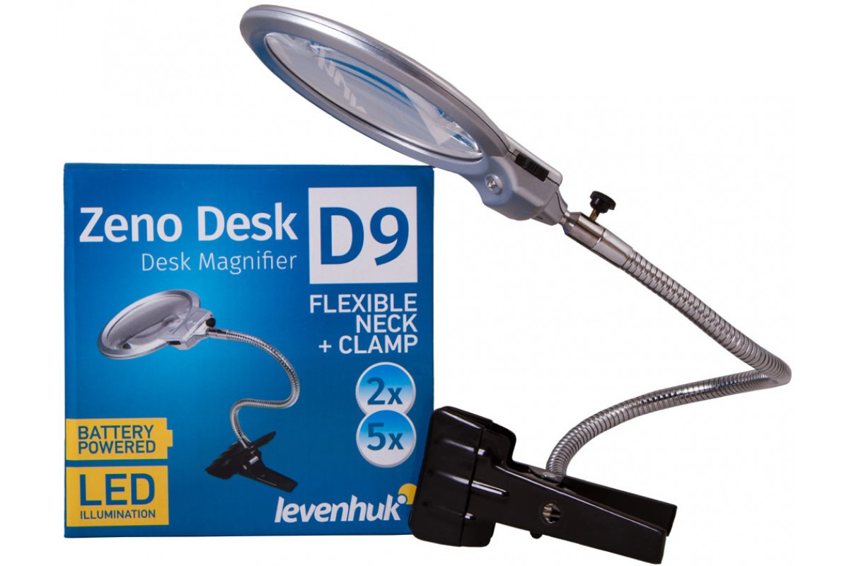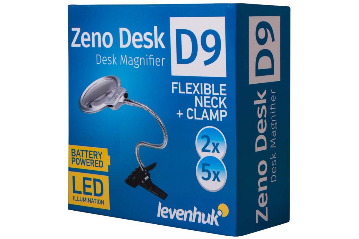 Levenhuk Zeno Desk D9 – бифокальная лупа для чтения, работы с мелкими предметами, моделирования, ремонта механизмов и ювелирных изделий. Она пригодится на работе и дома. Лупа снабжена встроенной подсветкой и гибким штативом. К поверхности лупа крепится при помощи держателя-прищепки.