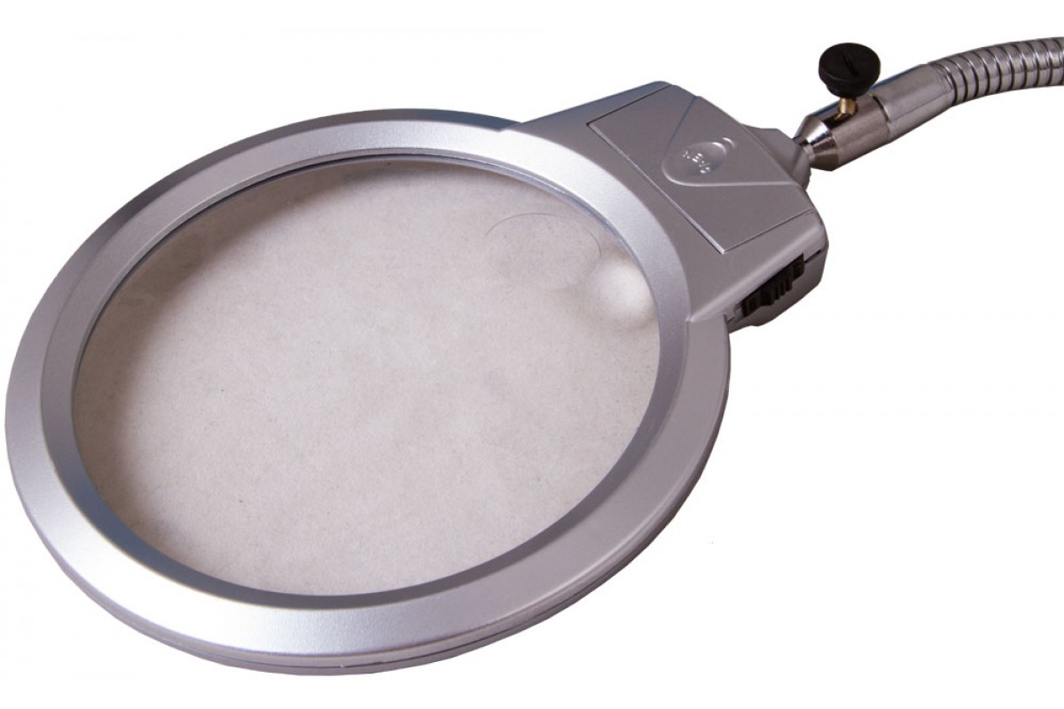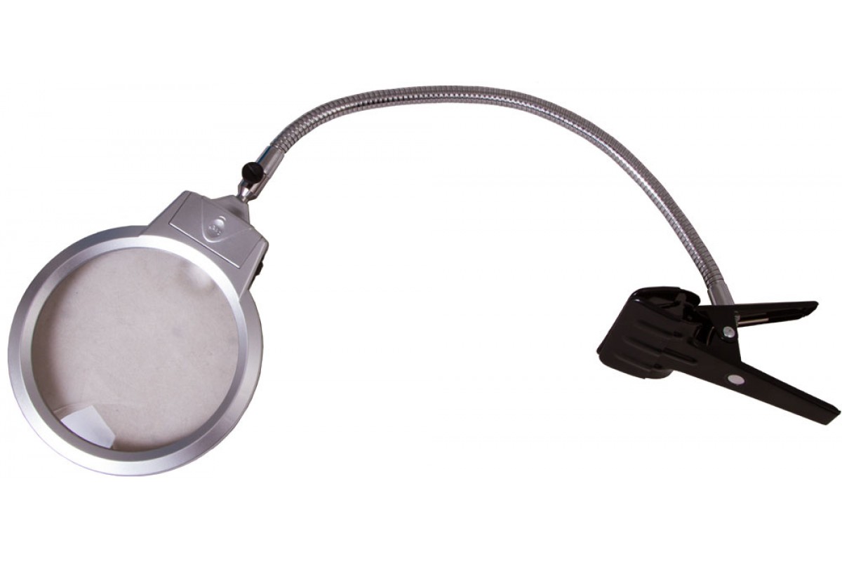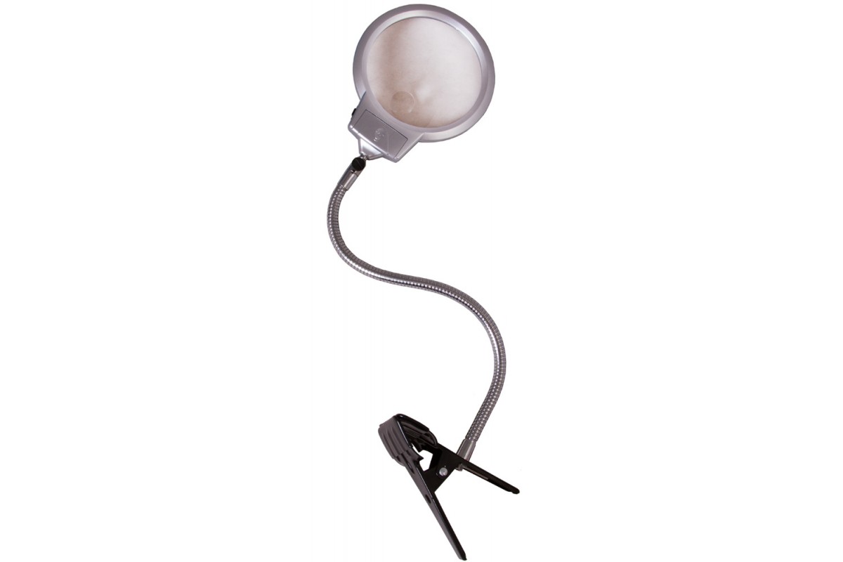 Линза дает два фиксированных увеличения: 2 и 5 крат. В ее основании установлены два светодиода для создания яркого и ровного освещения над всей рабочей областью. Гибкий штатив позволяет легко изменять положение линзы на максимально удобное для наблюдений. При помощи держателя-прищепки лупа фиксируется практически на любой поверхности – столе, полке, дверце шкафа.