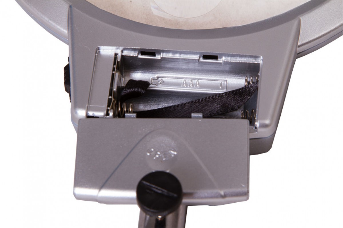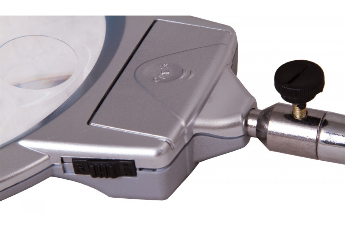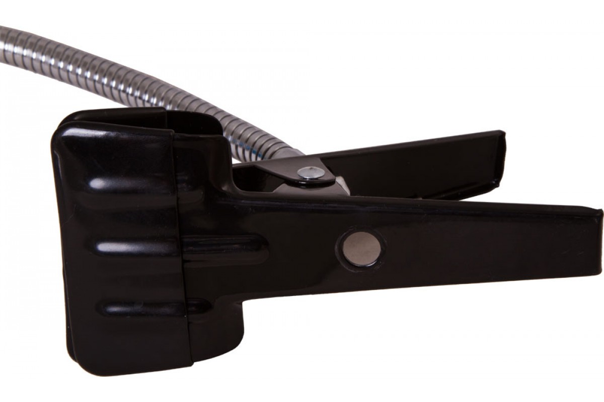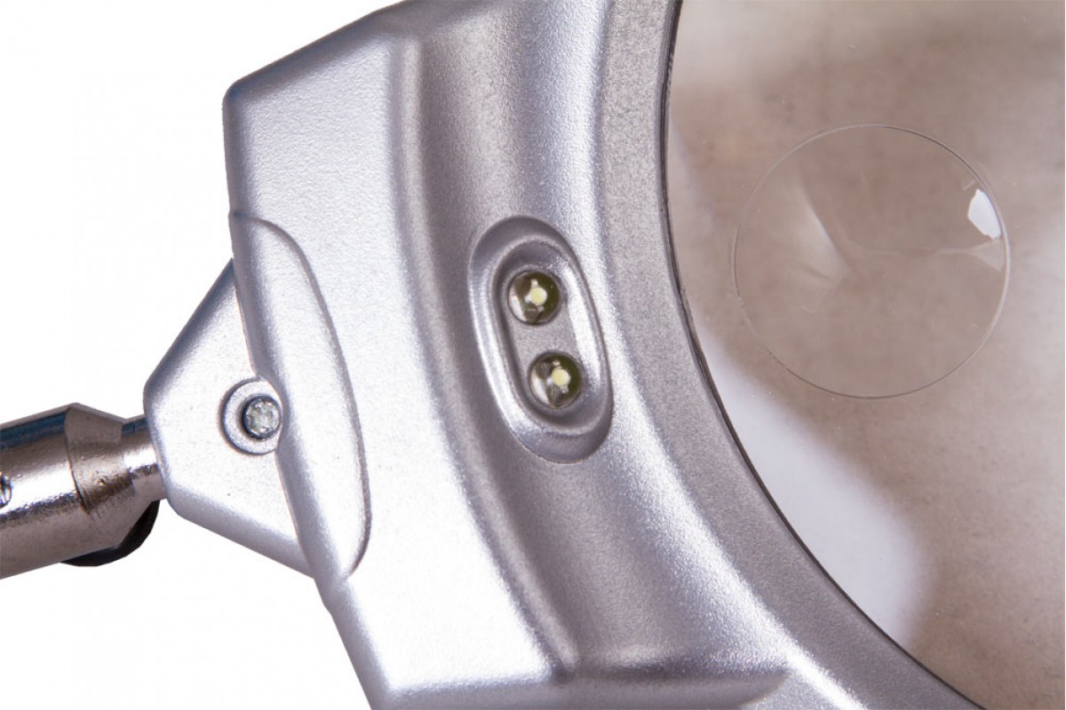Линза дает два фиксированных увеличения: 2 и 5 крат. В ее основании установлены два светодиода для создания яркого и ровного освещения над всей рабочей областью. Гибкий штатив позволяет легко изменять положение линзы на максимально удобное для наблюдений. При помощи держателя-прищепки лупа фиксируется практически на любой поверхности – столе, полке, дверце шкафа.