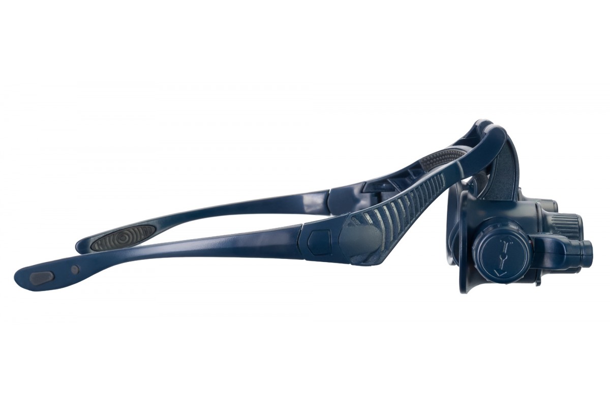 Светодиоды подсветки находятся рядом с линзами, угол наклона можно регулировать, питание – батарейки. В качестве крепления на голову можно выбрать одно из двух, входящих в комплект: текстильное с регулировкой длины или очковую оправу.