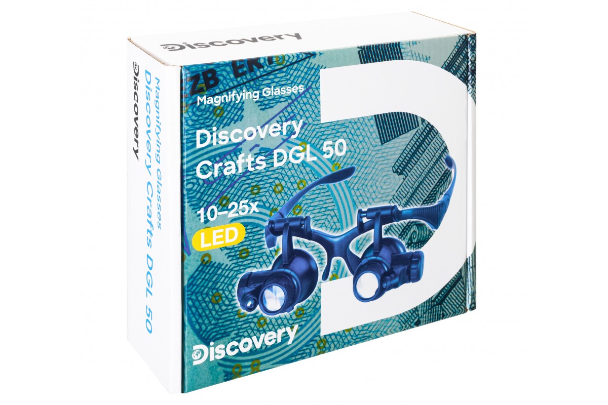 Levenhuk Discovery Crafts DGL 50 – это лупа-очки с парными комплектами сменных линз. Она дает возможность изучать мелкие объекты на увеличении от 10 до 25 крат (с шагом в 5 крат). Имеет подсветку, поэтому может использоваться в помещениях со слабой освещенностью и даже ночью. Эта лупа отлично подойдет для работы часового мастера, ювелира или реставратора, а также для технического хобби.