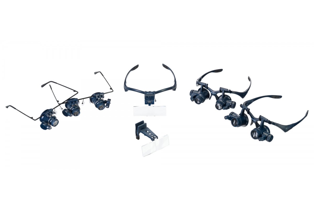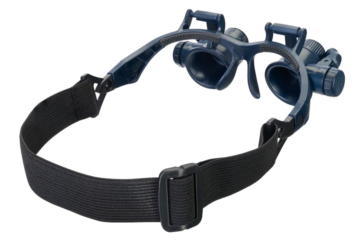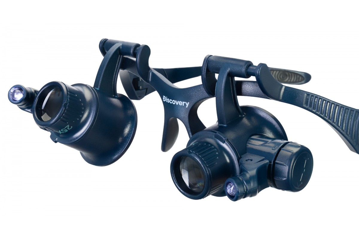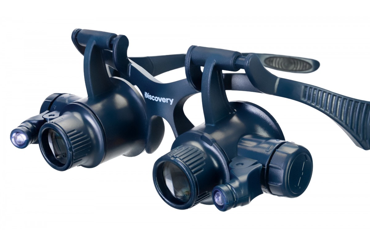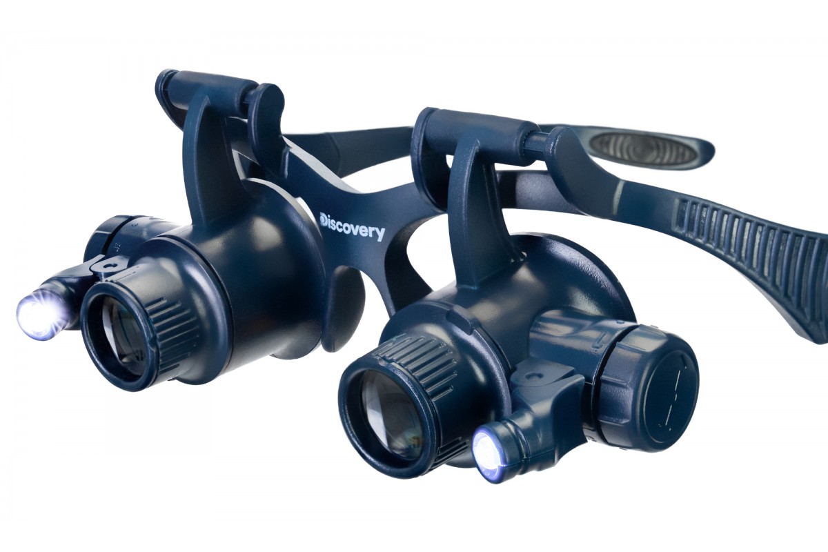 Рядом с линзами находятся светодиодные подсветки. Их угол наклона можно регулировать, что позволяет настраивать освещение максимально удобно для работы. Подсветка работает от батареек. Также в комплект включены 2 крепления на голову: очковая оправа и текстильное с регулировкой длины.