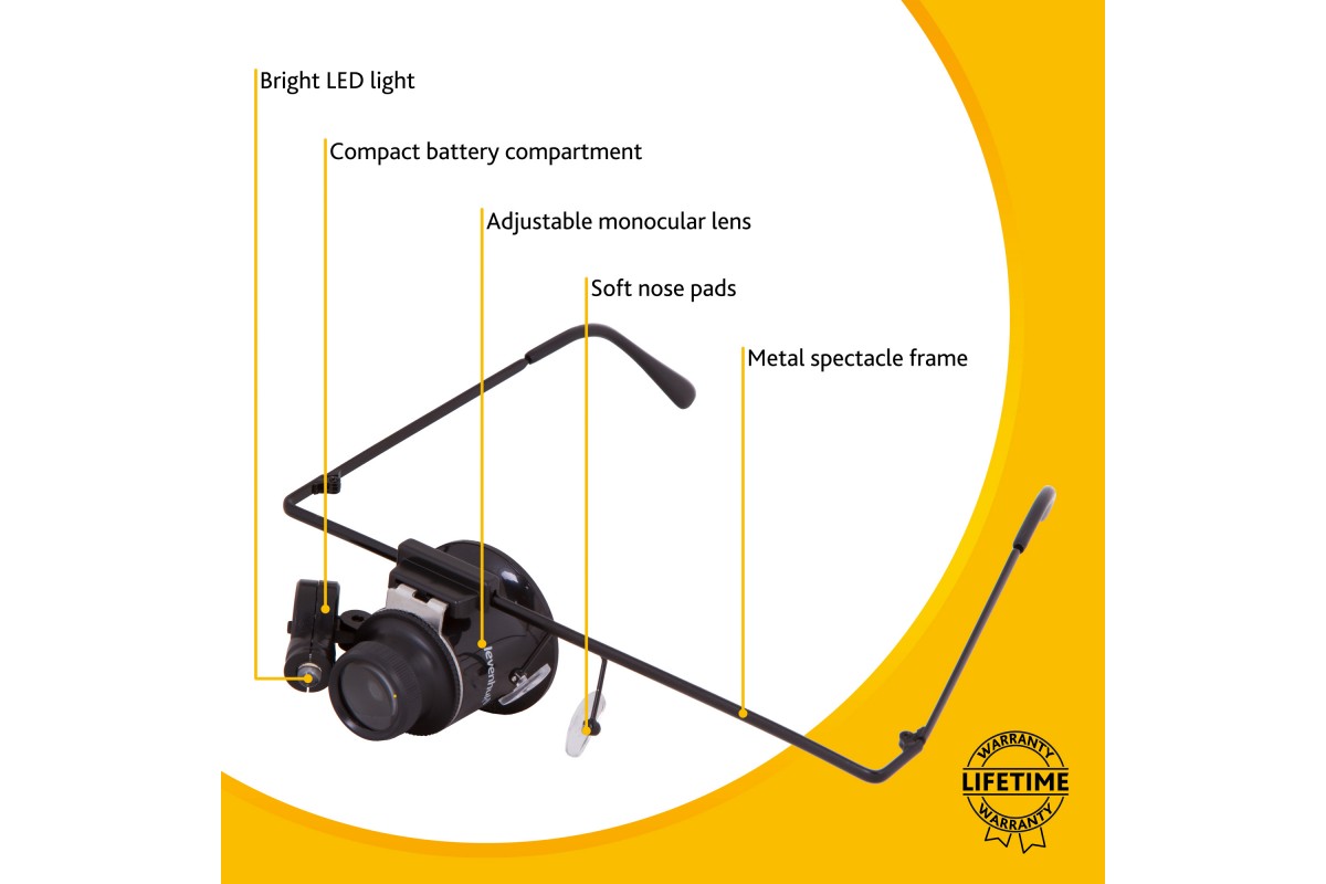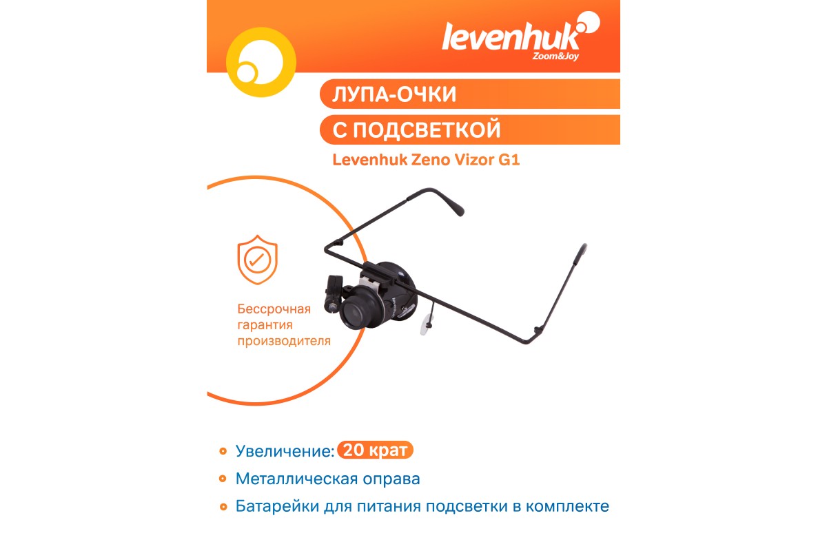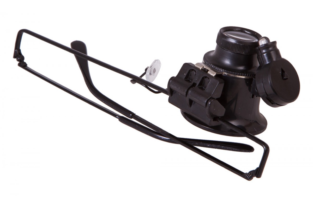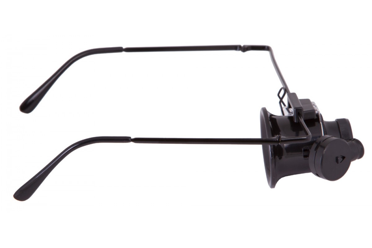 Лупа Levenhuk Zeno Vizor G1 – это лупа на очковой оправе, которая надевается как обычные очки. Линзу с 20-кратным увеличением легко передвигать по оправе влево или вправо или даже убрать в сторону, если возникнет такая необходимость. Рядом с линзой есть небольшая светодиодная подсветка. При плохом освещении ее яркости хватит, чтобы хорошо осветить всю рабочую площадь.