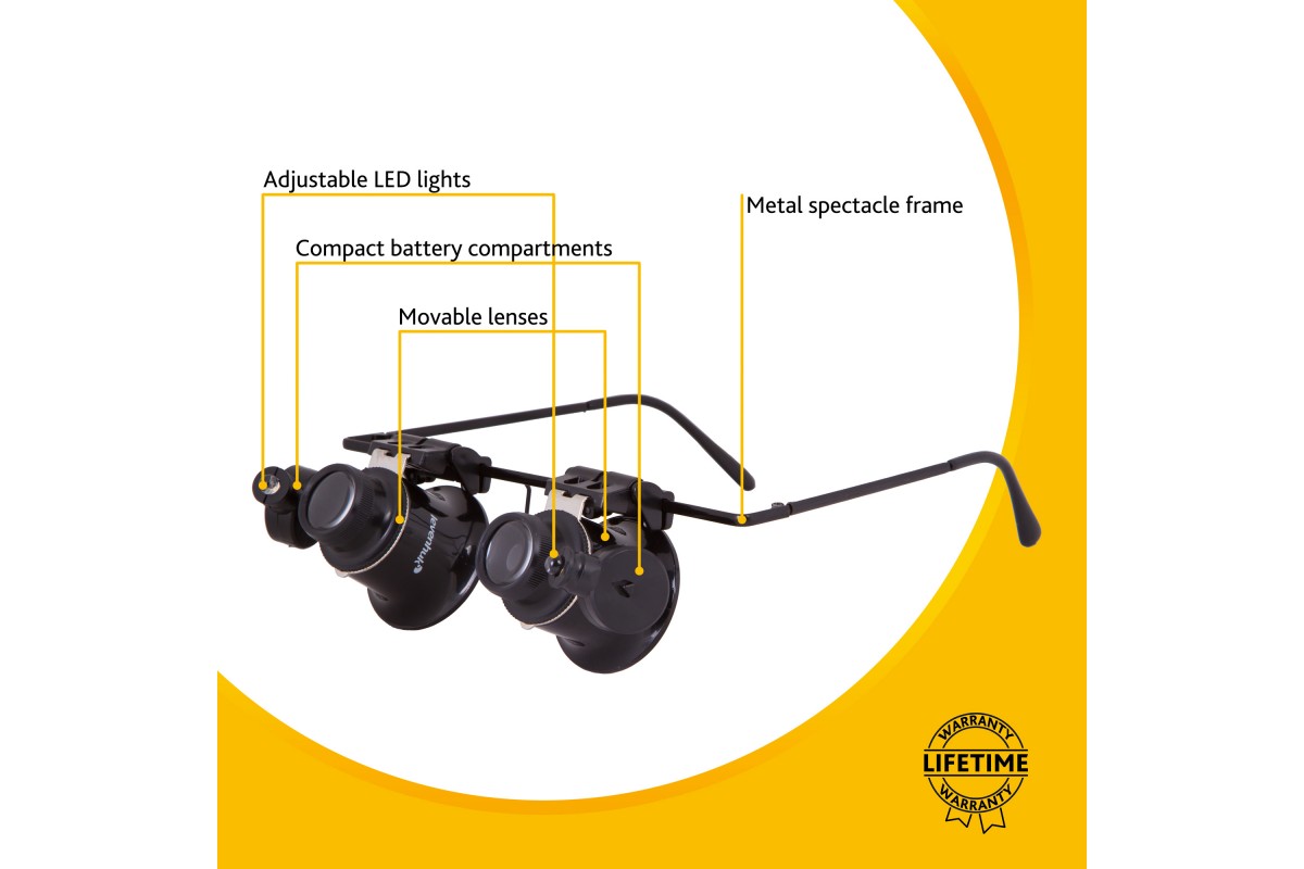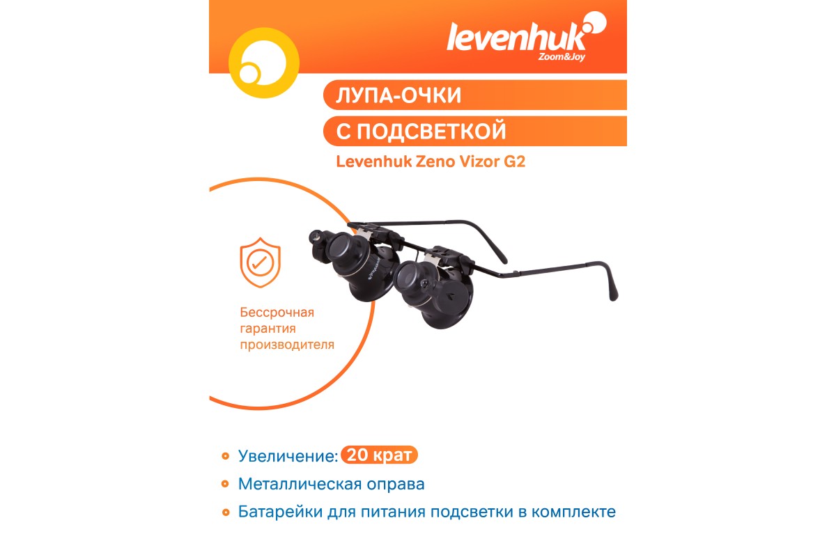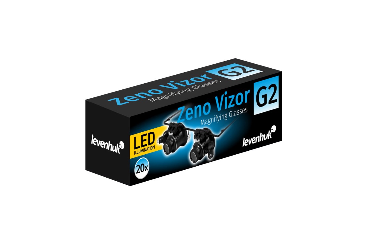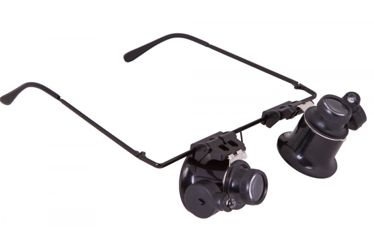 Лупа-очки Levenhuk Zeno Vizor G2 – 20-кратная лупа на очковой оправе с парой независимых линз. Линзы можно перемещать по оправе, точно регулируя расстояние между ними. Есть возможность откинуть линзы, если требуется смотреть без увеличения.