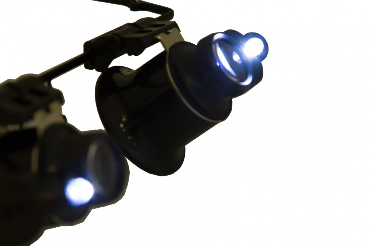 Лупа-очки Levenhuk Zeno Vizor G2 имеет встроенную светодиодную подсветку. Она яркая и охватывает большую площадь. Даже при плохом внешнем освещении вы сможете продолжать работу. Батарейки для работы подсветки входят в комплект.
