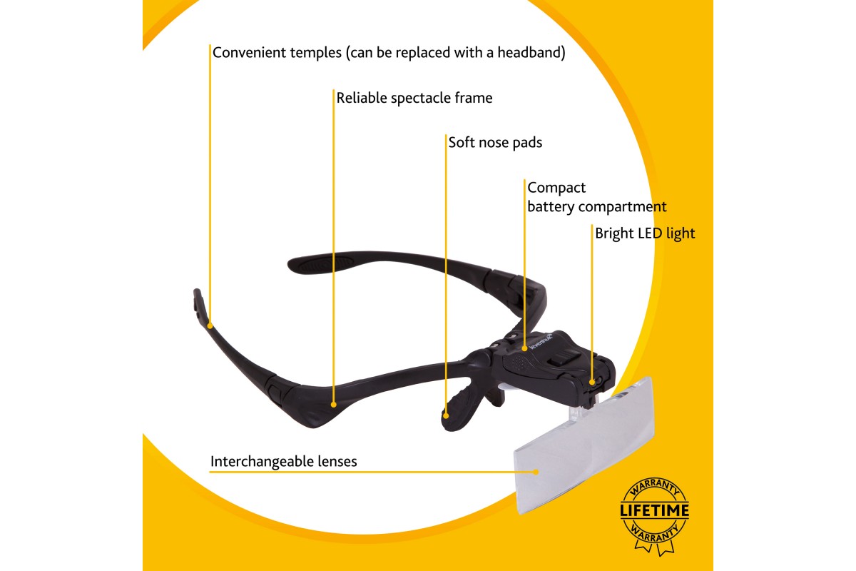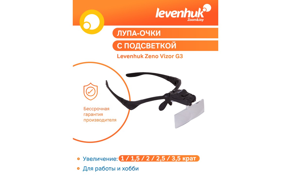 Лупа-очки Levenhuk Zeno Vizor G3 станет хорошим выбором для работы и домашнего использования. С ней одинаково удобно работать с электрическими платами и вышивать, изучать ювелирные изделия и читать, собирать масштабные модели и ремонтировать часовые механизмы.